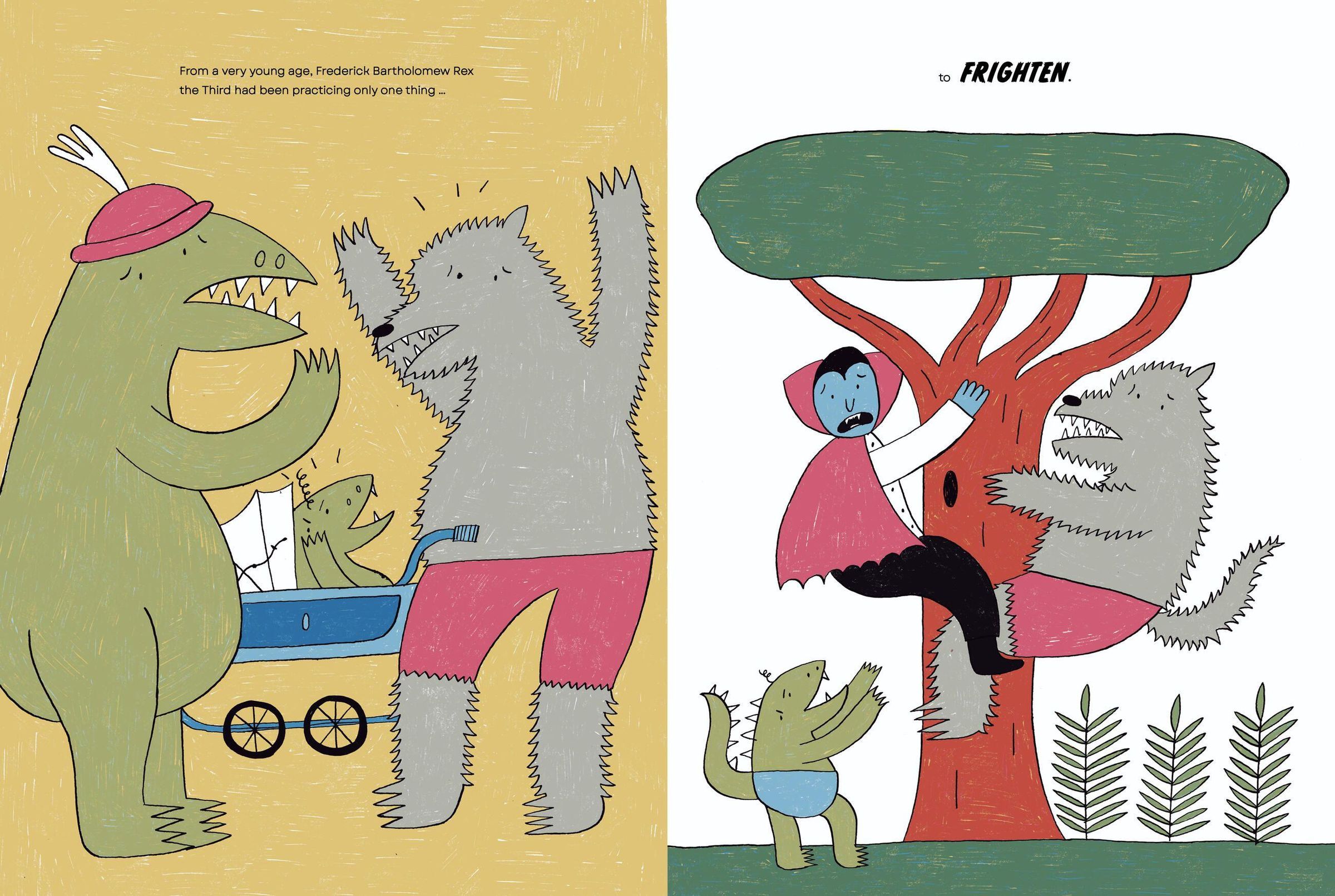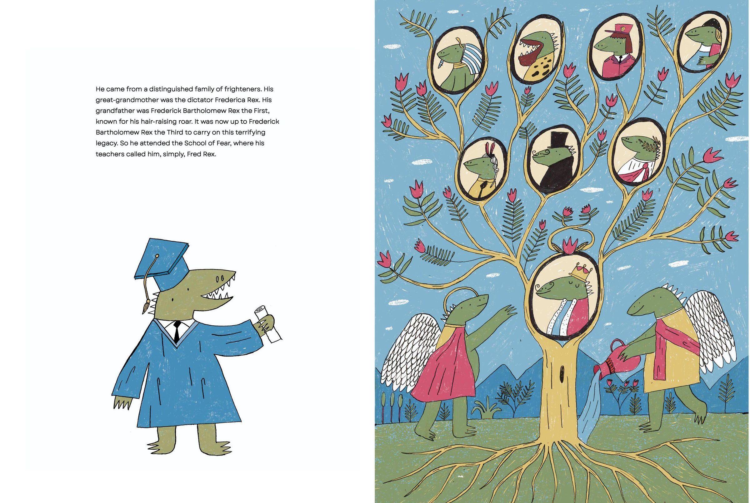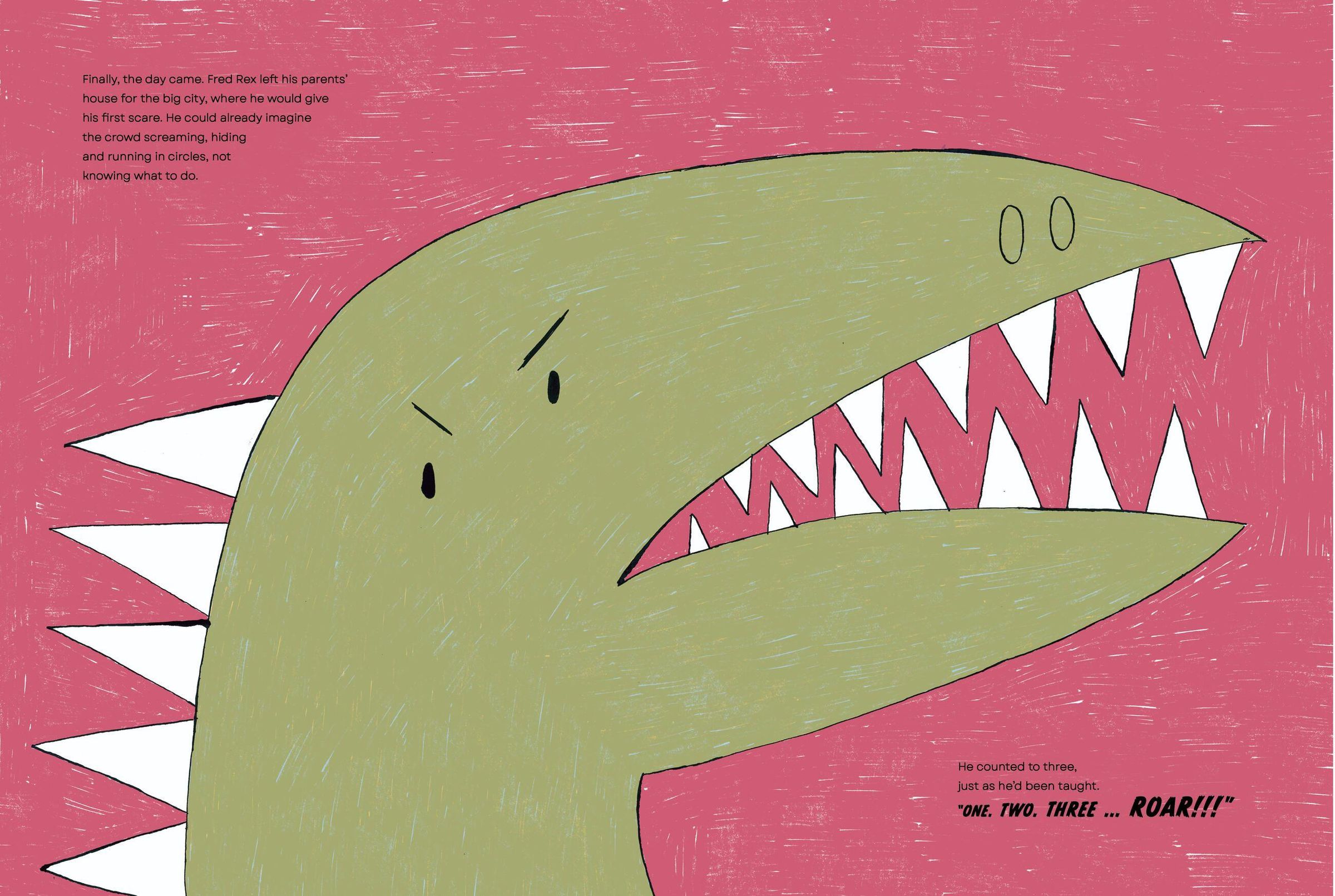 Frederick Bartholomew Rex the Third comes from a long line of accomplished frighteners. Now it's time for him to join the family business, so he heads to the big city and begins the work of terrifying the inhabitants with his mighty roar. Only, no matter how hard he tries, nobody is frightened. Not even a little! Dejected and worried about disappointing his parents, Fred Rex decides to seek out other things he might enjoy. He finds himself particularly drawn to opera. Hmm. Could this be how he is actually meant to use his booming voice?