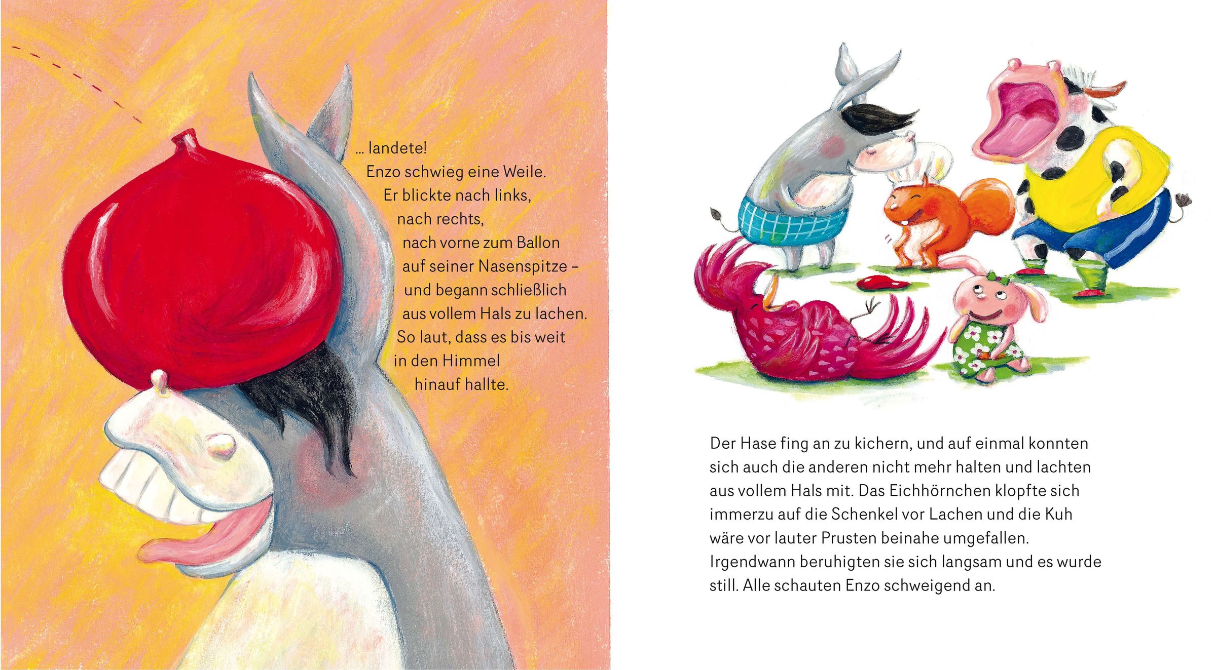 Enzo, der Esel, ist traurig. Er möchte so gerne einen Ballon aufpusten, aber es gelingt ihm nicht. Und überhaupt hat er das Gefühl, dass er gar nichts richtig gut kann. Als er es dann doch beinahe geschafft hat, rutscht ihm derBallon aus der Hand - und landet auf den Kopf des Hasen. Auch der Hase ist traurig, weil er das Gefühl hat, dass ergar nichts richtig gut kann. Aber Enzo weiß es - singen nämlich! Und zum Trost schenkt er ihm den Luftballon. Doch beim Aufpusten rutscht der Ballon dem Hasen aus der Hand - und landet auf dem Kopf der Kuh ... Ein wunderbar-liebevolles Buch darüber, wie man andere stark machen kann - und dabei selbst stark wird.