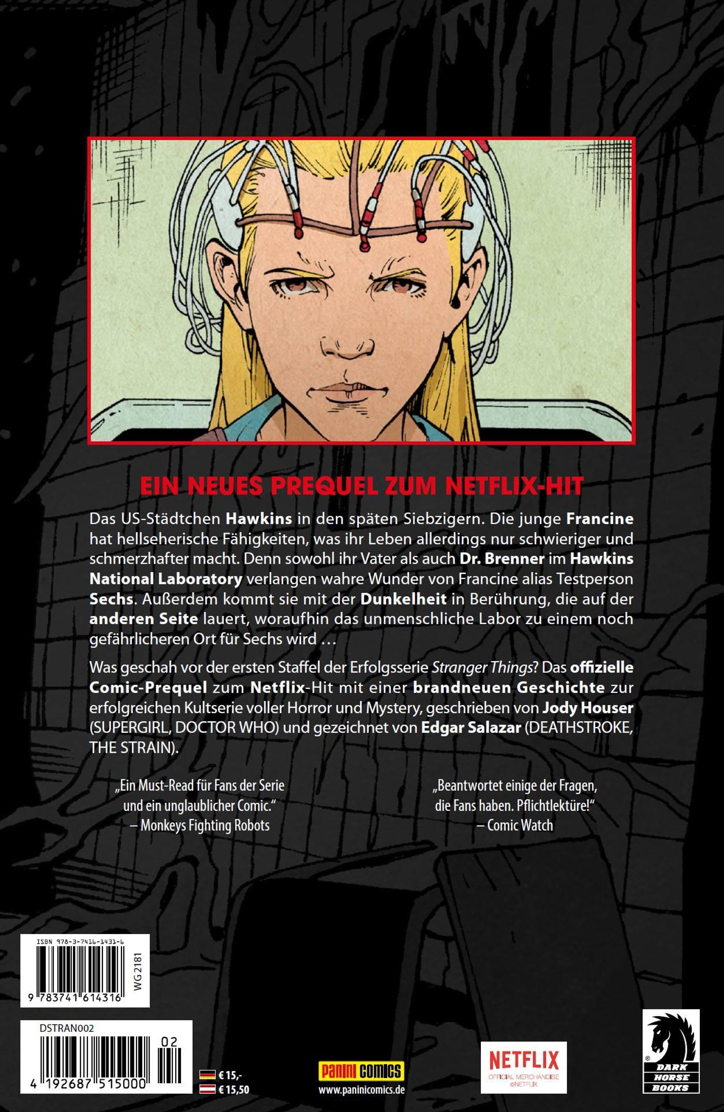 EIN NEUES PREQUEL ZUM NETFLIX-HIT Das US-Städtchen Hawkins in den späten Siebzigern. Die junge Francine hat hellseherische Fähigkeiten, was ihr Leben allerdings nur schwieriger und schmerzhafter macht. Denn sowohl ihr Vater als auch Dr. Brenner im Hawkins National Laboratory verlangen wahre Wunder von Francine alias Testperson Sechs. Außerdem kommt sie mit der Dunkelheit in Berührung, die auf der anderen Seite lauert, woraufhin das unmenschliche Labor zu einem noch gefährlicheren Ort für Sechs wird ...