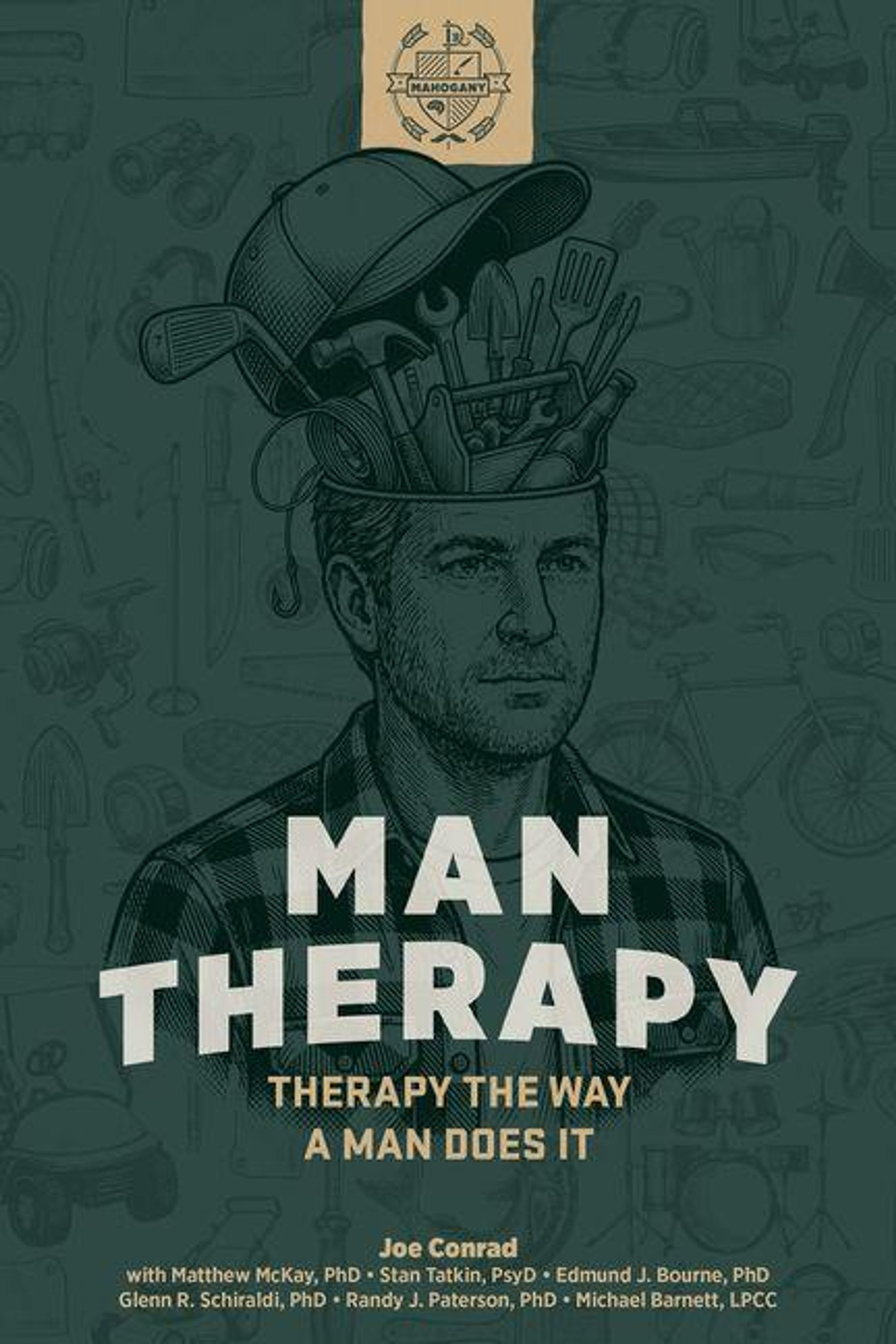 „MAN THERAPY: Therapy the way a man does it“. Illustration mit Werkzeugen im Kopf eines Mannes., Buch