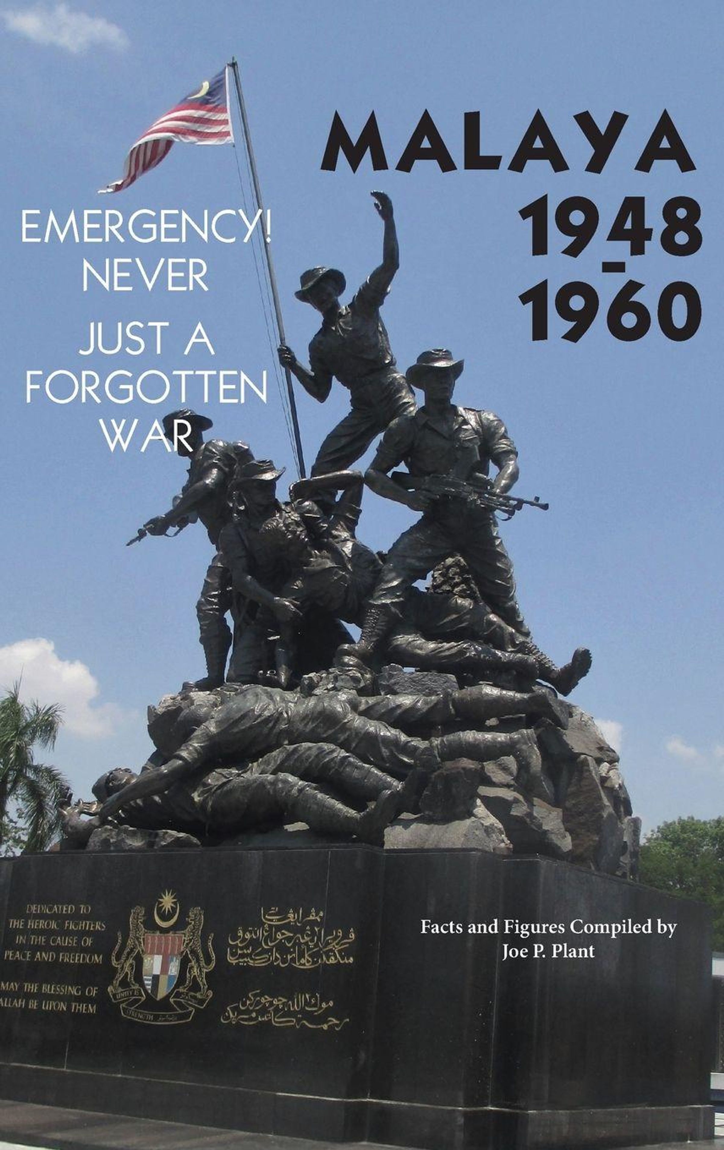 Text: "EMERGENCY! NEVER JUST A FORGOTTEN WAR. MALAYA 1948-1960. Facts and Figures Compiled by Joe P. Plant." Eine Soldatenstatue., Buch