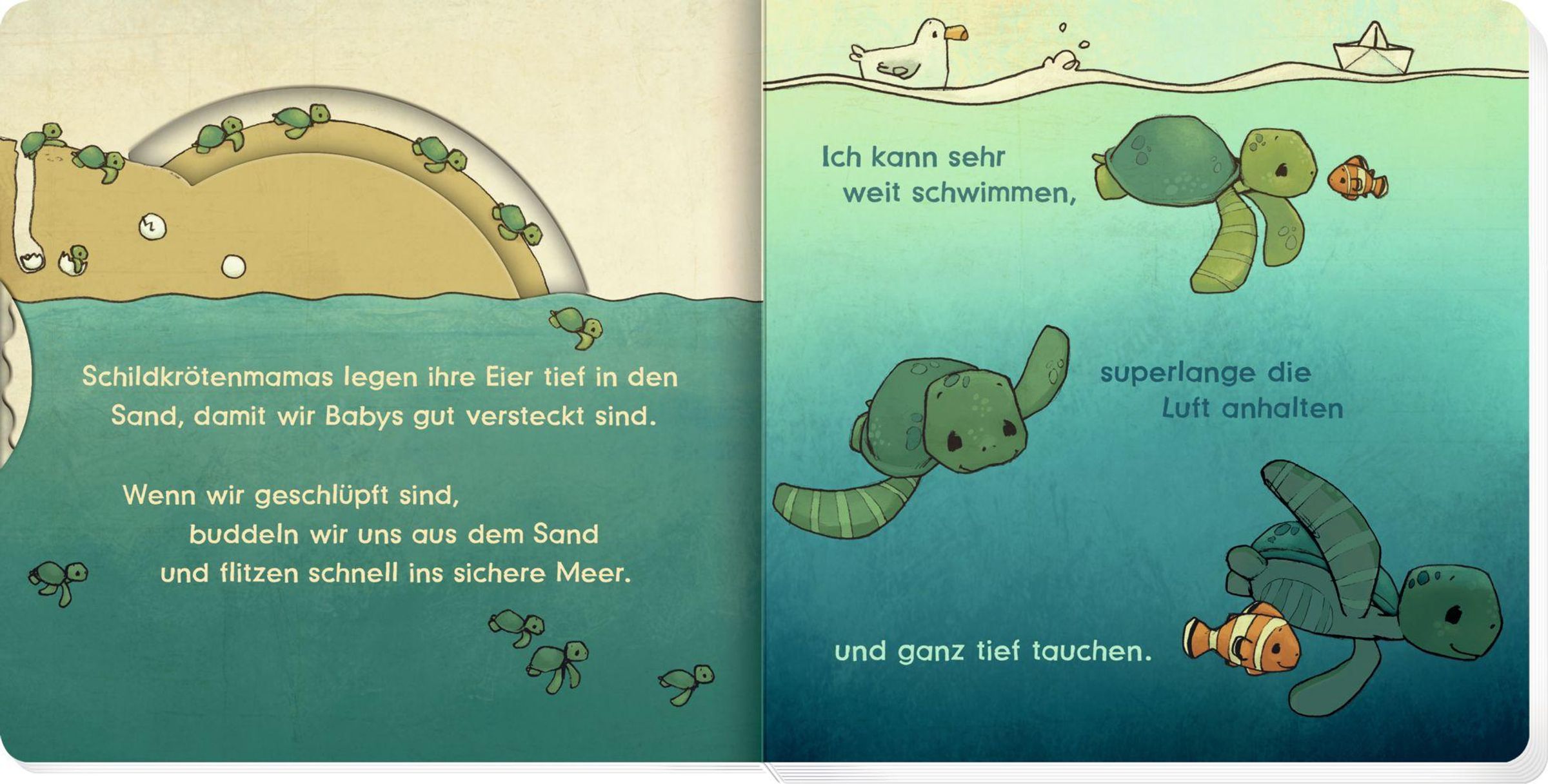 Die kleine Schildkröte lädt neugierige Kinder ein, ihre Welt zu entdecken. Gemeinsam wird getaucht, gestaunt und gelacht. Das Drehrad bringt Bewegung ins Vorlesen, der Text schafft Nähe und Geborgenheit. Ein interaktives Kinderbuch über Tiere, das Vorlesen und Mitmachen auf besondere Weise verbindet.