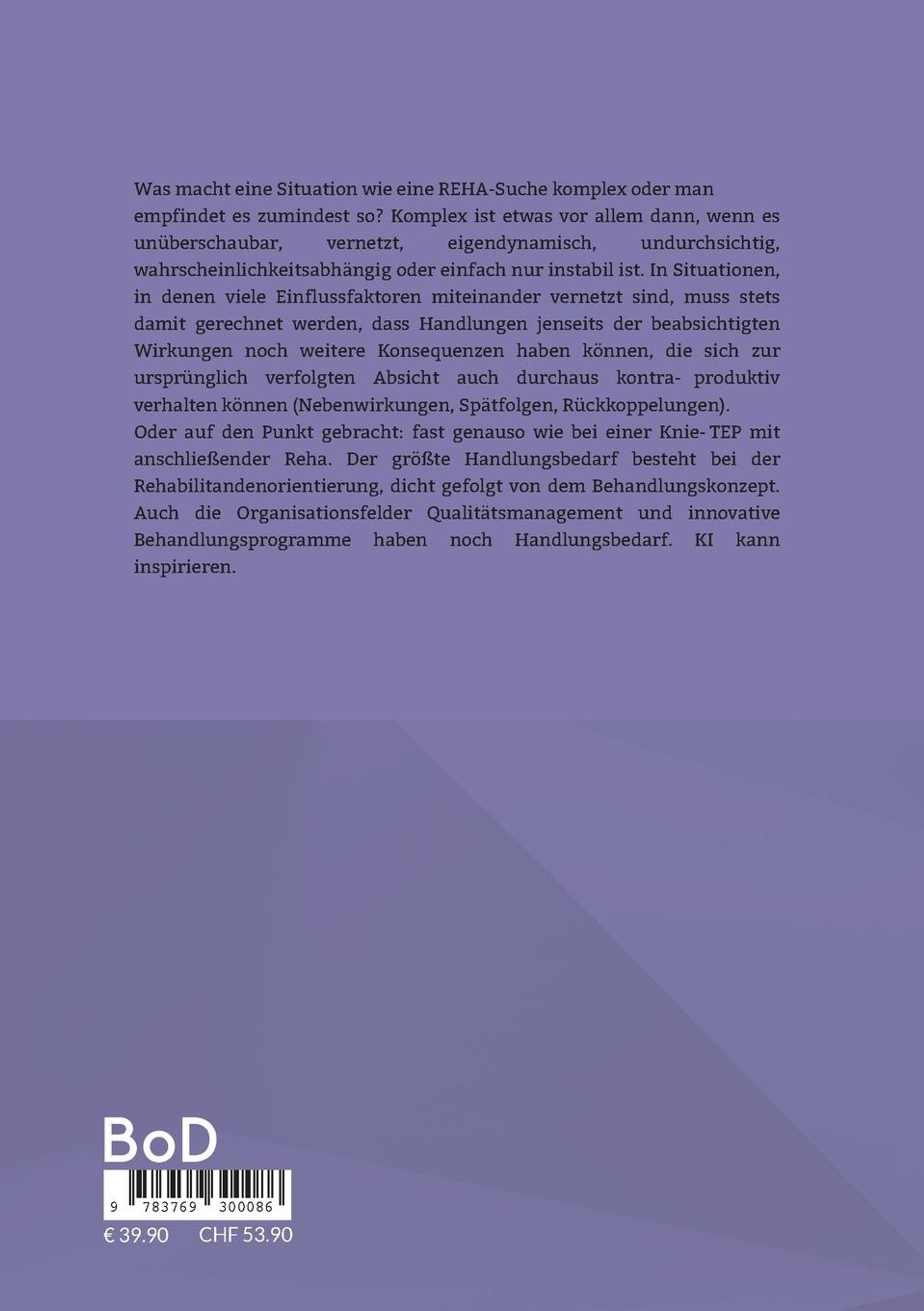 Was macht eine Situation wie eine REHA-Suche komplex oder man empfindet es zumindest so? Komplex ist etwas vor allem dann, wenn es unüberschaubar, vernetzt, eigendynamisch, undurchsichtig, wahrscheinlichkeitsabhängig oder einfach nur instabil ist. In Situationen, in denen viele Einflussfaktoren miteinander vernetzt sind, muss stets damit gerechnet werden, dass Handlungen jenseits der beabsichtigten Wirkungen noch weitere Konsequenzen haben können, die sich zur ursprünglich verfolgten Absicht auch durchaus kontra-produktiv verhalten können (Nebenwirkungen, Spätfolgen, Rückkoppelungen). Oder auf den Punkt gebracht: fast genauso wie bei einer Knie-TEP mit anschließender Reha. Der größte Handlungsbedarf besteht bei der Rehabilitandenorientierung, dicht gefolgt von dem Behandlungskonzept. Auch die Organisationsfelder Qualitätsmanagement und innovative Behandlungsprogramme haben noch Handlungsbedarf. KI kann inspirieren.
