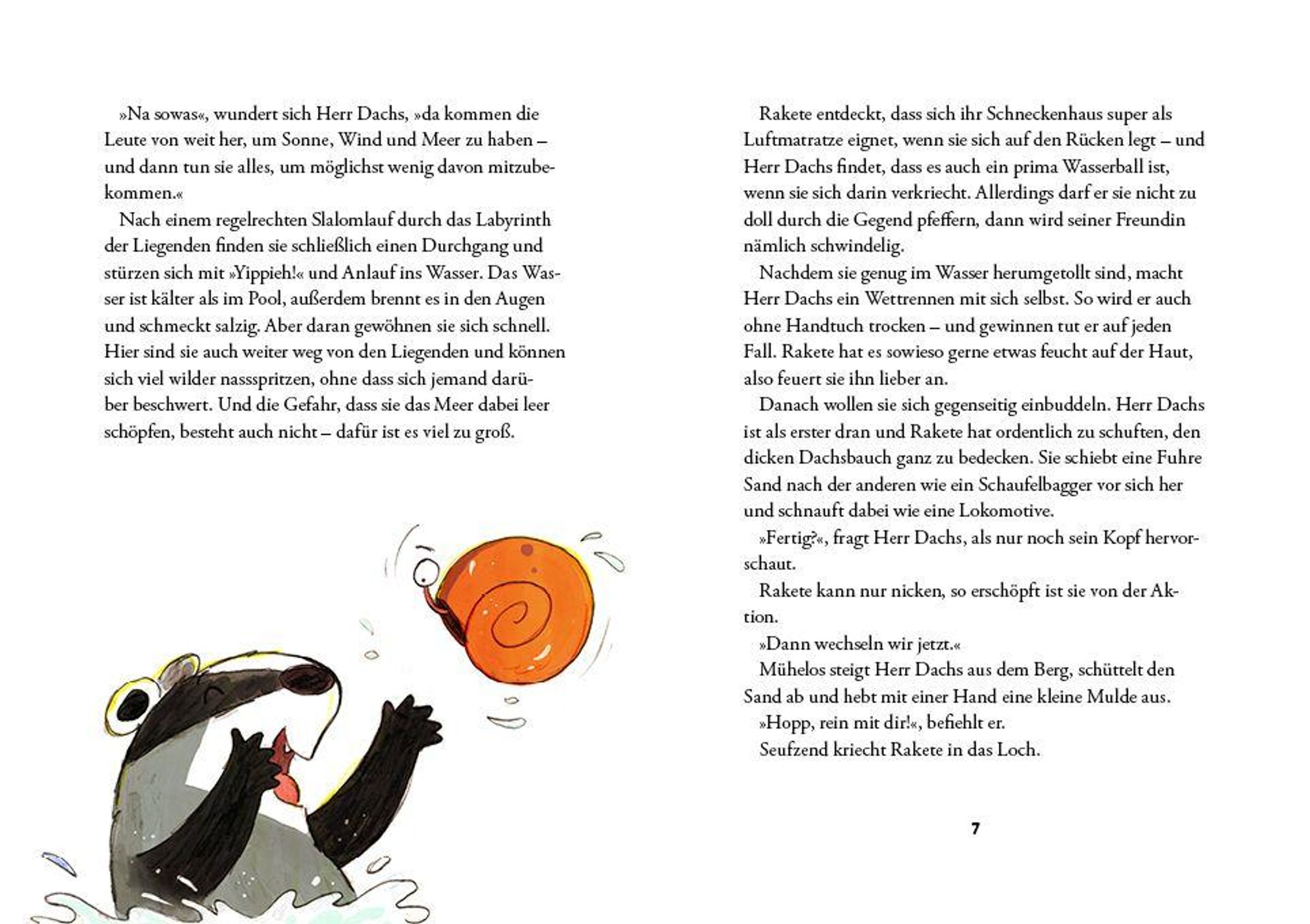 Herr Dachs und seine Freundin Rakete haben im Preisausschreiben gewonnen: Zum ersten Mal fahren sie ans Meer! Die ganze Hausgemeinschaft gibt ihnen zum Abschied wichtige Tipps. Was sie nicht verpassen dürfen, und was sie unter allen Umständen vermeiden müssen! Wer Dachs und Rakete kennt, ahnt schon, dass es trotz guter Vorbereitung noch Spielraum für lustige Missverständnisse und Überraschungen gibt. Dass der Pool gar nicht das Meer ist zum Beispiel und ein leerer Liegestuhl noch lange kein freier Liegestuhl. Und dass ein Hotelbüffet sich niemals komplett aufessen lässt, nicht mal von Dachs. Jörg Isermeyer schickt seine liebenswerten Helden auf die Reise, wundert sich mit ihnen über Urlauber in Luxushotels und lässt sie trotzdem viele neue Freunde finden.