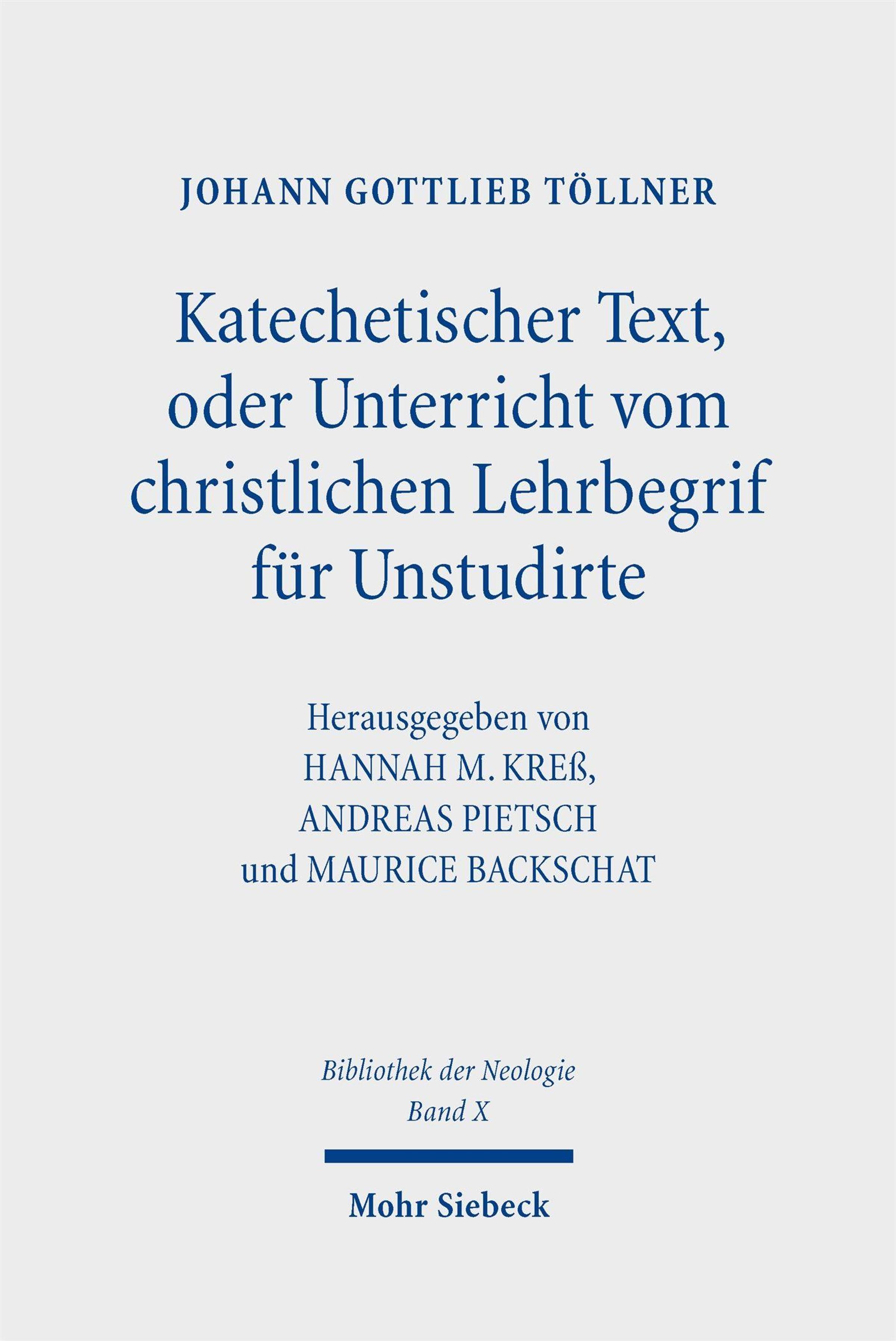 Johann Gottlieb Töllner (1724-1774), alongside his student Steinbart, was the most important representative of Enlightenment theology in Frankfurt / Oder. His "Katechetischer Text, oder Unterricht im christlichen Lehrbegriff für Unstudirte" was intended to convey his theological convictions in a popular-scientific form to a non-academic readership. Instead of the specialized terminology still common in textbooks of the time, Töllner consistently used clear and accessible language. The text offers a panorama of central Neological positions, emphasizing, for example, the beneficial function of religion for human happiness. The basic ideas are presented in clearly structured paragraphs combining a main text to be learned with supplementary knowledge. Töllner's work was widely used as a textbook in Prussian schools.