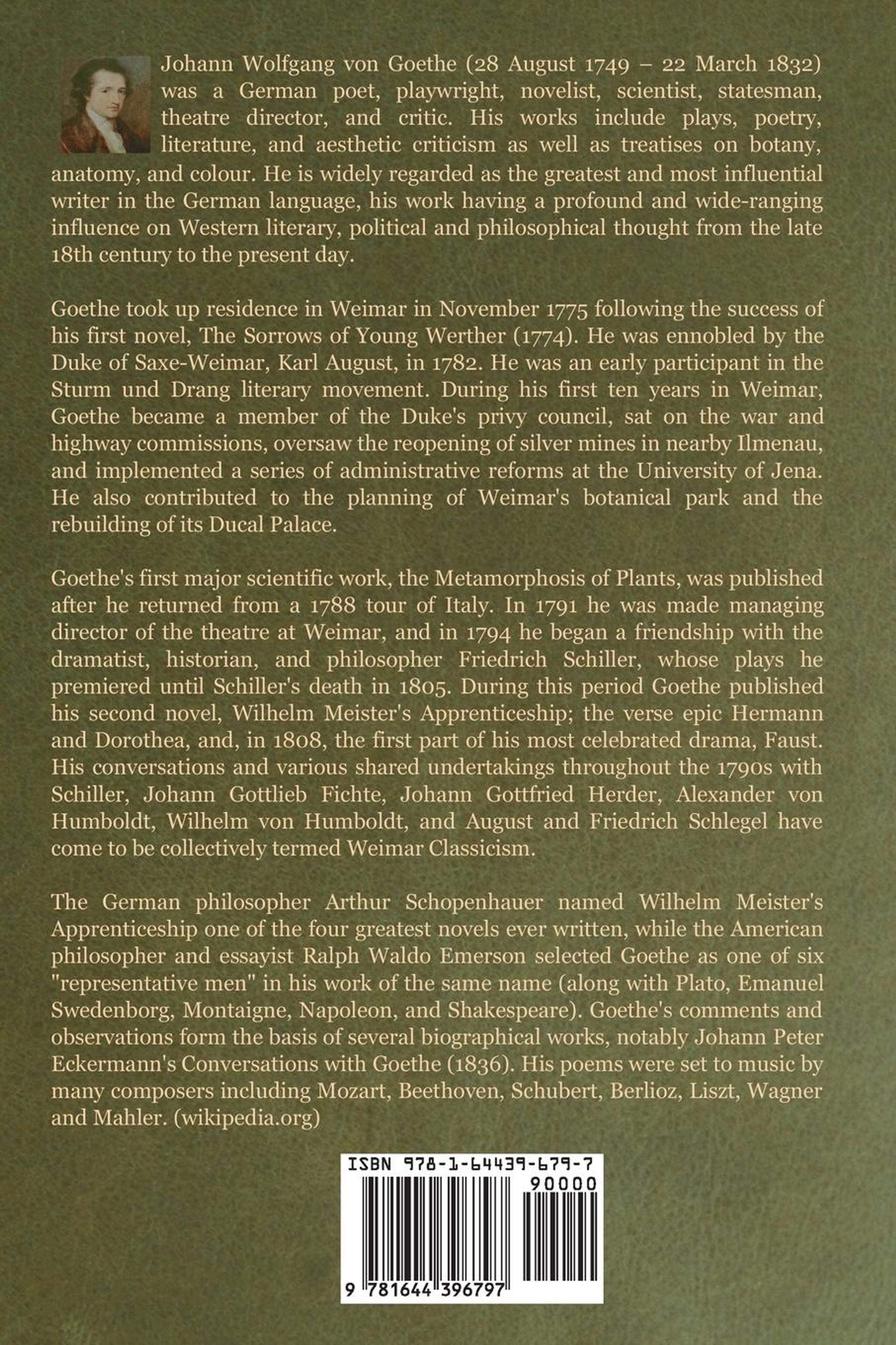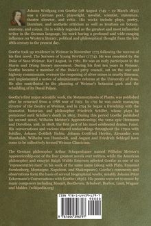 Johann W. von Goethe, geb. am 28.8.1749 in Frankfurt a.M., gest. am 22.3.1832 in Weimar. Jurastudium in Leipzig und Strassburg. Lebenslanges Wirken in Weimar. Reisen zum Rhein, nach der Schweiz, Italien und Böhmen. Frühe Erfolge mit den Sturm und Drang-Stücken 'Götz' und 'Werther', Gedichte (herrliche Liebeslyrik), Epen, Dramen ('Faust', 'Tasso', 'Iphigenie' u. v. a.), Autobiographien. Zeichner und Universalgelehrter: Botanik, Morphologie, Mineralogie, Optik. Theaterleiter und Staatsmann. Freundschaft und Korrespondenz mit den grössten Dichtern, Denkern und Forschern seiner Zeit (Schiller, Humboldt, Schelling . . .). Goethe prägte den Begriff Weltliteratur, und er ist der erste und bis zum heutigen Tag herausragendste Deutsche, der zu ihren Vertretern gehört.