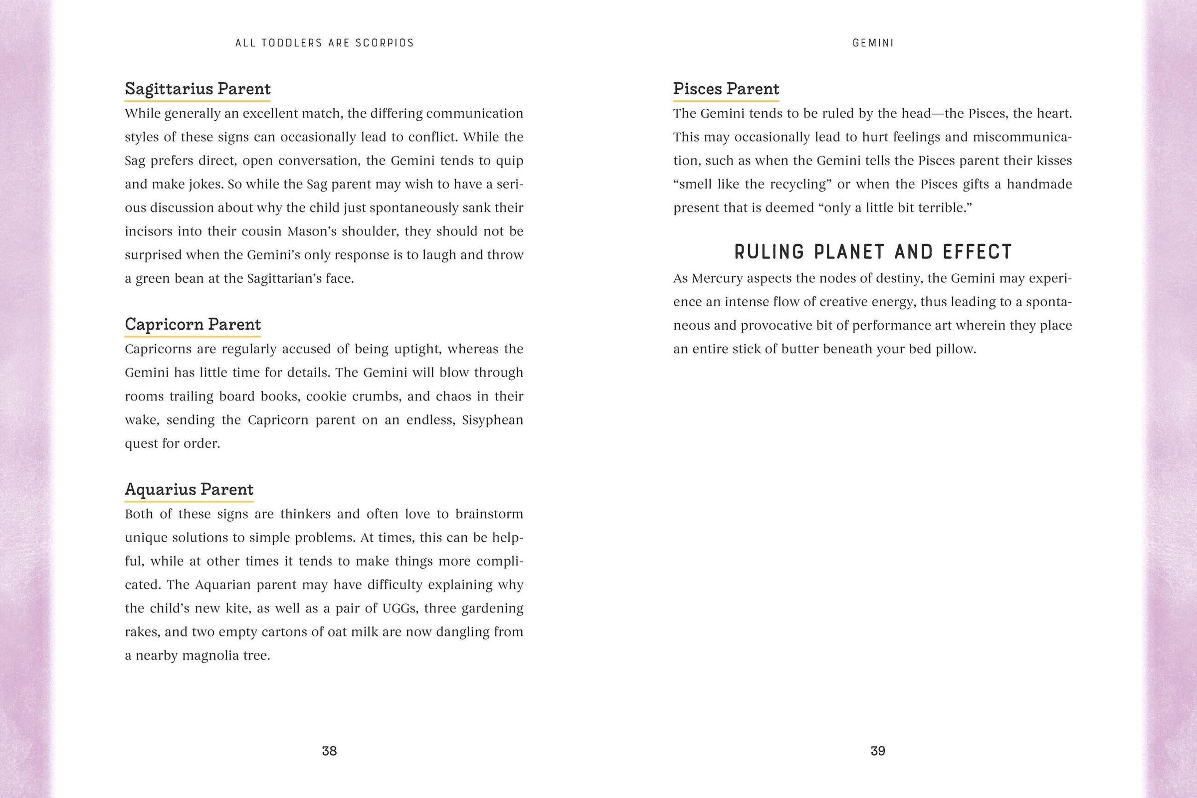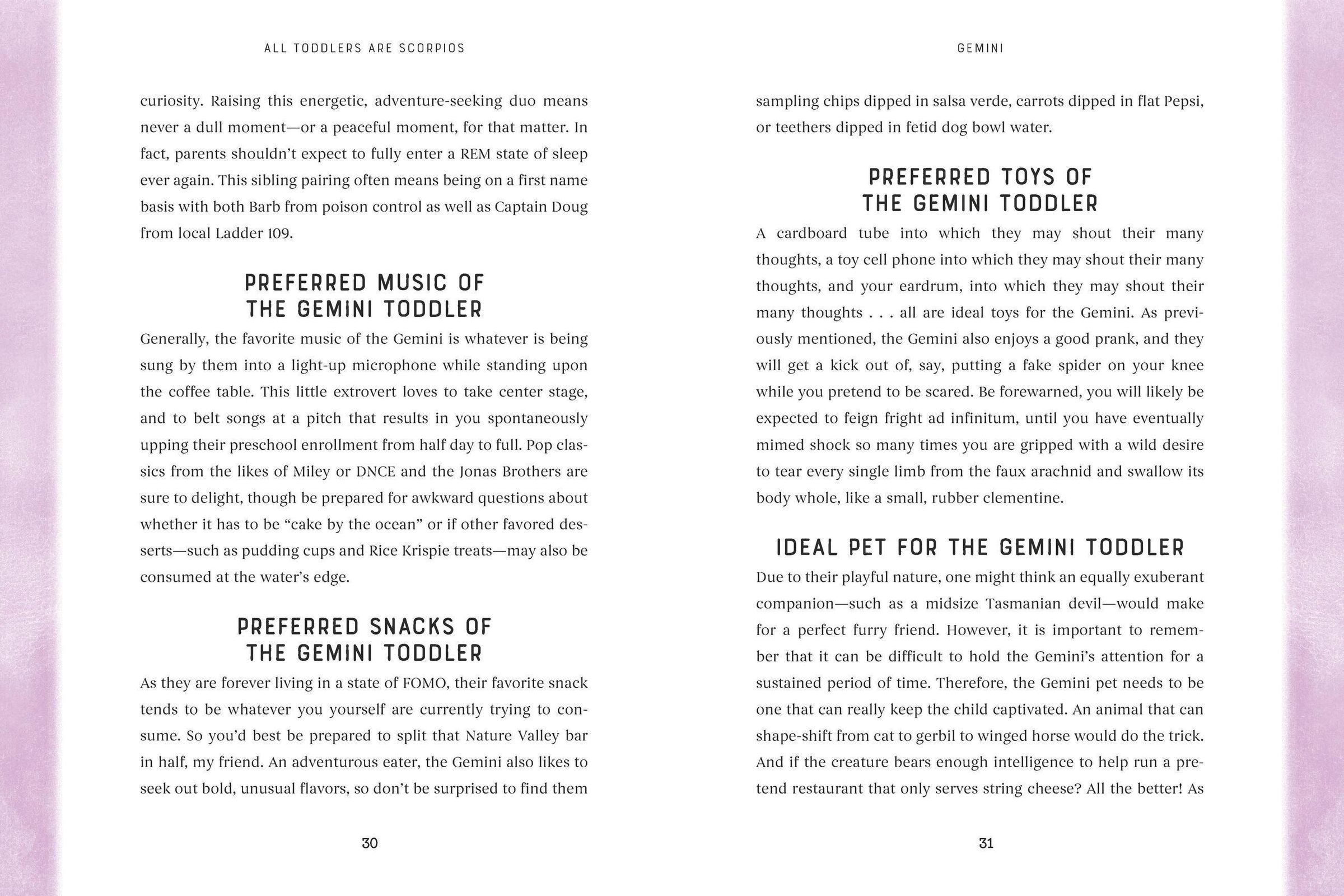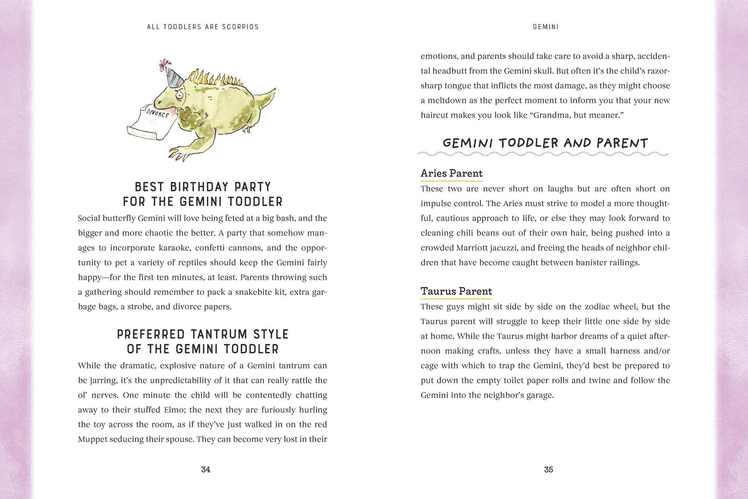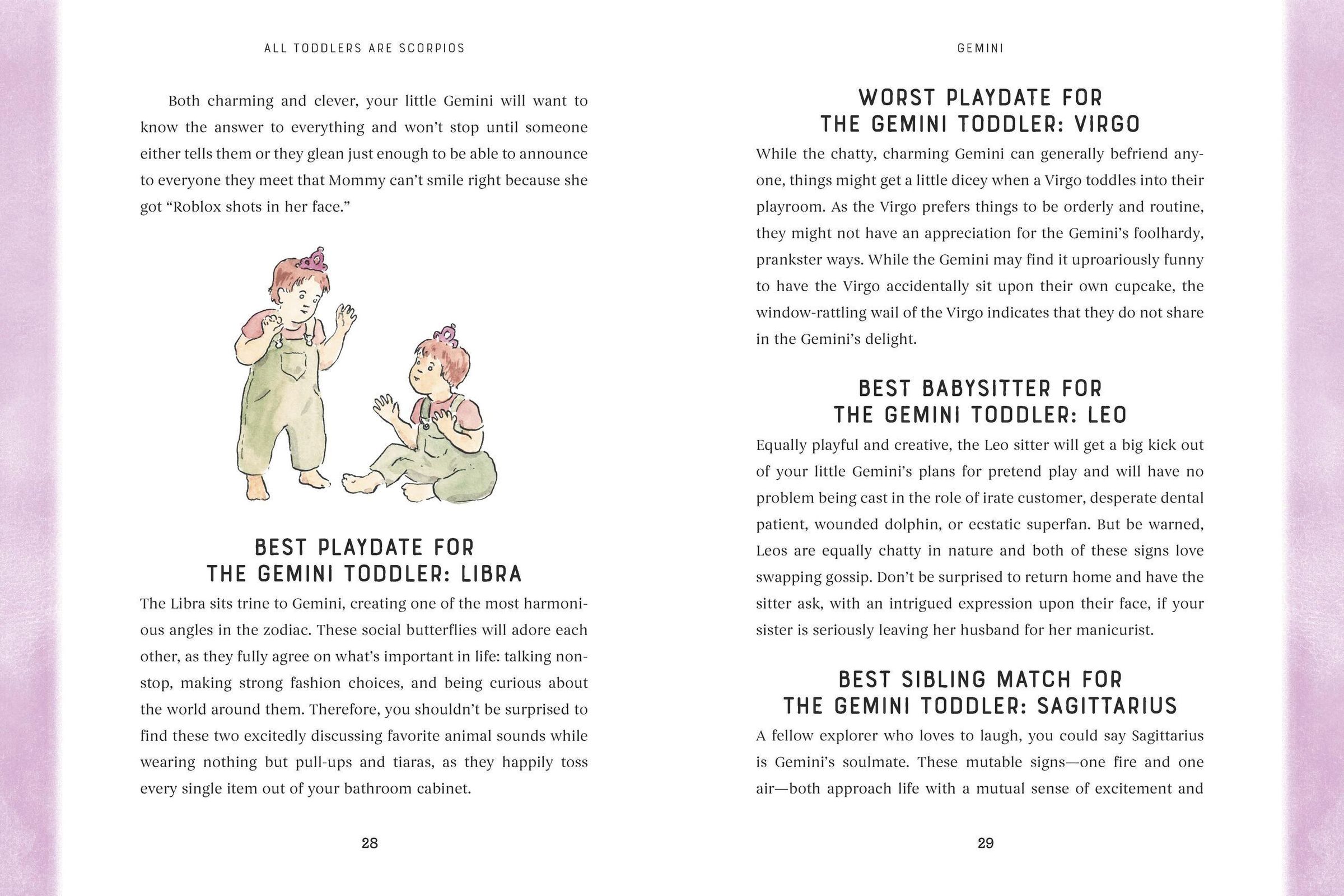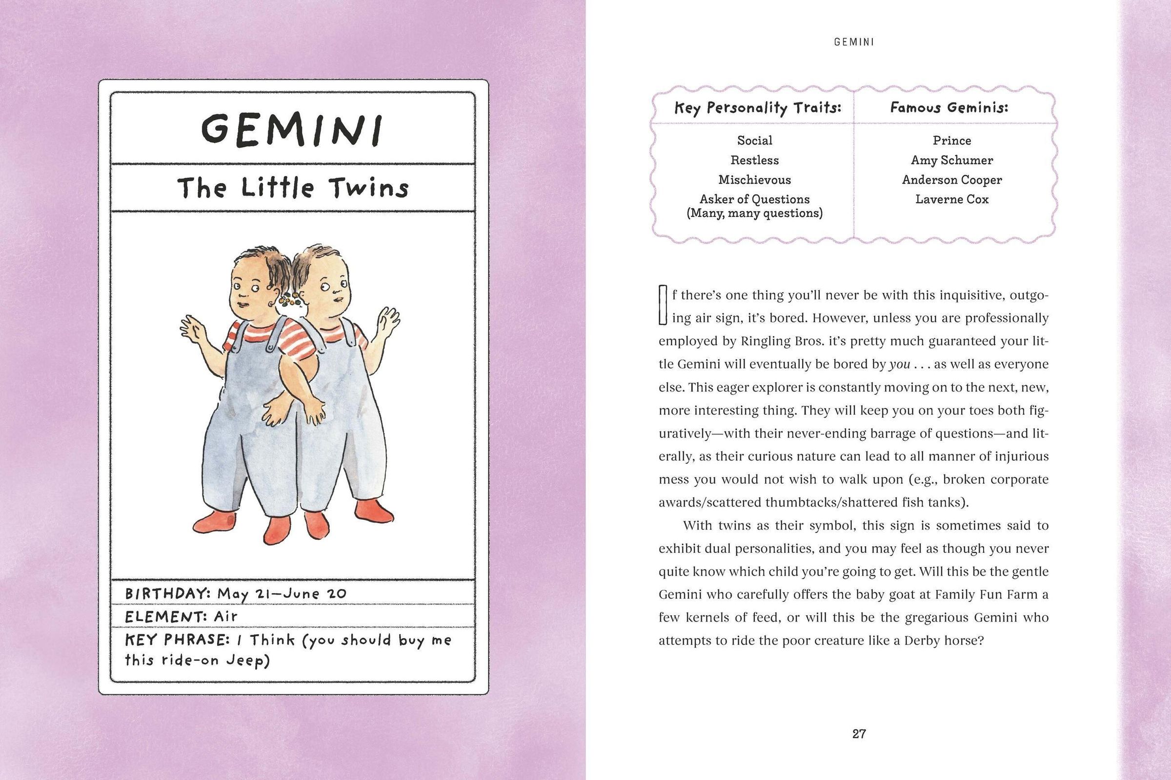 Blending parental exasperation with cosmic insight, Gohmann breaks down toddler personalities by zodiac sign---offering a starry-eyed (and slightly frazzled) look at the joys and mysteries of raising tiny humans. The profiles of each zodiac sign include sections dedicated to best (and worst!) toddler playdate matches; toddler's preferred music, snacks, and toys; parent-child zodiac compatibility; and hilarious illustrations throughout from cartoonist Emily Flake. Whether you are raising a tenacious Taurus, a balanced Libra, or, yes, a hell-raising Scorpio, this is a book that lets parents laugh at the sheer insanity of sharing their home with a tiny terror.