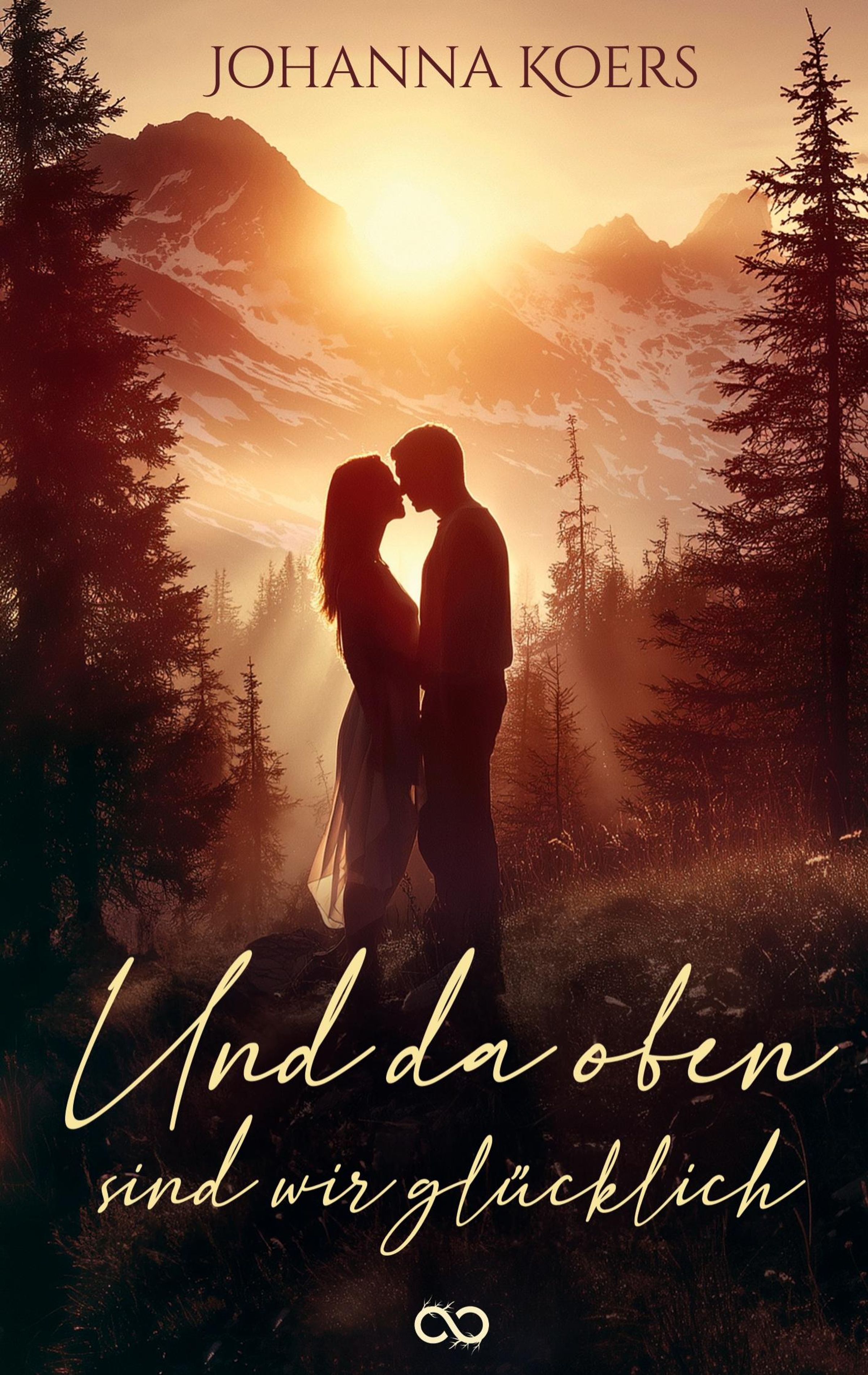 JOHANNA KOERS. "Und da oben sind wir glücklich" in geschwungener Schrift. Ein Paar in Silhouette vor einem Berg bei Sonnenuntergang., Buch