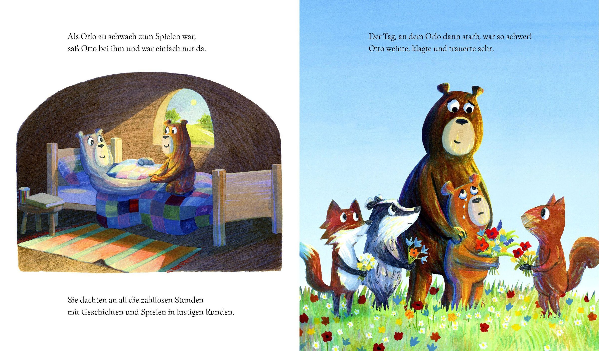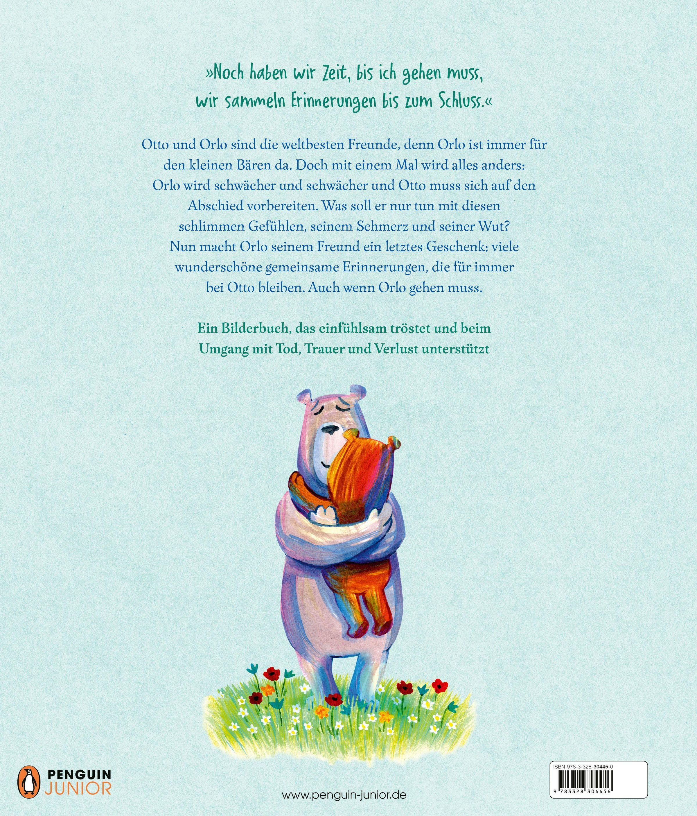 Otto und Orlo sind die weltbesten Freunde, denn Orlo ist immer für den kleinen Bären da. Doch mit einem Mal wird alles anders: Orlo wird schwächer und schwächer und Otto muss sich auf den Abschied vorbereiten. Was soll er nur tun mit diesen schlimmen Gefühlen, seinem Schmerz und seiner Wut? Nun macht Orlo seinem Freund ein letztes Geschenk: viele wunderschöne gemeinsame Erinnerungen, die für immer bei ihm bleiben. Auch wenn Orlo gehen muss.