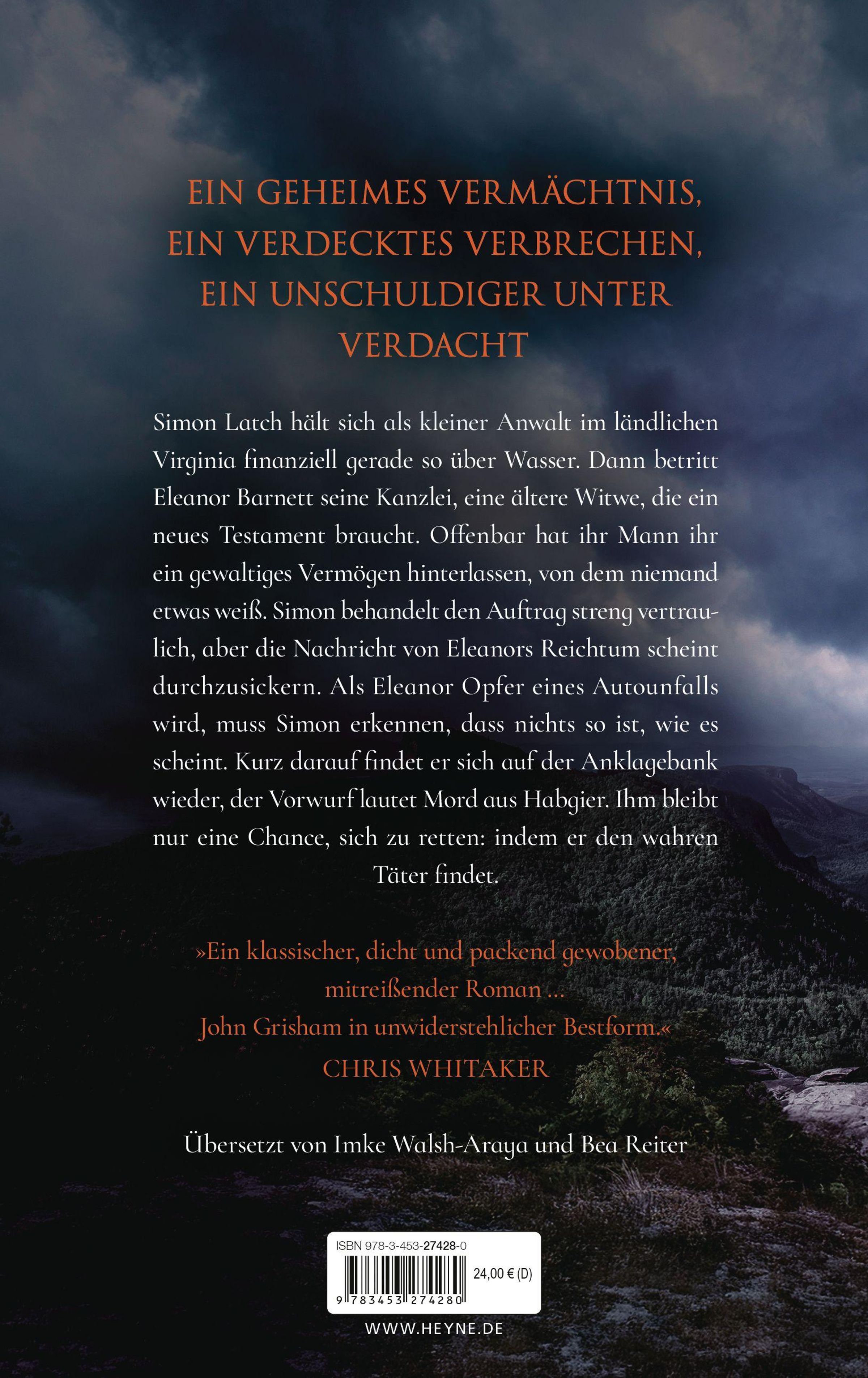 Simon Latch ist ein kleiner Anwalt im ländlichen Virginia. Finanziell kommt er nur mit Müh und Not über die Runden, zudem geht seine Ehe in die Brüche. Dann betritt Eleanor Barnett sein Büro, eine ältere Witwe, die ein neues Testament braucht. Offenbar hat ihr Mann ihr ein gewaltiges Vermögen hinterlassen, von dem niemand etwas weiß. Simon behandelt den Auftrag streng vertraulich, aber die Nachricht von Eleanors Reichtum scheint durchzusickern. Als Eleanor Opfer eines Autounfalls wird, muss Simon erkennen, dass nichts so ist, wie es scheint. Kurz darauf findet er sich auf der Anklagebank wieder, der Vorwurf lautet Mord aus Habgier. Alle Indizien sprechen gegen ihn. Ihm bleibt nur eine Chance, sich zu retten: wenn er den wahren Mörder findet.