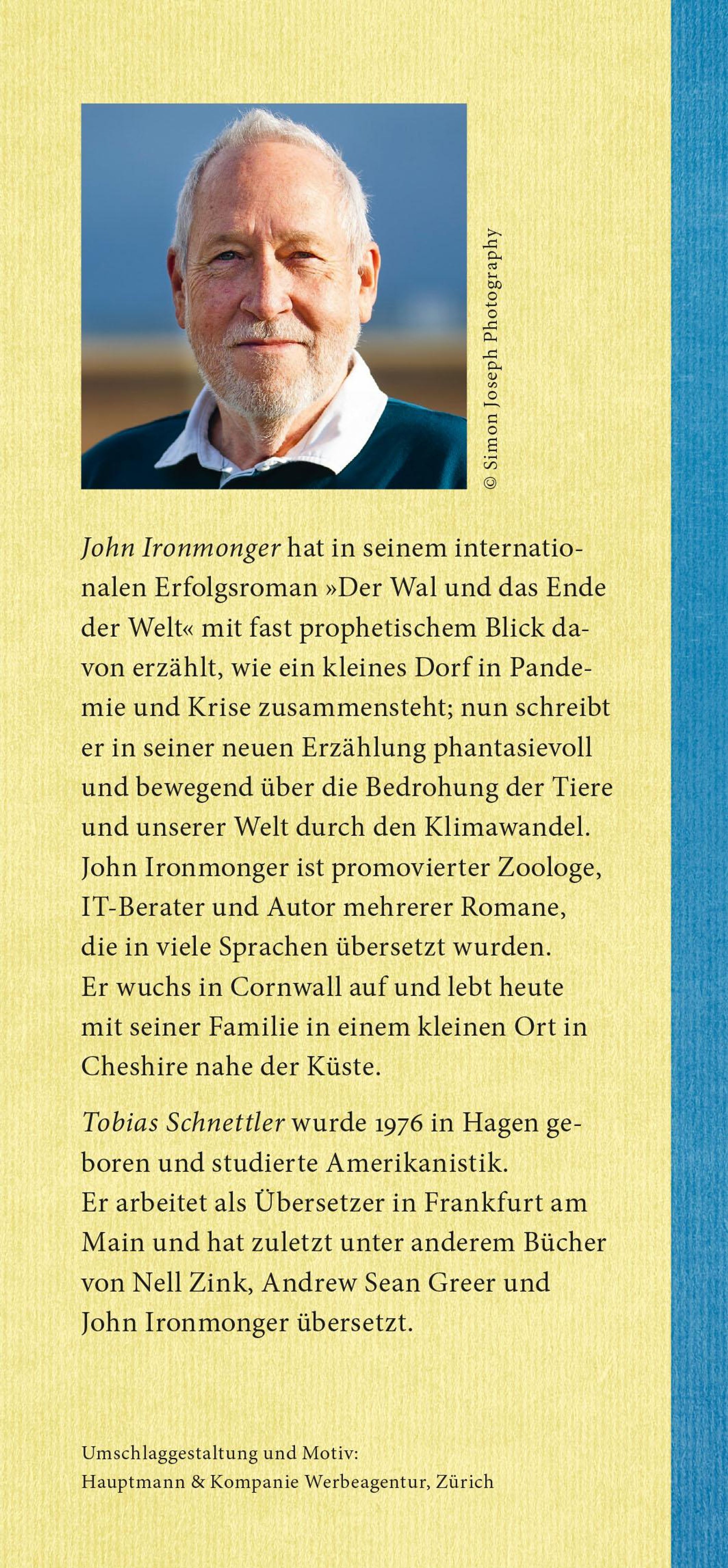 Die bewegende Klima-Erzählung. Vom Autor des Platz-1-Bestsellers »Der Wal und das Ende der Welt«. »Der eindringliche Appell, den der britische Autor John Ironmonger verpackt hat, wirkt sehr lange nach - im Herz und im Kopf der Leserschaft.« NDR Kultur »Ein kleines und doch ganz massives Werk, das ich gerne an jeden, den ich kenne, weitergeben würde. Wann waren 140 Seiten so grundehrlich, so erschreckend, so traurig aber auch so aktivierend zugleich?« Shades of Paper Toby Markham, in seiner Freizeit leidenschaftlicher Reisender und Tierfotograf, erwacht in einem unbekannten Raum. Eben noch stand er voll im Leben, erfolgreich und angesehen, nun kann er sich kaum bewegen. Um ihn herum Menschen mit seltsamen Namen, die ihm nicht wohlgesinnt scheinen. Sie klagen ihn an: Toby soll an einer unvorstellbaren Katastrophe Schuld haben. Wo ist er bloß gelandet? Was kann er zu seiner Verteidigung vorbringen? Und was hat das Dugong damit zu tun - diese freundliche Seekuh, die wie so viele andere bedrohte Arten auf Rettung hofft? Spannend und berührend erzählt John Ironmonger in seiner neuen kurzen Geschichte von der Schönheit unserer Welt. Und stellt uns die Frage, wer die Verantwortung für sie trägt. Eine berührende Novelle für unsere Zeit, abenteuerlich und hoch aktuell.Biografie (Tobias Schnettler)