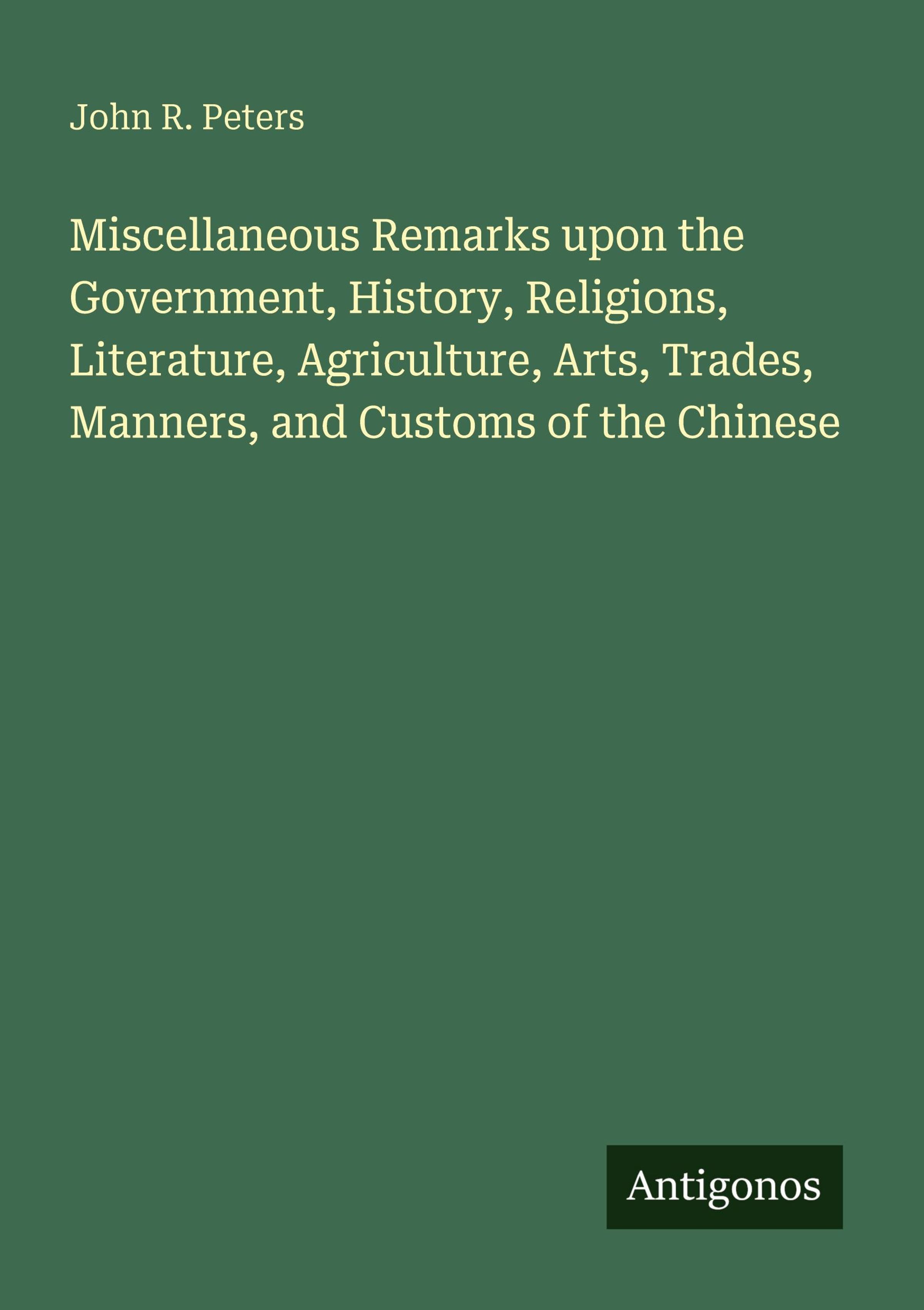 Miscellaneous Remarks upon the Government, History, Religions, Literature, Agriculture, Arts, Trades, Manners, and Customs of the Chinese