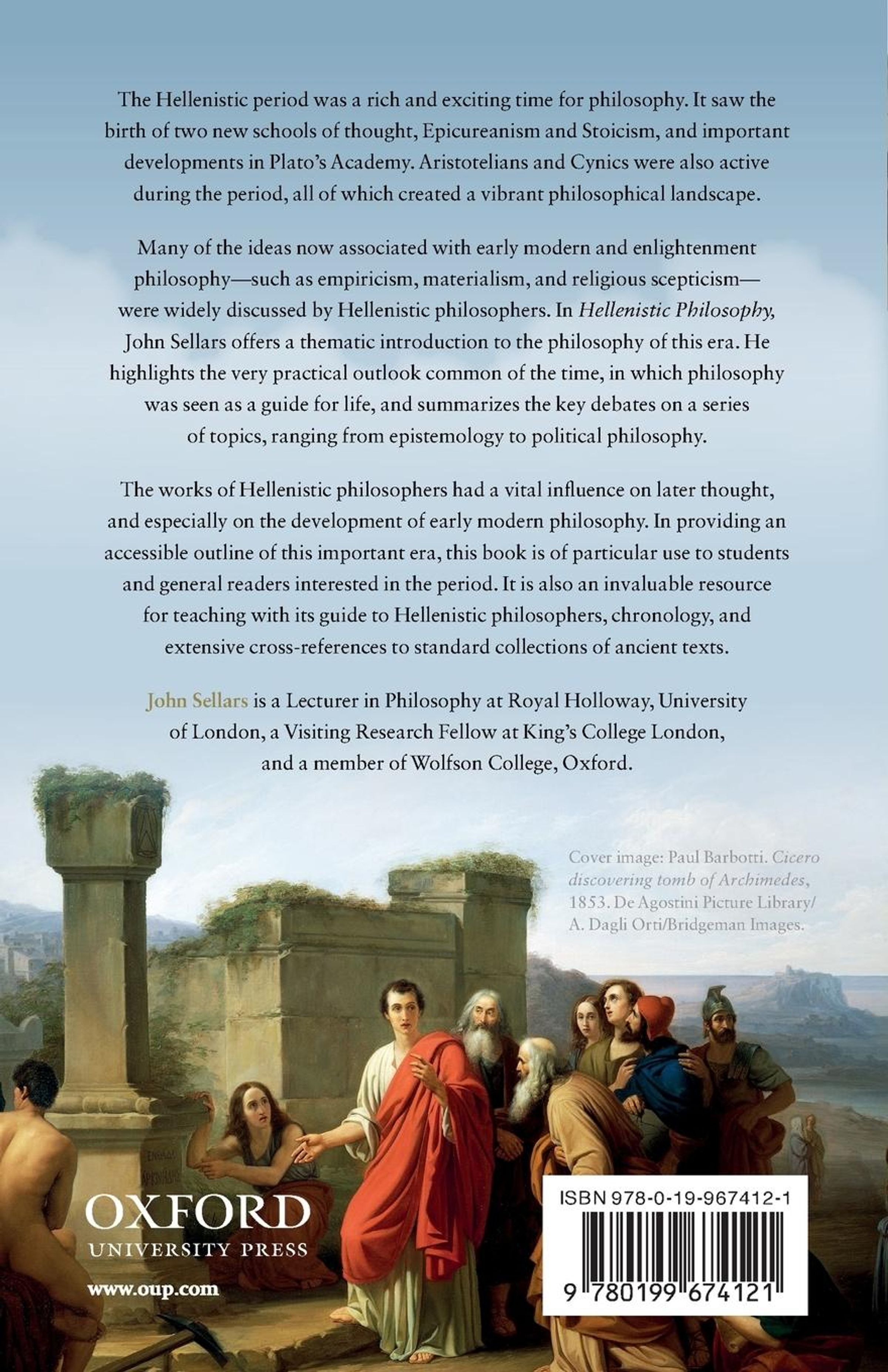 Text: „HELLENISTIC PHILOSOPHY John Sellars“. Eine historische Szene mit Personen in antiker Kleidung vor Ruinen., Buch