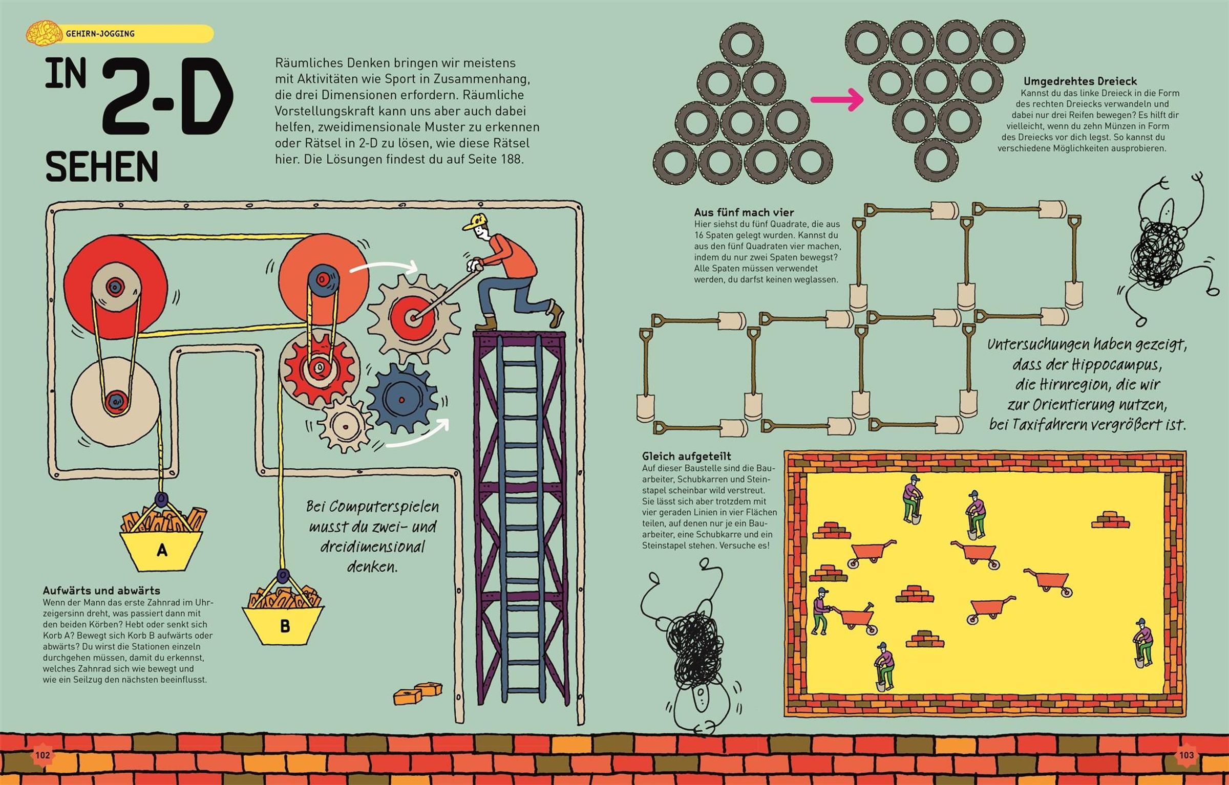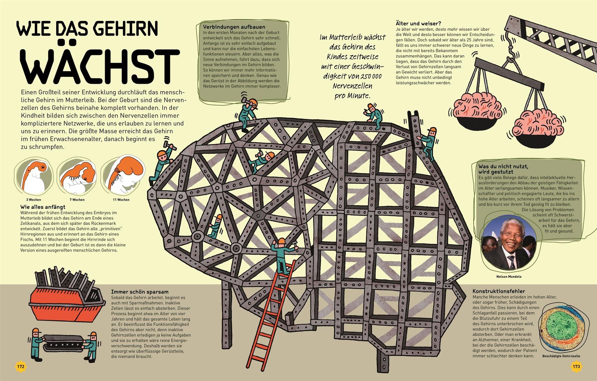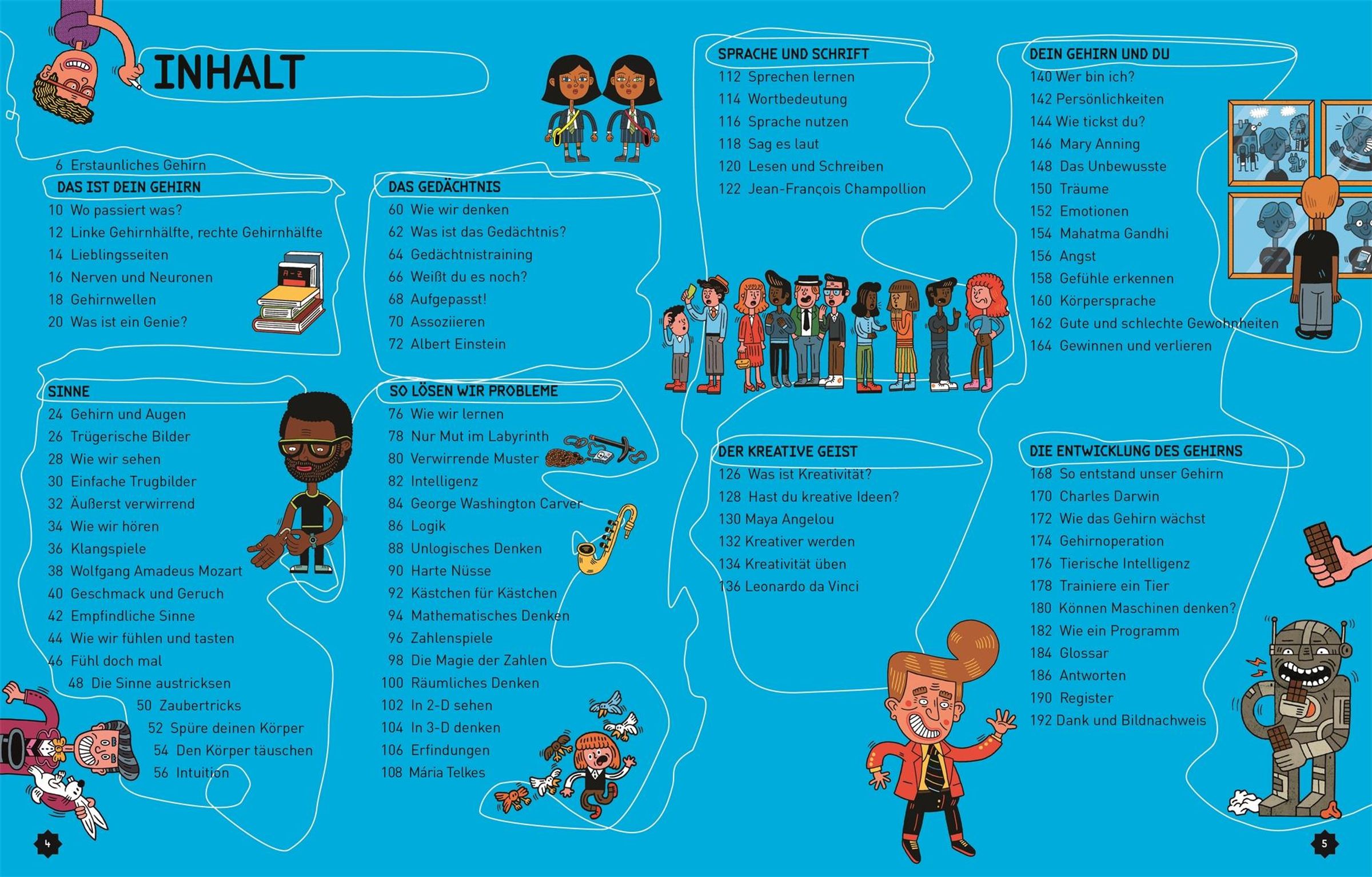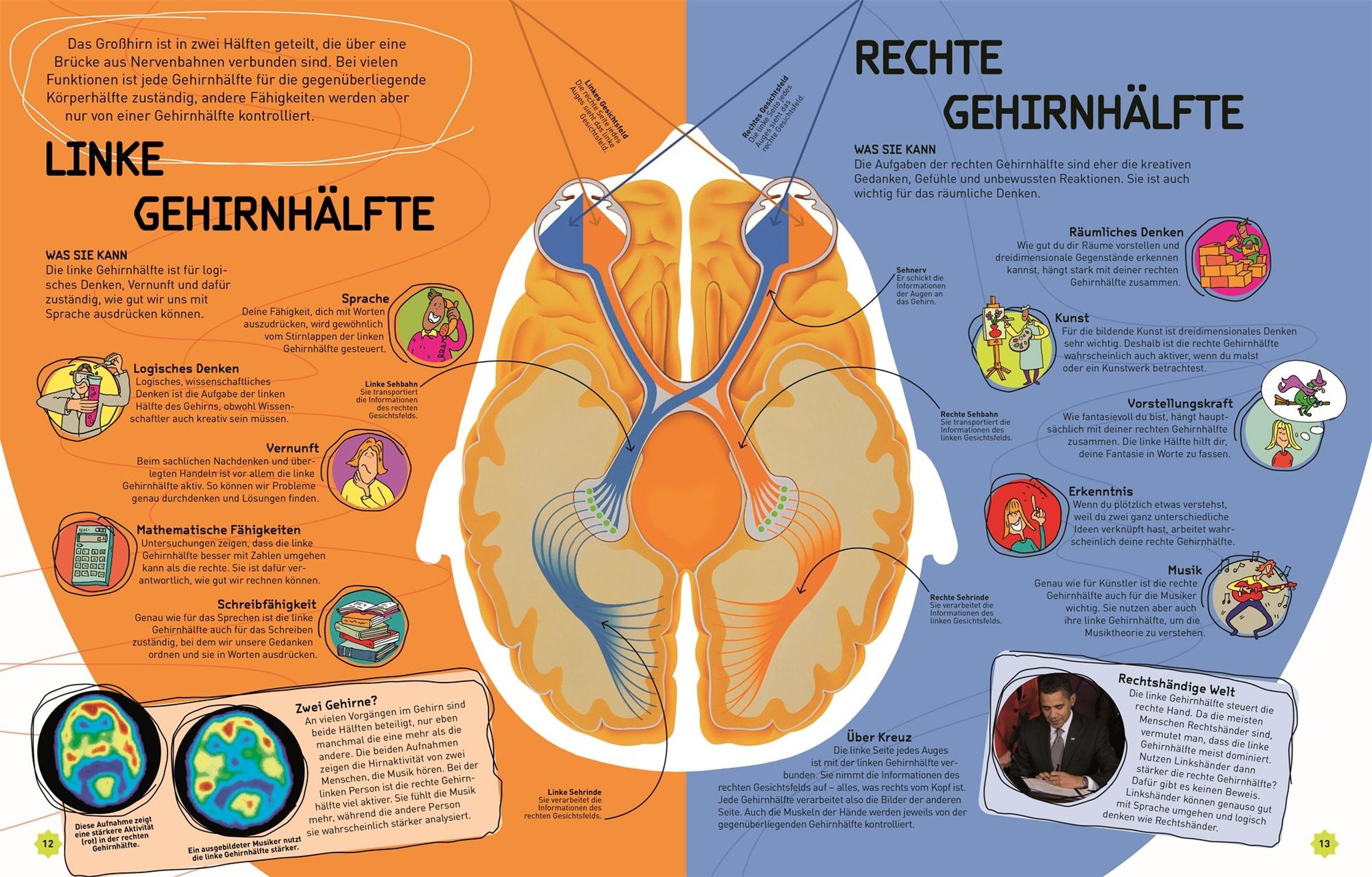 Wie setzen Neuronen ein Lächeln in Gang? Warum schlafwandeln manche Menschen? Was passiert in der rechten, was in der linken Gehirnhälfte? Kaum ein anderes Körperteil ist so faszinierend wie das menschliche Gehirn . Und über dieses Wunderwerk der Natur gibt es für neugierige Kinder so einiges zu entdecken! Wie denken wir? Was passiert im Gehirn, wenn wir sprechen, fühlen, Probleme lösen und uns bewegen? Spannende Sachtexte erläutern erstaunliche Fakten über unsere Sinne, das Gedächtnis, Sprache, Kreativität und Persönlichkeit. Wissensrätsel, optische Täuschungen, starke Tricks und seitenweise Infos über Genies bringen junge graue Zellen zusätzlich auf Trab.