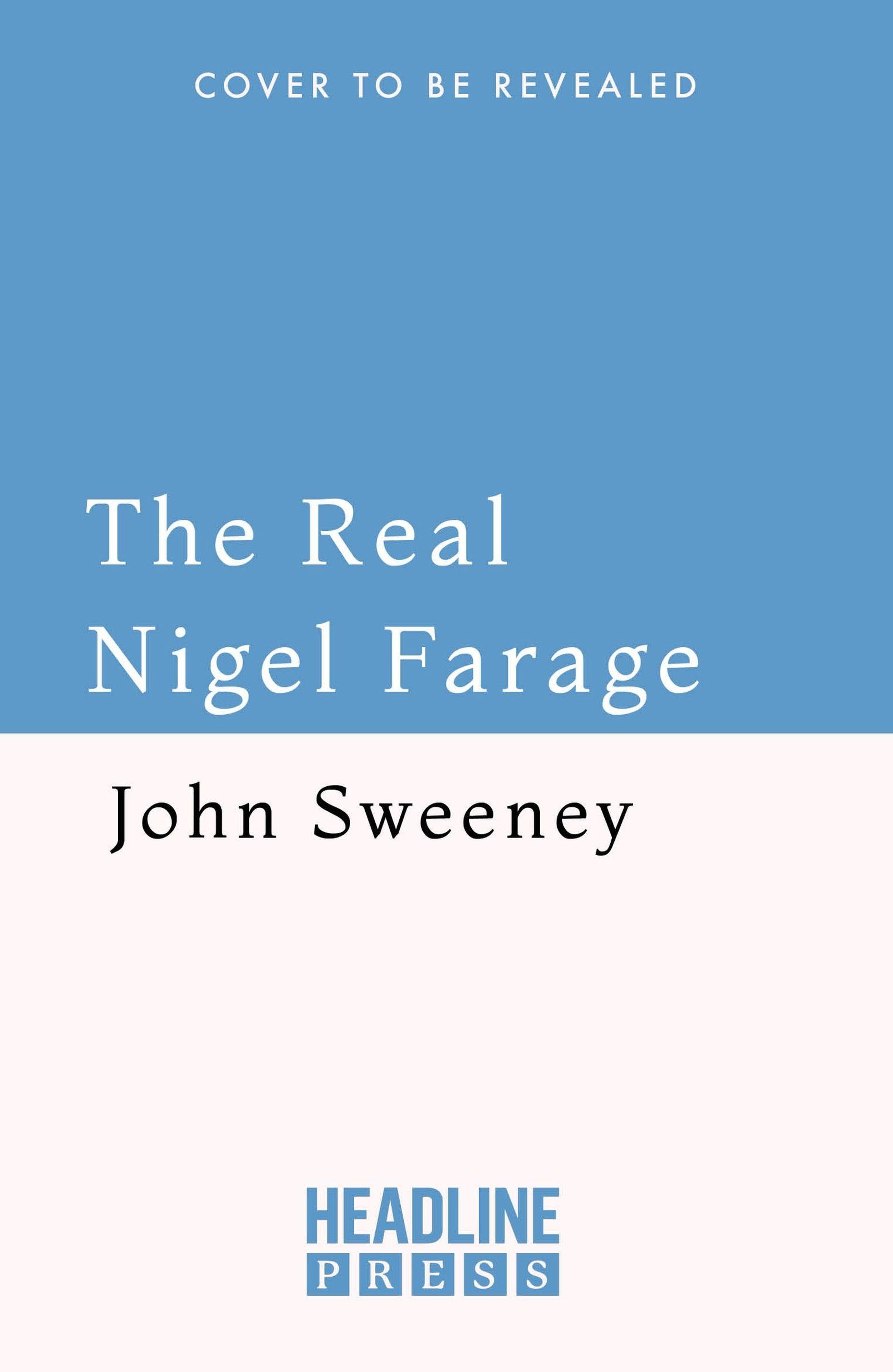 Text: „Cover to be revealed“, „The Real Nigel Farage“, „John Sweeney“, „Headline Press“. Blauer und weißer Hintergrund., Buch