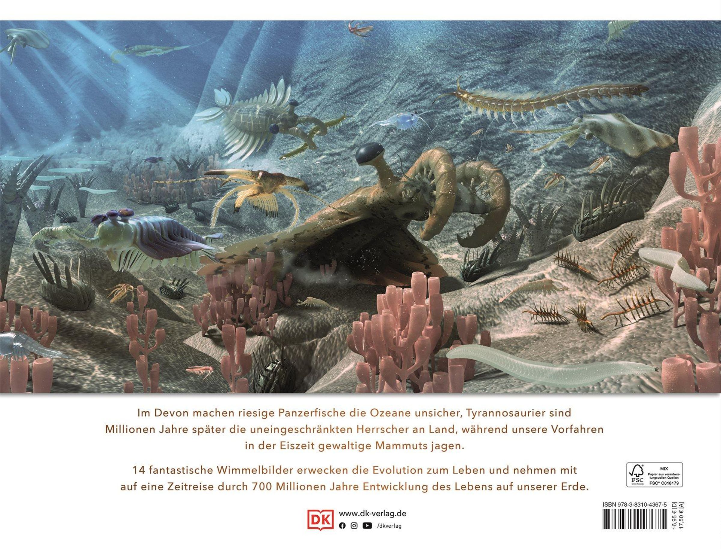 So wie wir das Leben heute kennen, hat es sich im Laufe von Jahrmillionen gebildet. Dieses Sachbuch ab 8 Jahren erweckt die Evolution zum Leben. In 14 fantastischen Wimmelbildern reist es durch die Entwicklung des Lebens. Riesen-Haie, Tyrannosaurus Rex, Mammuts - die Stars der Erdgeschichte sind ebenso vertreten wie eher unbekannte Lebewesen. Jede der großformatigen Doppelseiten setzt eine andere Landschaft in Szene - ein bestimmter Augenblick der Erdgeschichte voller Leben. Auf jeder Seite werden die wichtigsten Lebewesen und Pflanzen noch einmal extra herausgehoben und in kleinen Bildern um die jeweilige Szene herum angeordnet.