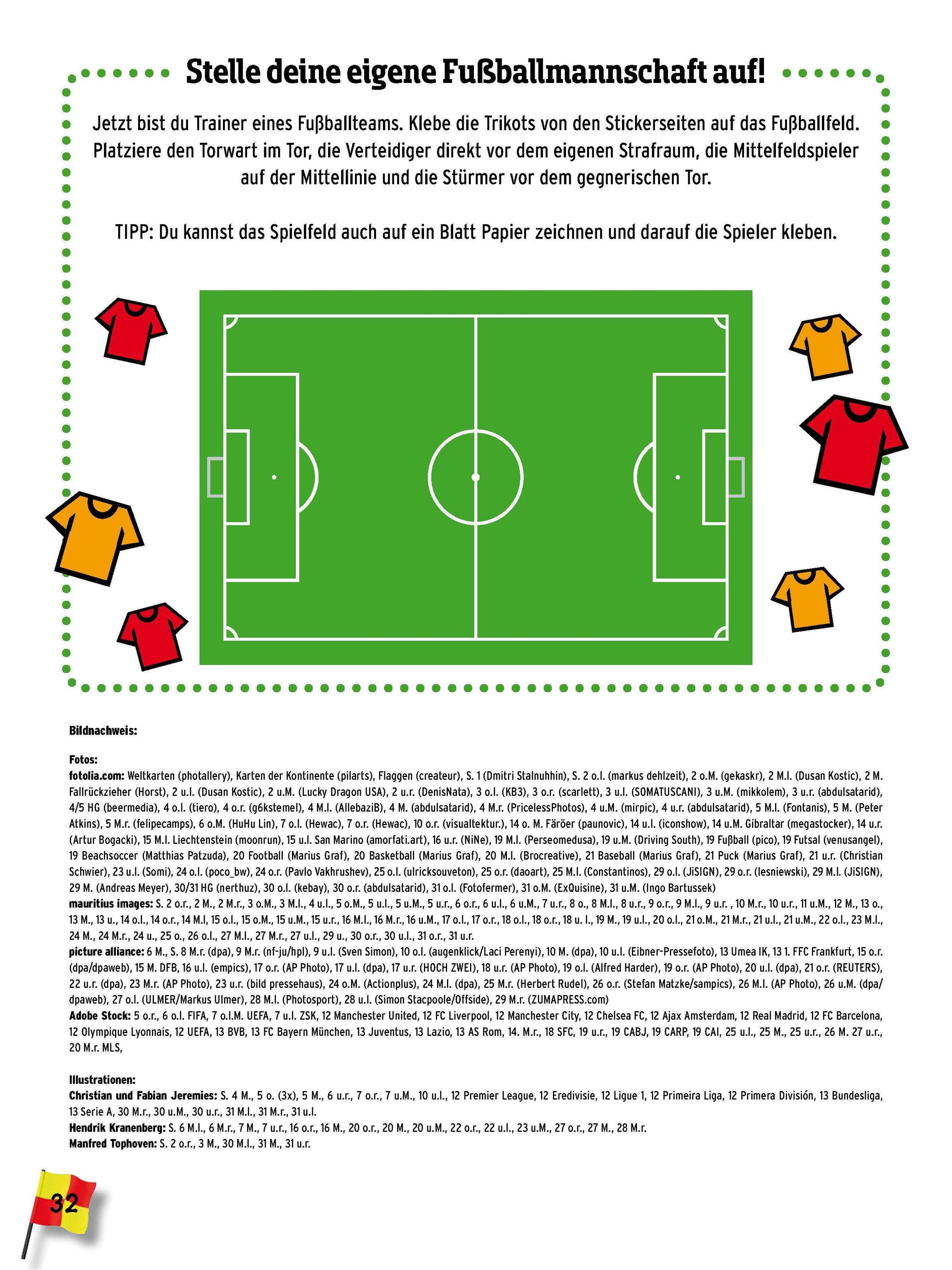 Mit den vielen Stickern macht die Beschäftigung mit deinem Lieblingsthema noch viel mehr Spaß: Suche aus den über 250 Aufklebern die passenden heraus und klebe so Seite für Seite deinen persönlichen Fußball-Atlas fertig. Wenn du jetzt so richtig im Fußball-Fieber bist, werde selbst zum Trainer und stelle auf der letzten Seite deine eigene Fußballmannschaft auf!