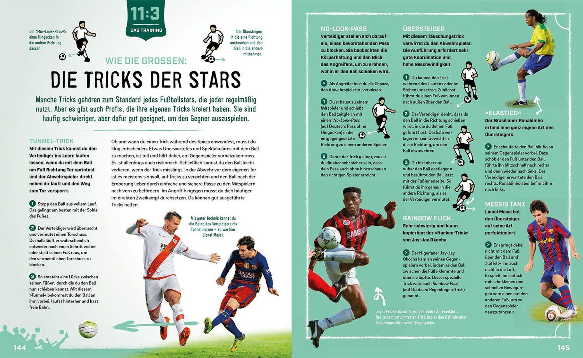 Was bedeutet "direkter" und "indirekter" Freistoß? Darf der Torwart den Ball außerhalb des Strafraums mit der Hand stoppen? Und warum ist ein Einwurf manchmal falsch, obwohl der Ball eindeutig im Aus war? In diesem Fußballbuch steht alles drin, was fußballbegeisterte Kinder wissen wollen. In 11 Kapiteln kann man sich zu Spielregeln, Ausrüstung, Vereinen, Bundesliga, Nationalmannschaften, Meisterschaften, Frauenfußball und vielem mehr umfassend informieren. Interessante Rekorde und Kuriositäten sind ebenso enthalten wie ein Extra zu Taktik und Technik - für alle, die genauso erfolgreich spielen möchten wie Messi und Lewandowski. Die Texte sind leicht verständlich geschrieben und mit über 600 Fotos und Zeichnungen anschaulich bebildert. Das ultimative Buch zum absoluten Lieblingssport!