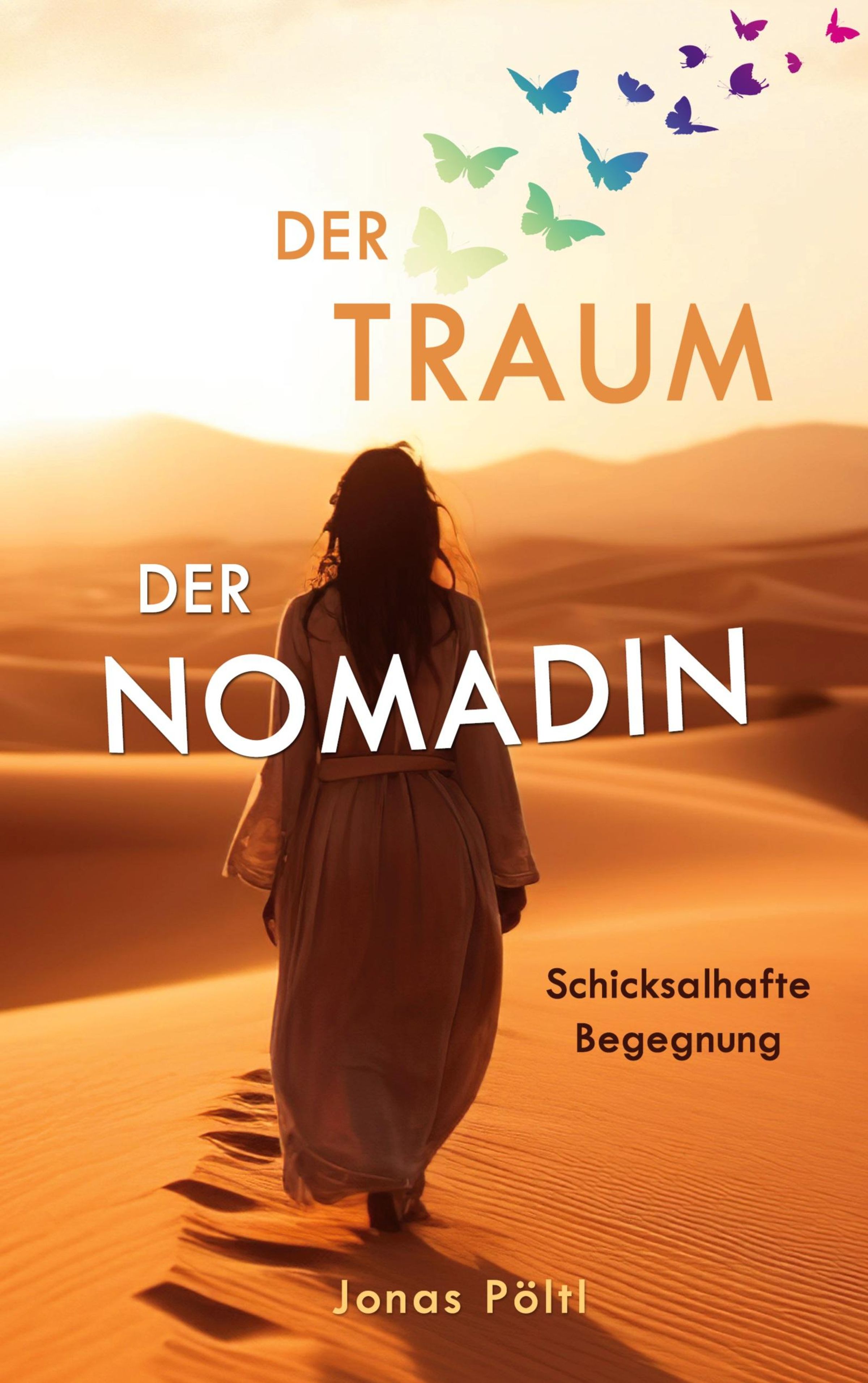 "Der Traum der Nomadin" und "Schicksalhafte Begegnung". Eine Frau in langer Kleidung in einer sonnigen Wüstenlandschaft., Buch