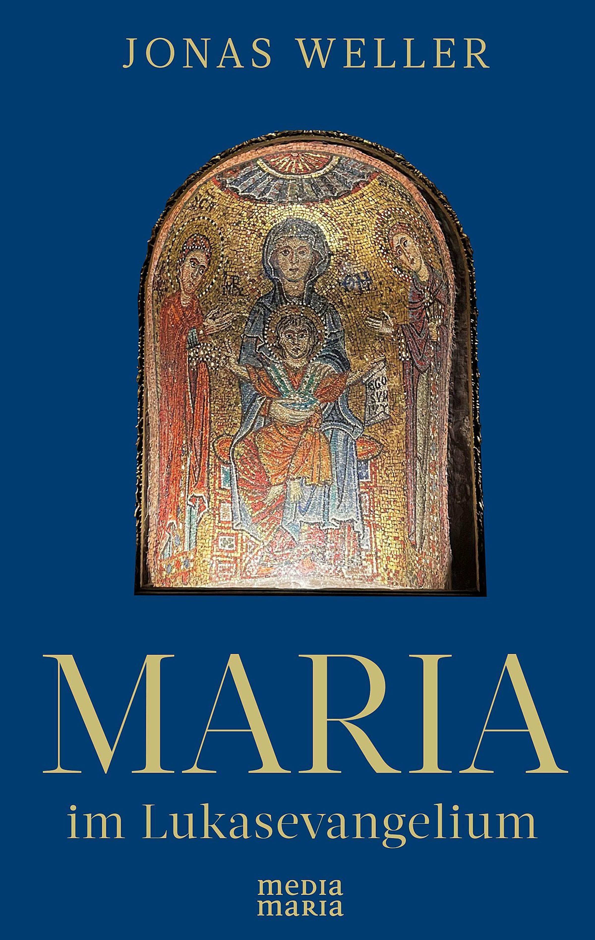 Text: "Jonas Weller", "MARIA im Lukasevangelium", "media maria". Illustration eines goldenen Mosaiks: Maria mit Kind., Buch