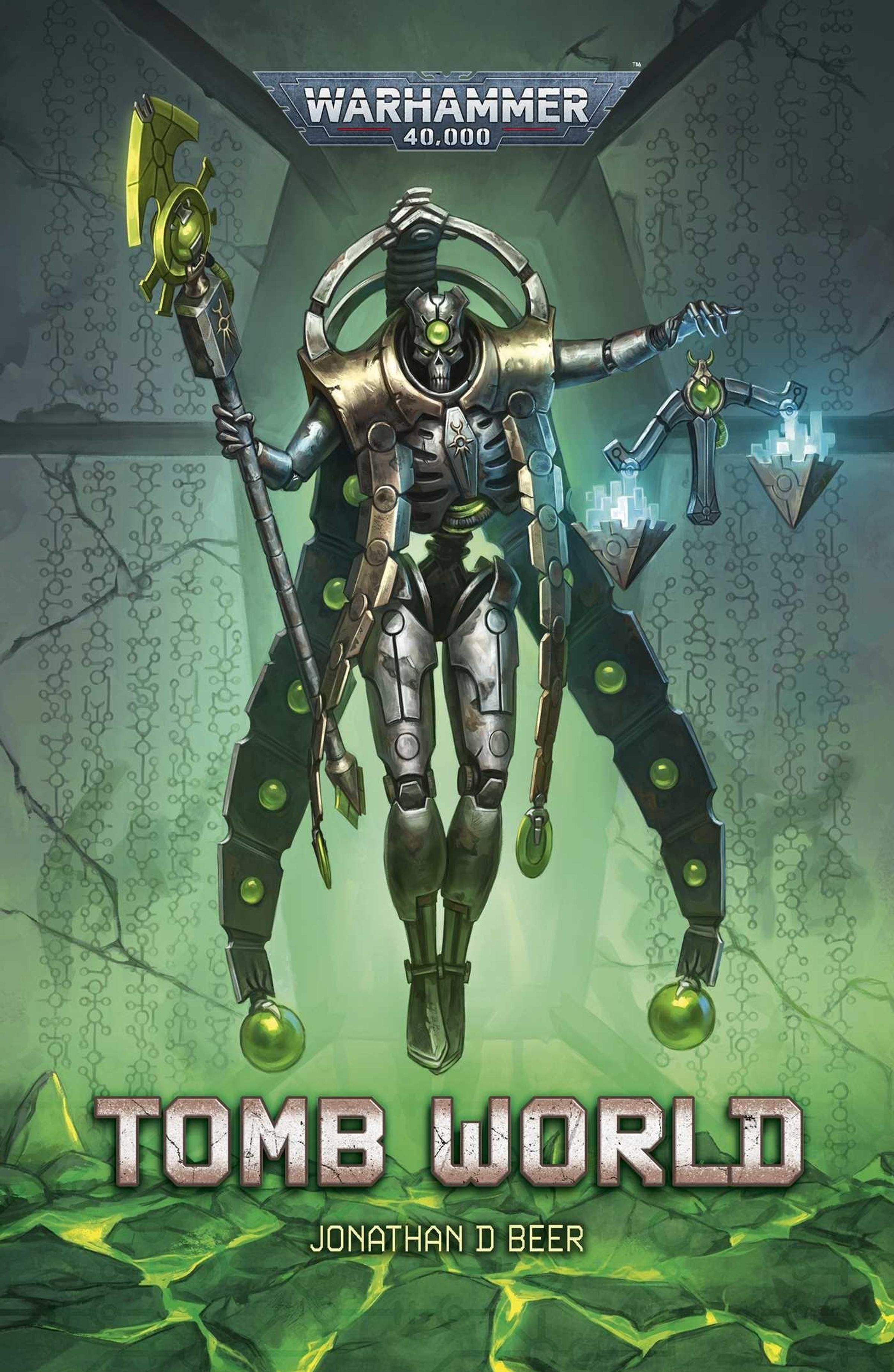 "Warhammer 40.000", "Tomb World", "Jonathan D Beer". Eine cybernetische Figur mit Stab, Energiequellen, grüne und metallische Töne., Buch