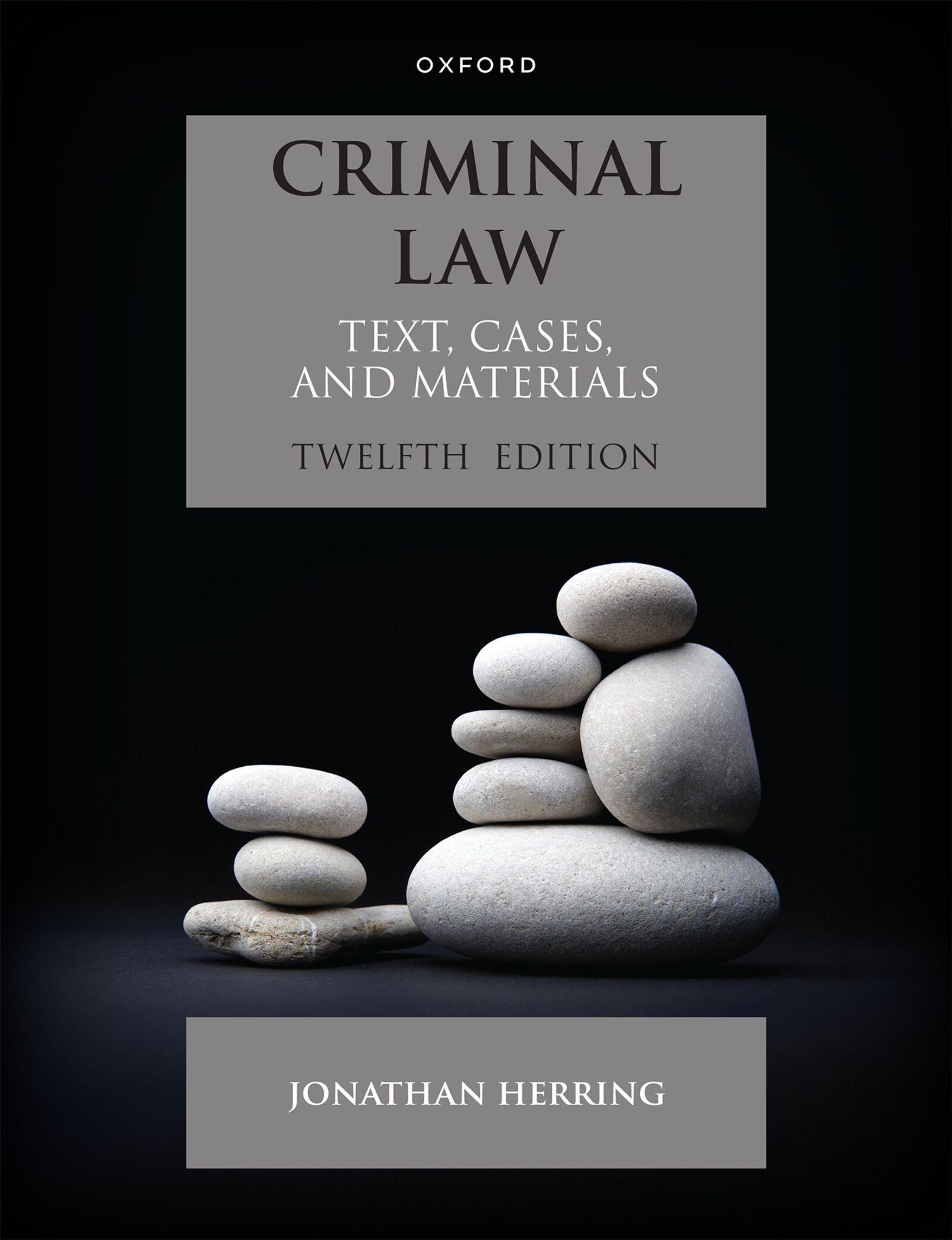 "Criminal Law", zwölfte Ausgabe, von Jonathan Herring. Stapel glatter, heller Steine auf schwarzem Hintergrund., Buch