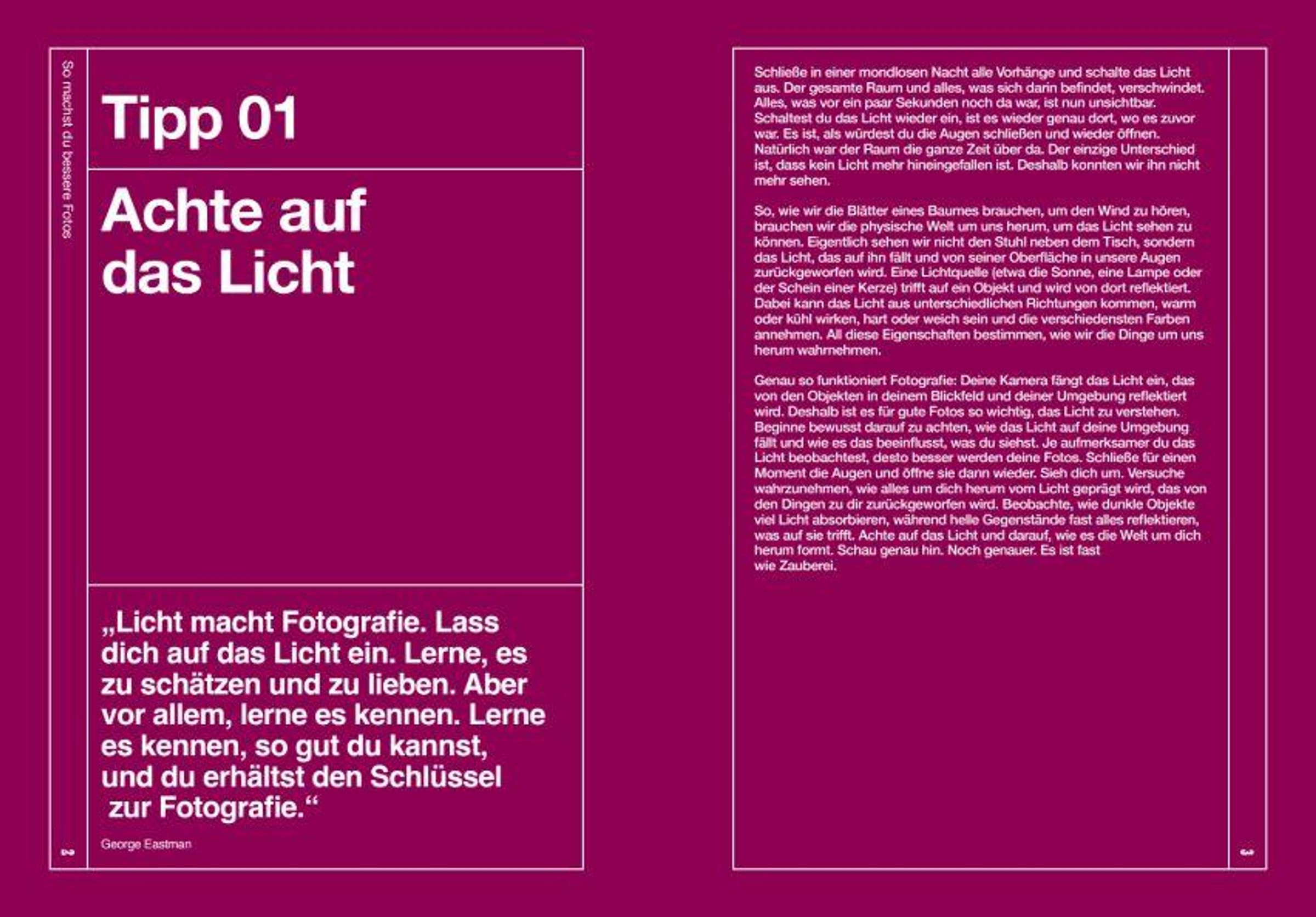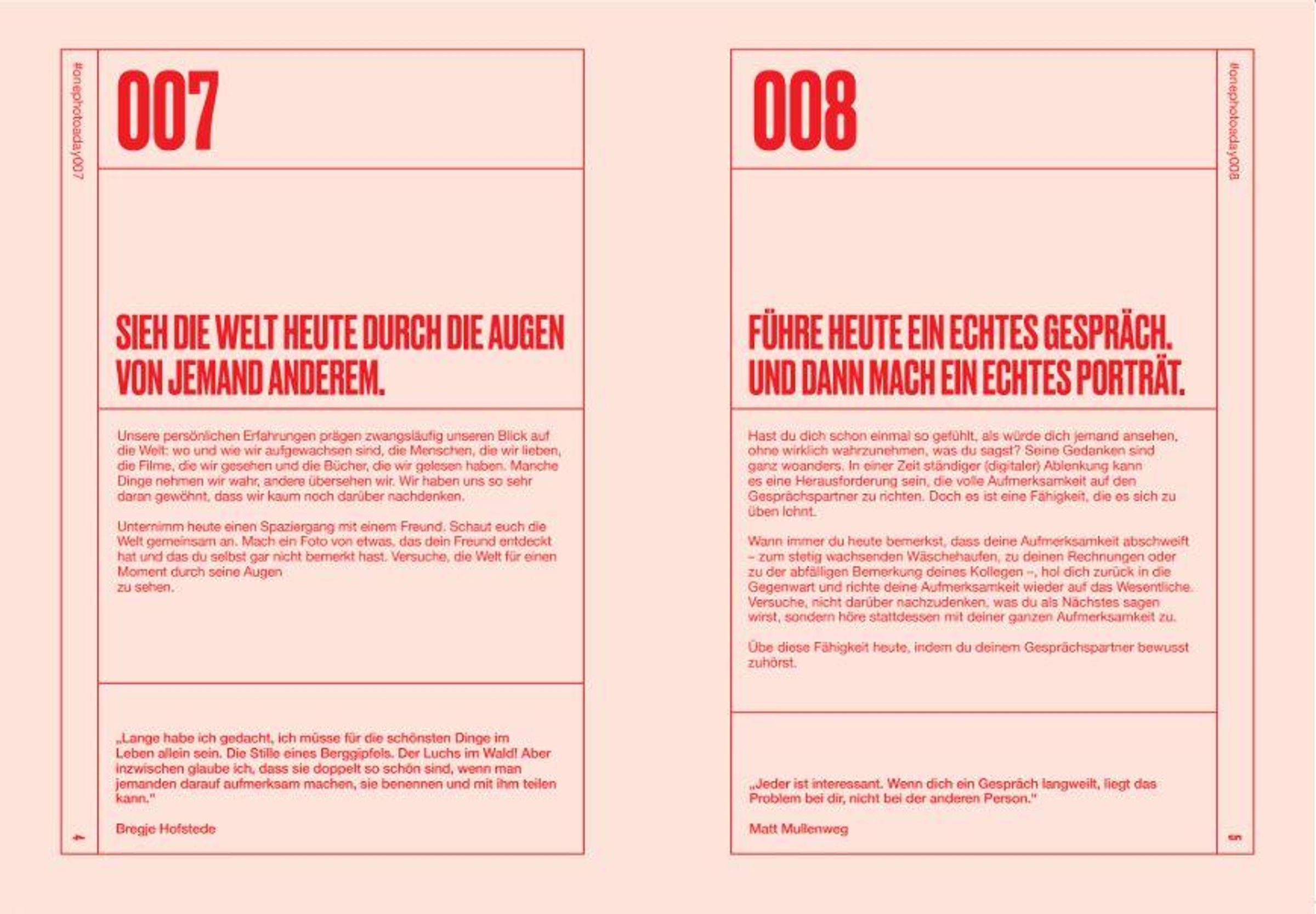 Ob mit einer hochwertigen Kamera oder einem Smartphones, jeder und jede kann durch Fotografie lernen, im Leben innezuhalten. Dieses Buch trägt mit 160 Foto-Challenges dazu bei, den Alltag zu verlangsamen und sich umzuschauen. Jede Challenge wird von einem Zitat von Denkerinnen, Schriftstellern, Künstlerinnen oder Philosophen als Inspiration angeführt - allesamt Experten in der Kunst des Schauens, Sehens und Seins. Wer sich einen Moment Zeit nimmt, ein durchdachtes Bild zu schaffen, schärft seinen Fokus und seine Kreativität. Die Foto-Challenge beginnt mit dem Aufschlagen des Buches und kann mit der Welt über einen Hashtag geteilt werden. Wie wird euer Foto heute aussehen?