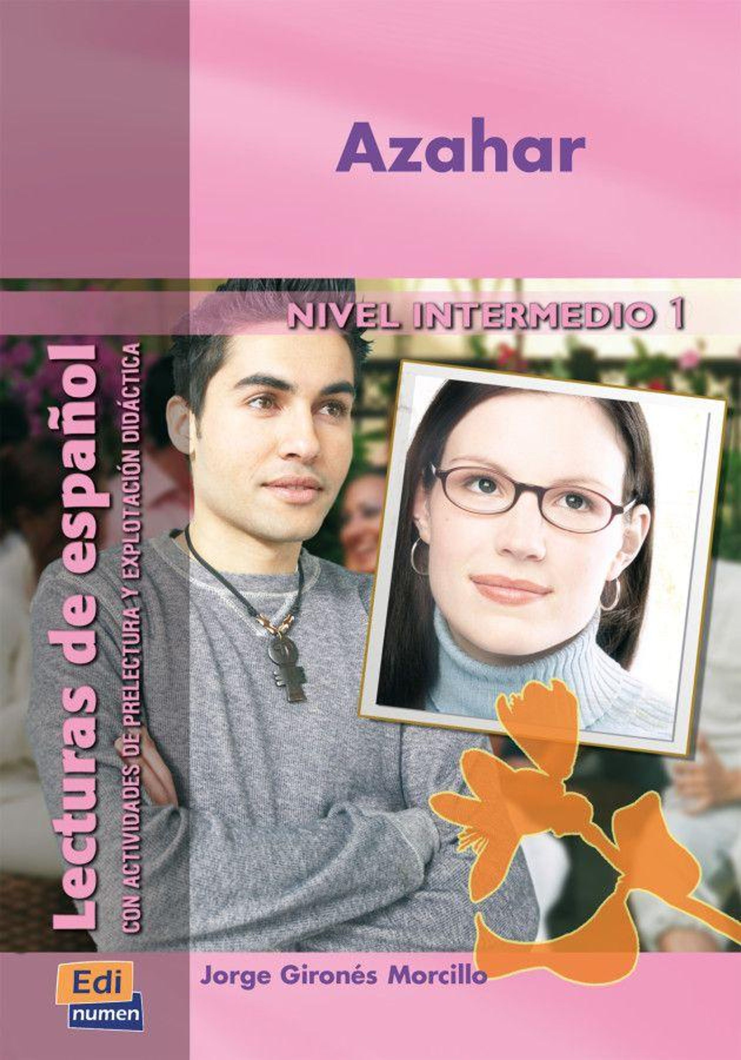 "Azahar", "NIVEL INTERMEDIO 1", "Lecturas de español". Ein Mann und eine Frau mit Brille, gelbe Blumenillustration unten., Buch