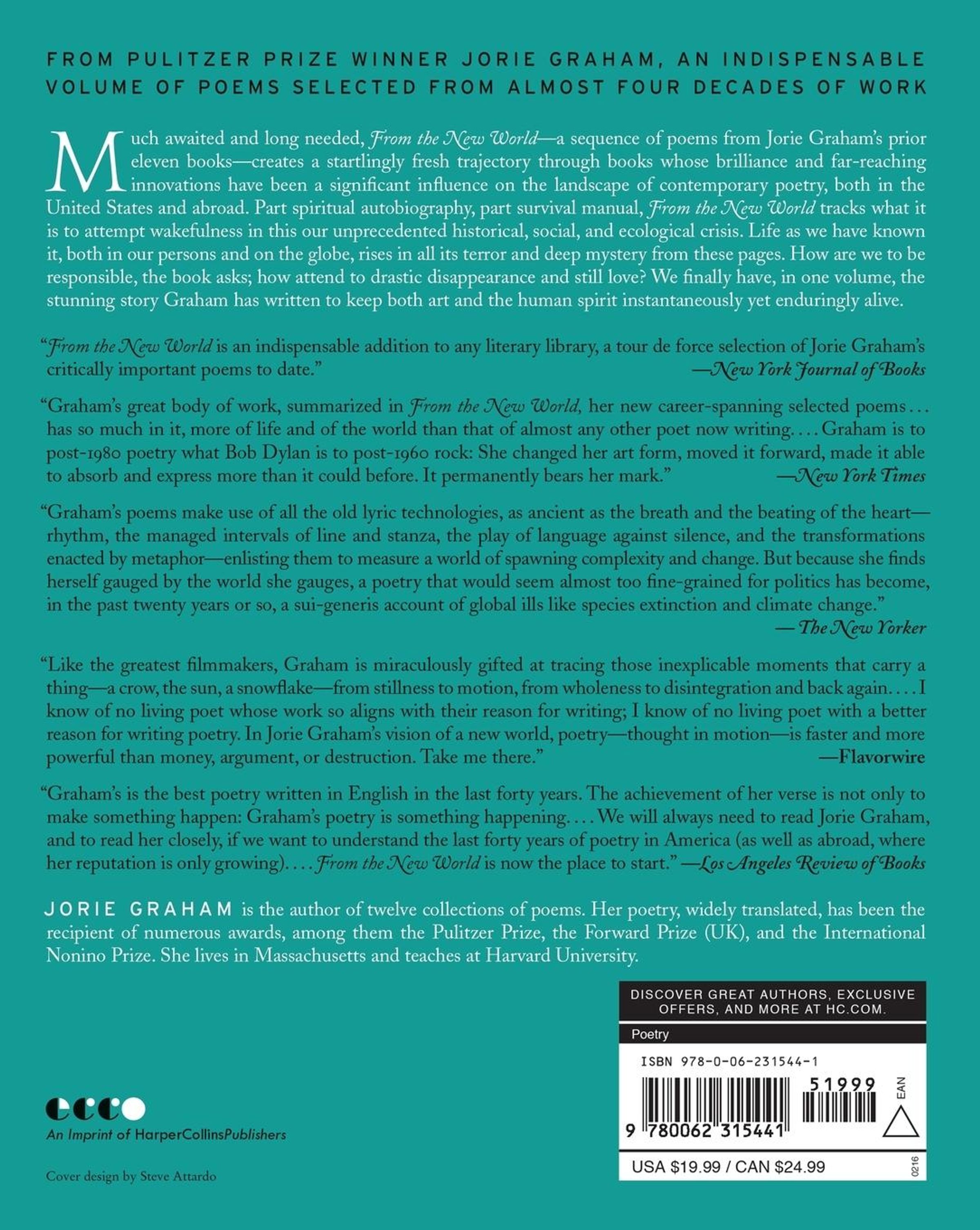 "Graham's is the best poetry written in English in the last forty years. The achievement of her verse is not only to make something happen: Graham's poetry is something happening....We will always need to read Jorie Graham, and to read her closely, if we want to understand the last forty years of poetry in America (as well as abroad, where her reputation is only growing)....From the New World is now the place to start." ---Los Angeles Review of Books