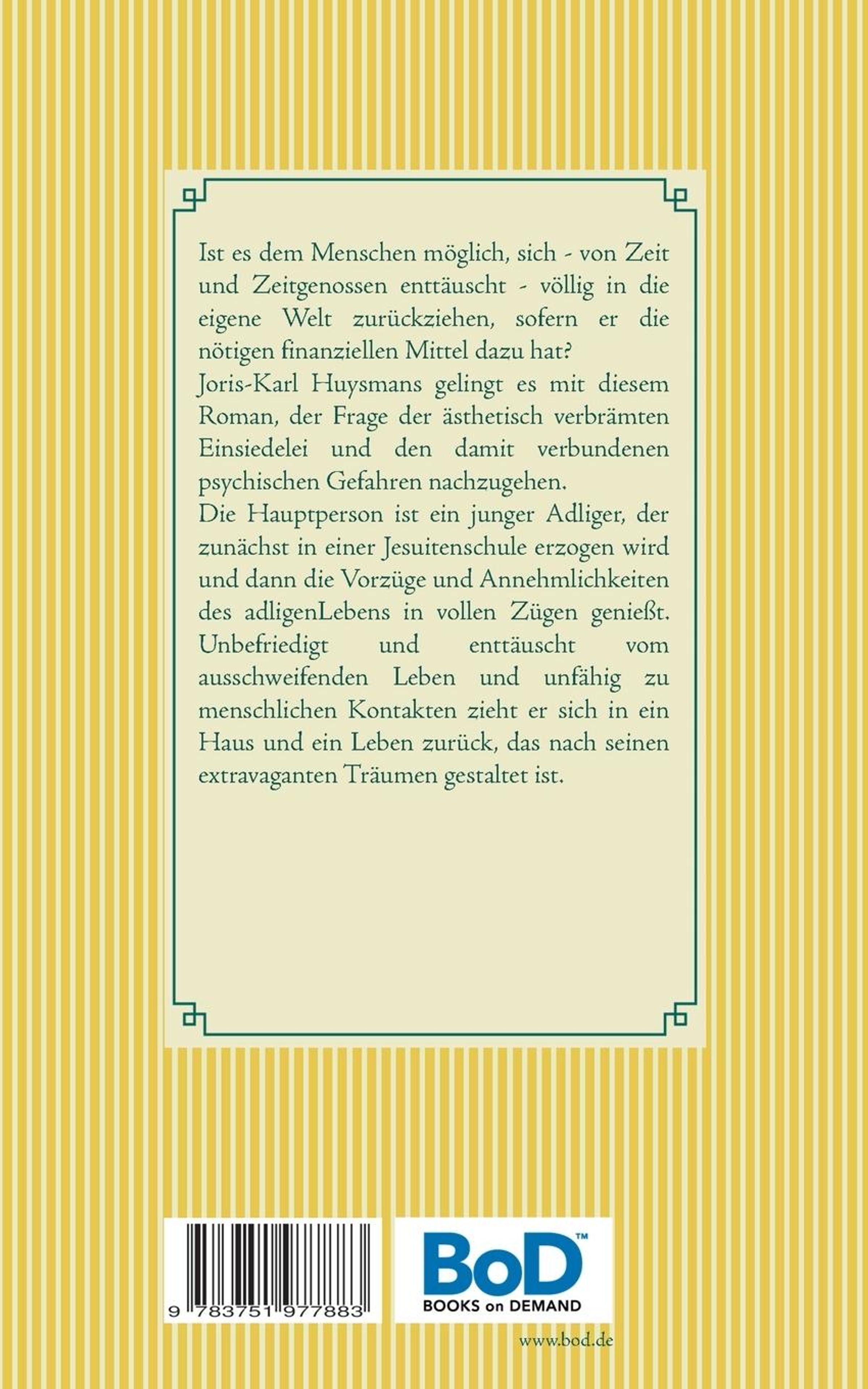 Ist es dem Menschen möglich, sich - von Zeit und Zeitgenossen enttäuscht - völlig in die eigene Welt zurückziehen, sofern er die nötigen finanziellen Mittel dazu hat? Joris-Karl Huysmans gelingt es mit diesem Roman, der Frage der ästhetisch verbrämten Einsiedelei und den damit verbundenen psychischen Gefahren nachzugehen. Die Hauptperson ist ein junger Adliger, der zunächst in einer Jesuitenschule erzogen wird und dann die Vorzüge und Annehmlichkeiten des adligen Lebens in vollen Zügen genießt. Unbefriedigt und enttäuscht vom ausschweifenden Leben und unfähig zu menschlichen Kontakten zieht er sich in ein Haus und ein Leben zurück, das nach seinen extravaganten Träumen gestaltet ist.