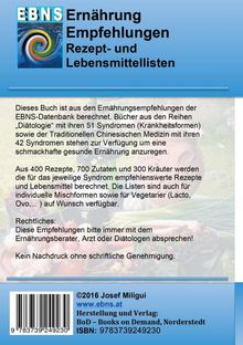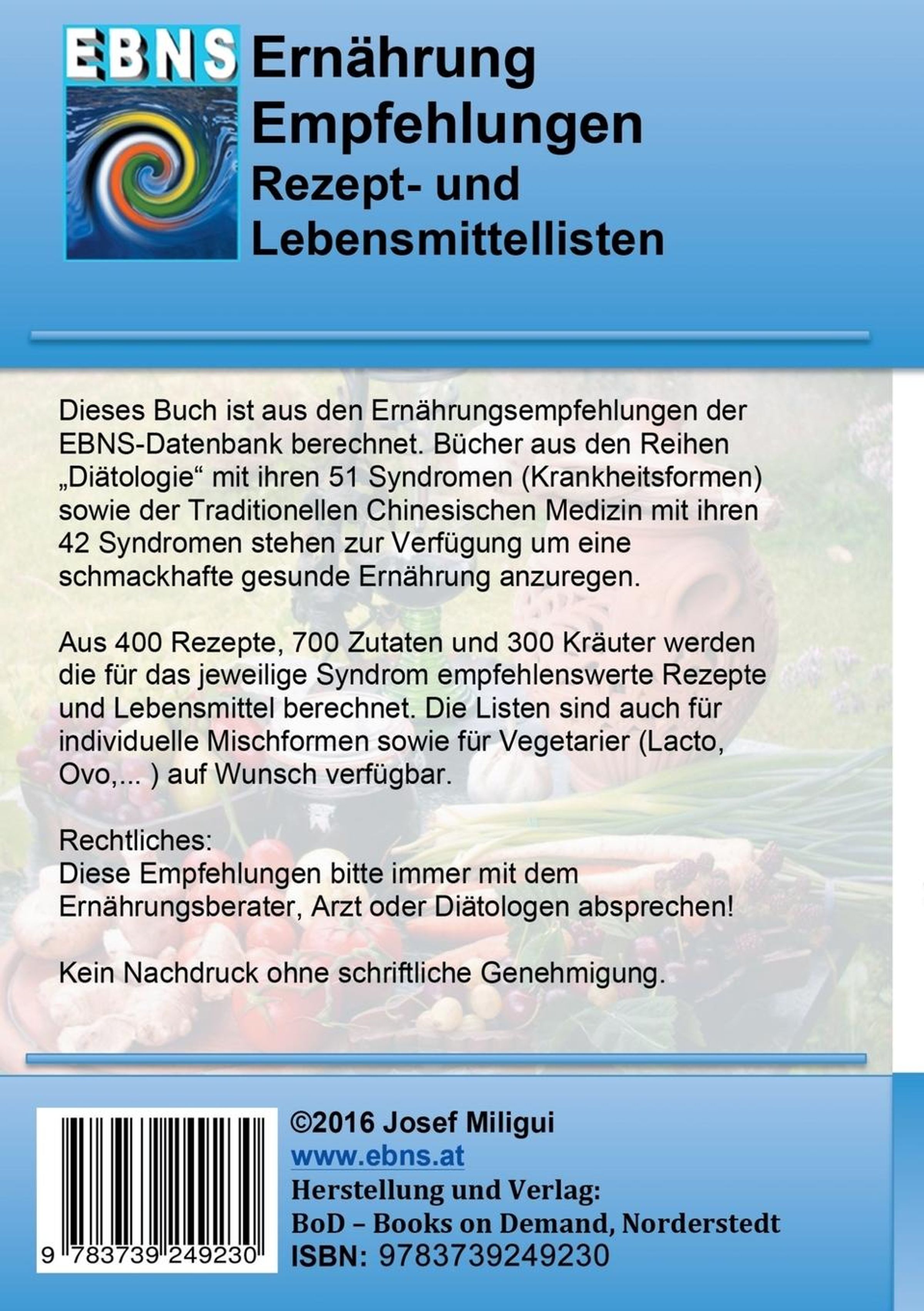 EBNS - Ernährungsberatung nach Syndromen - Rezepte- und Lebensmittellisten für die Unterstützung der schulmedizinischen Therapie für bei Hypertonie (Bluthochdruck). Harntreibende Lebensmittel, fettarme Ernährung, Gewichtsreduktion sofern Übergewicht besteht, weniger Salz. Vermeiden: Wenn Sie übergewichtig sind, sollte der Verzehr von Fetten/ (Vorsicht besonders bei versteckten Fetten z. B. in Wurst und Käse!), Kuchen / Gebäck, Süßwaren und Nüssen eingeschränkt werden. Alkohol und Nikotin meiden. Die Lebensmittel werden in Kategorien empfehlenswert, ja, weniger und nein angezeigt und helfen bei der Orientierung, wenn eigene Rezepte gekocht werden sollen.