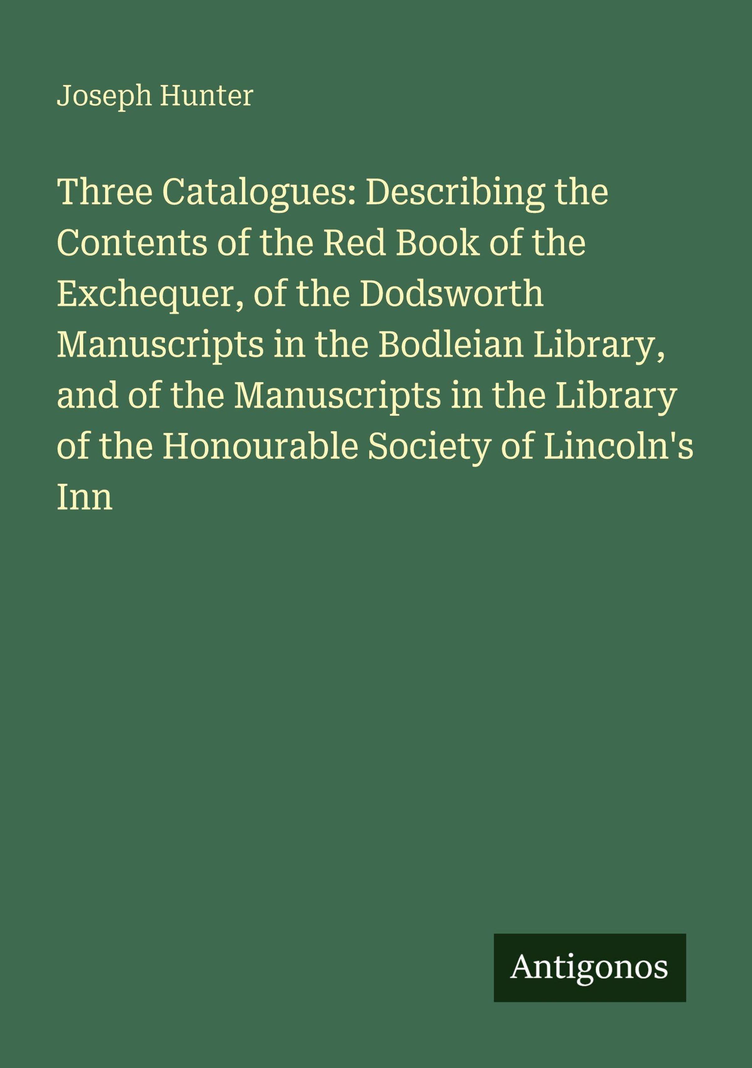 Three Catalogues: Describing the Contents of the Red Book of the Exchequer, of the Dodsworth Manuscripts in the Bodleian Library, and of the Manuscripts in the Library of the Honourable Society of Lincoln's Inn