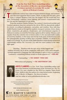 From the moment Charles Dickens, the century's best-loved novelist and London's greatest observer, arrived in the city in 1822, he obsessively walked its streets, recording its pleasures, curiosities and cruelties. Now, with him, Judith Flanders leads us through the markets, transport systems, rivers, slums, alleys, cemeteries, gin palaces, chop-houses and entertainment emporia of Dickens' London, to reveal the Victorian capital in all its variety, vibrancy, and squalor. From the colorful cries of street-sellers to the uncomfortable reality of travel by omnibus, to the many uses for the body parts of dead horses and the unimaginably grueling working days of hawker children, no detail is too small, or too strange. No one who reads Judith Flanders's meticulously researched, captivatingly written The Victorian City will ever view London in the same light again.