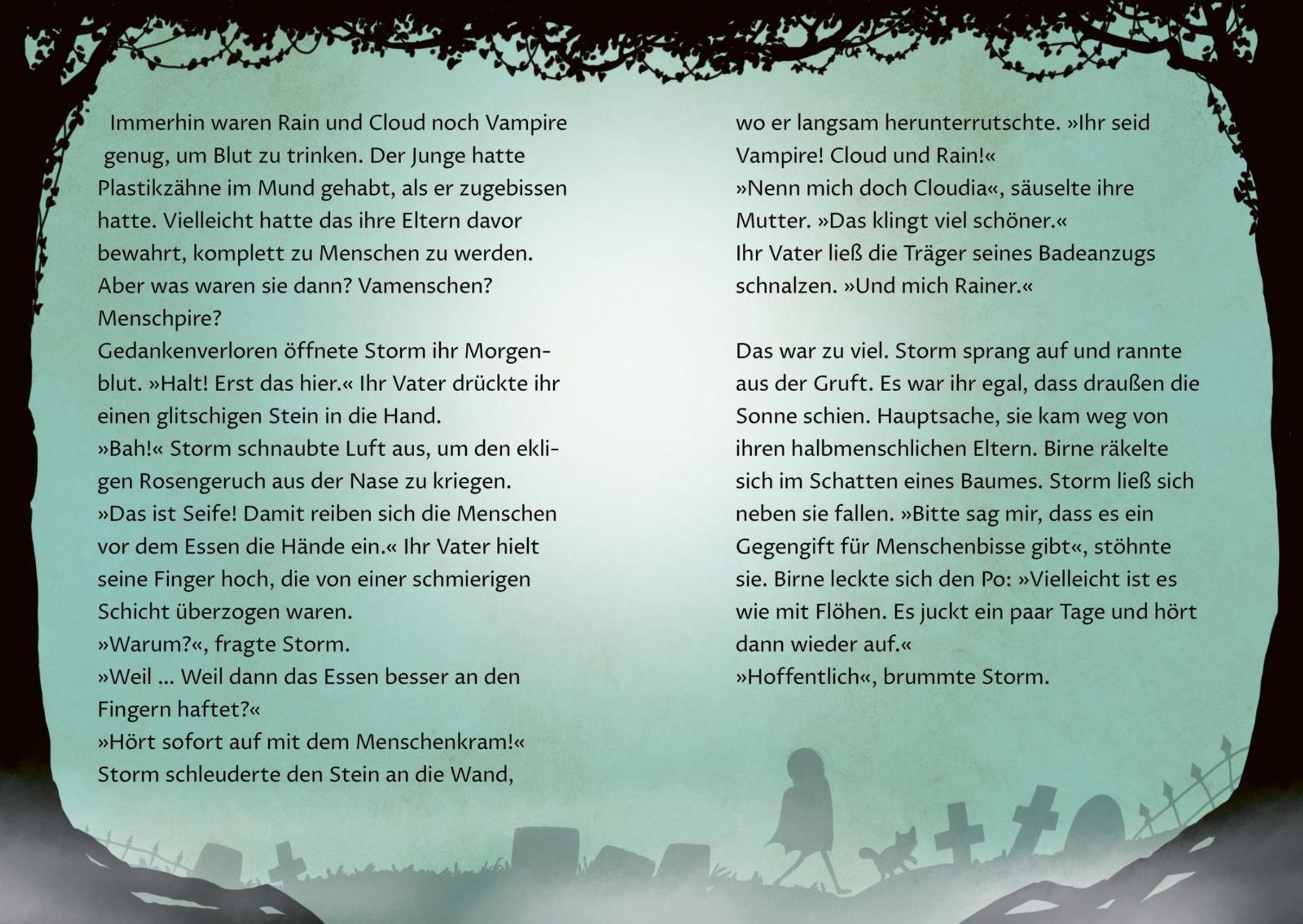 "Ich bin böse!" - davon ist Vampirmädchen Storm überzeugt. Doch als ihre Eltern nach einem folgenschweren Biss auf einer Halloweenparty plötzlich halb menschlich werden, landet sie statt an der legendären Blutspuck-Akademie im Menscheninternat Burg Zuckerhut . Mit ihrer Glühkatze Birne und dem Plan, durch einen fiesen Streich möglichst schnell wieder von der Schule zu fliegen , stolpert sie in eine Welt voll seltsamer Kinder, die Spaghetti-Würmer essen, Mathe lernen und sich von Mitschülern ärgern lassen, ohne zurückzubeißen. Alles kommt anders als erwartet: Storms Streiche laufen gehörig aus dem Ruder, und anstatt sie zu bestrafen, sieht die Schulleiterin in ihrer Schülerin stets das Gute. Und dann ist da auch noch ihre Zimmerkollegin Fee, die unerschütterlich zu ihr hält. Storm muss herausfinden, wer sie wirklich sein will . Während sie versucht, nicht aufzufliegen und einen verdächtigen Mitschüler in Schach zu halten, entdeckt sie schließlich etwas, das unheimlicher ist als Sonnenlicht: echte Freundschaft.