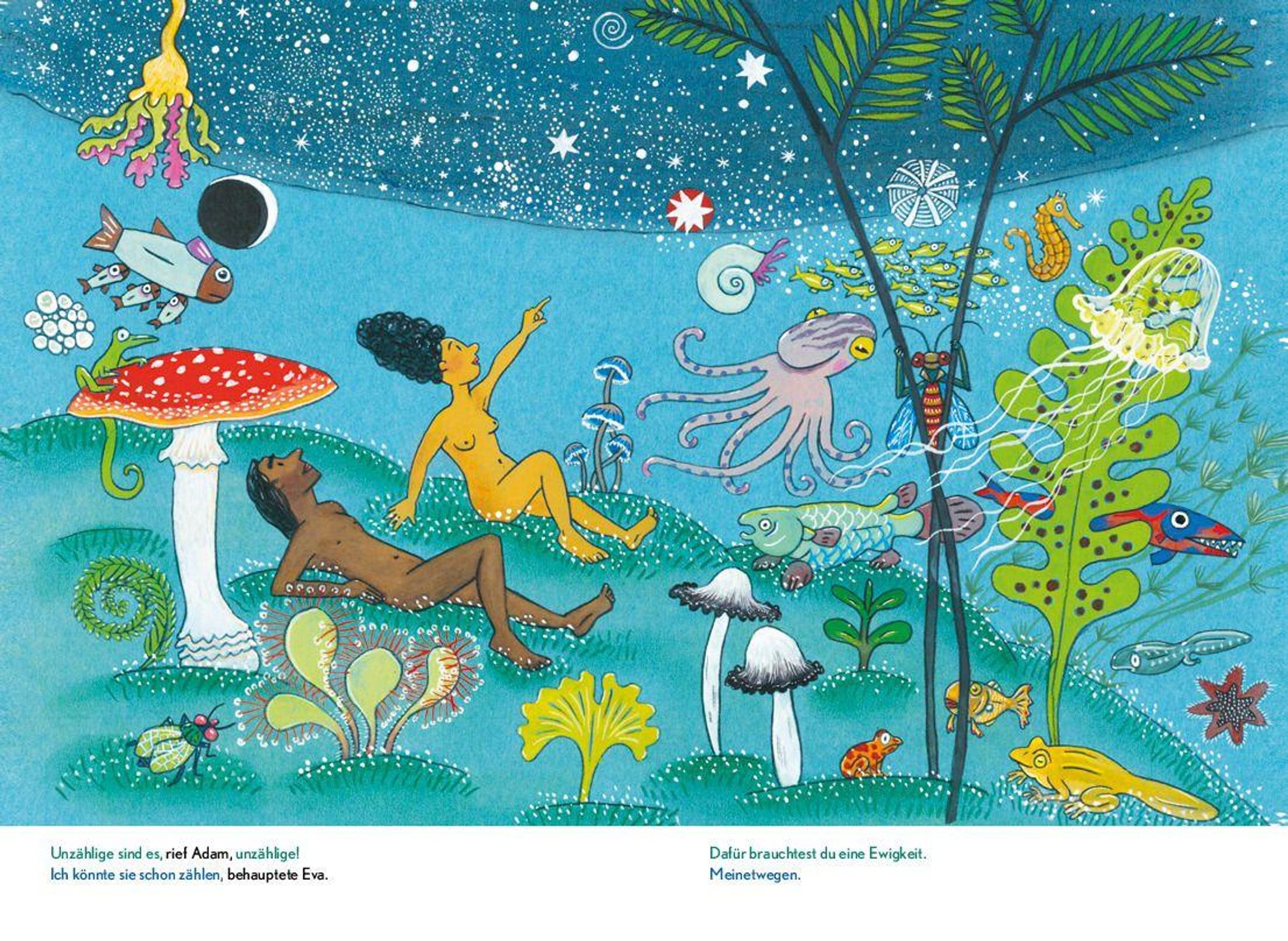 Die kleine Geschichte von Jürg Schubiger - entdeckt im Nachlass des großen Schweizer Autors - blickt in eine ferne Nacht. In eine Zeit, in der noch alles heil ist und ewig dauert. Adam und Eva liegen auf einem Polster aus Moos und schauen in die Sterne, dicht wie Schneeflocken. Um sie herum alles, was sie brauchen und mehr. So groß ist die Fülle, dass Eva es mit einem Mal überhat: Ewig dieses Paradies, diese Gnus und Kakadus - uns bleibt ja nichts zu wünschen übrig! Ratlos sieht Adam ihre Tränen und zu seiner eigenen und Evas Überraschung macht er plötzlich eine Erfindung: den Kuss. Paradiesisch, flüstert Eva. Illustratorin Rotraut Susanne Berner hat sich einmal mehr von Jürg Schubiger inspirieren lassen: Parallel zu seiner Erzählung aus dem Paradies entfalten ihre grandiosen Bilder eine ganze, leuchtende Schöpfungsgeschichte.