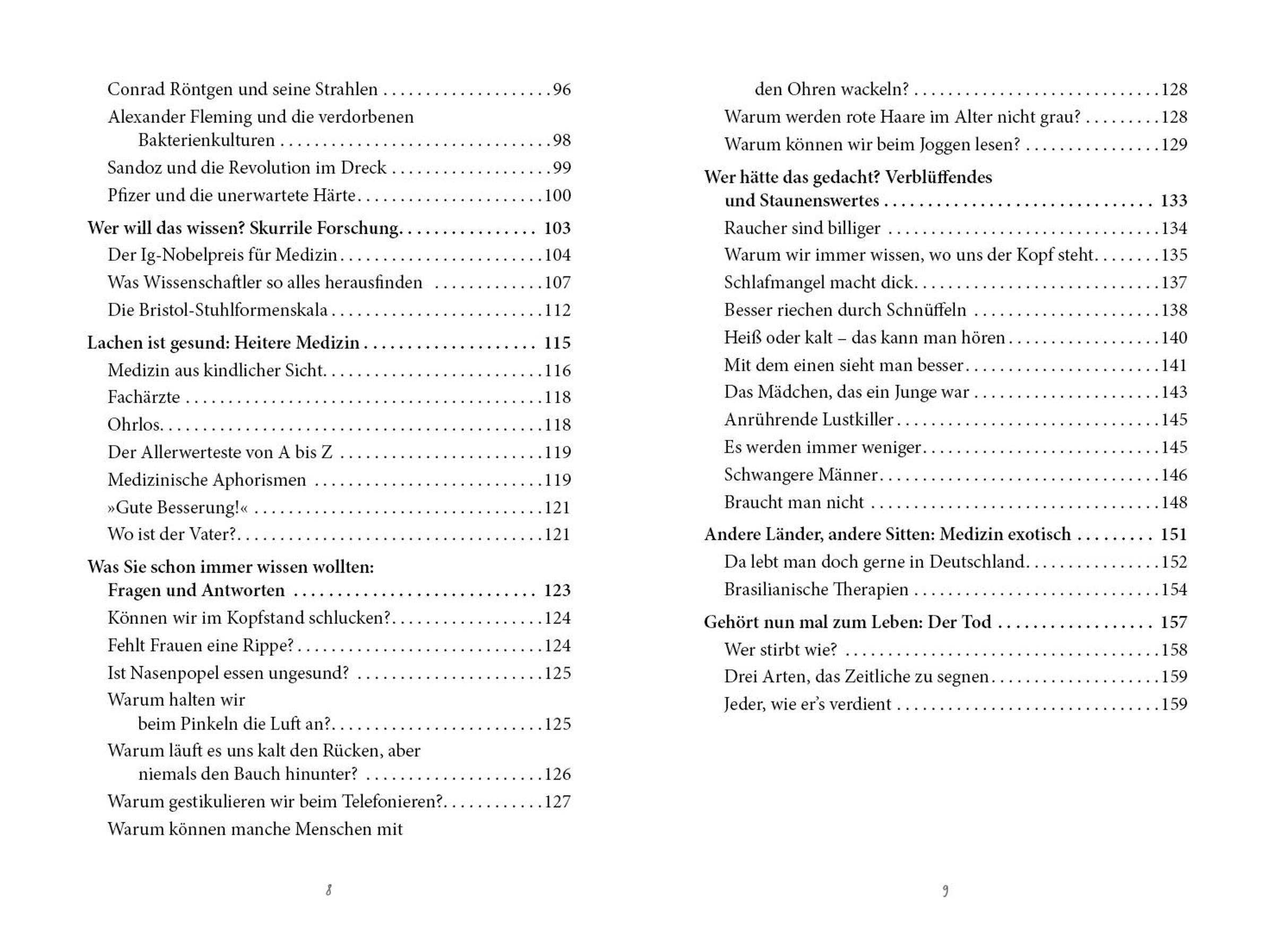 Dieses Buch wird Sie mit medizinischen Fakten überraschen, von denen Sie noch nie gehört haben. Es berichtet von spleenigen Halbgöttern in Weiß, von Krankheiten, die kaum ein Arzt kennt, von unglaublichen Rekorden und skurrilen Forschungen. Erfahren Sie, welche Schönheits-OPs bei uns am beliebtesten sind, wie die Größe des Gehirns mit der Intelligenz zusammenhängt oder wie man im Nordosten Brasiliens Kopfschmerzen therapiert. Lesen Sie von den skurrilen Anfängen der Medizin, als man hochgiftiges Blei oder Leichenteile als Medikamente einsetzte. Staunen Sie über die unglaublichen Höchstleistungen unseres Körpers, über seltsame Beschwerden, kuriose Patienten und Sternstunden der medizinischen Forschung. Egal wie gut vorgebildet Sie sind - dieses Buch wird Ihr medizinisches Wissen bereichern.