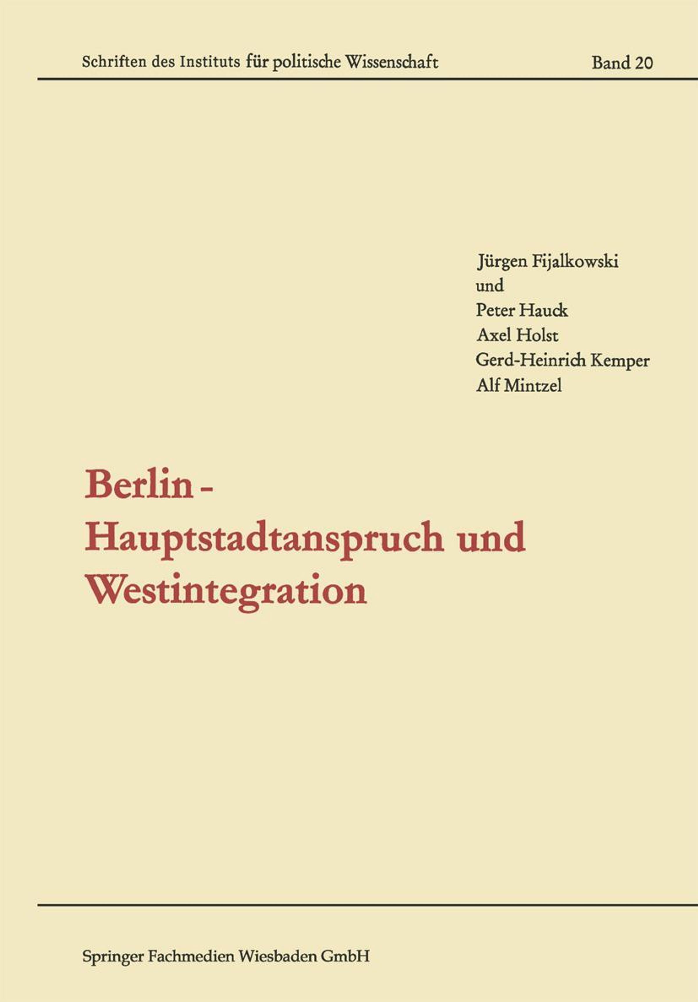 Vorbemerkung.- Gründung, Ostentflechtung und Westintegration der Berliner Parteien und Gewerkschaften.- Probleme und Praxis der Einbeziehung Berlins in die Rechtsordnung der Bundesrepublik.- Schwierigkeiten der Eingliederung West-Berlins in die Wirtschaftlichen und Sozialen Ordnungen Westdeutschlands.- Schlussbemerkung.