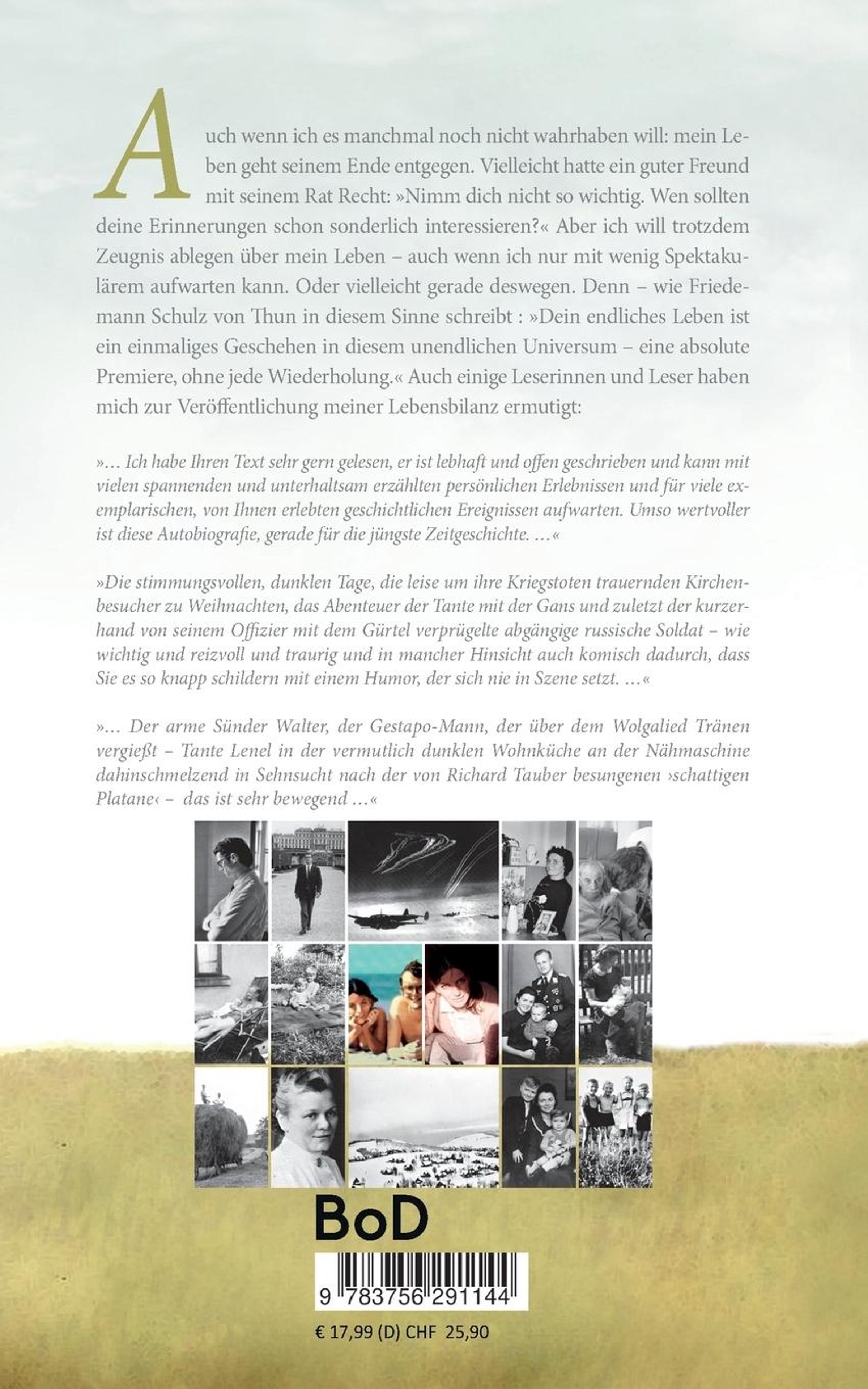 Auch wenn ich es manchmal noch nicht wahrhaben will: mein Leben geht seinem Ende entgegen. Vielleicht hatte ein guter Freund mit seinem Rat Recht: >>Nimm dich nicht so wichtig. Wen sollten deine Erinnerungen schon sonderlich interessieren?<< Aber ich will trotzdem Zeugnis ablegen über mein Leben - auch wenn ich nur mit wenig Spektakulärem aufwarten kann. Oder vielleicht gerade deswegen. Denn - wie Friedemann Schulz von Thun in diesem Sinne schreibt : >>Dein endliches Leben ist ein einmaliges Geschehen in diesem unendlichen Universum - eine absolute Premiere, ohne jede Wiederholung.<< Auch einige Leserinnen und Leser haben mich zur Veröffentlichung meiner Lebensbilanz ermutigt: