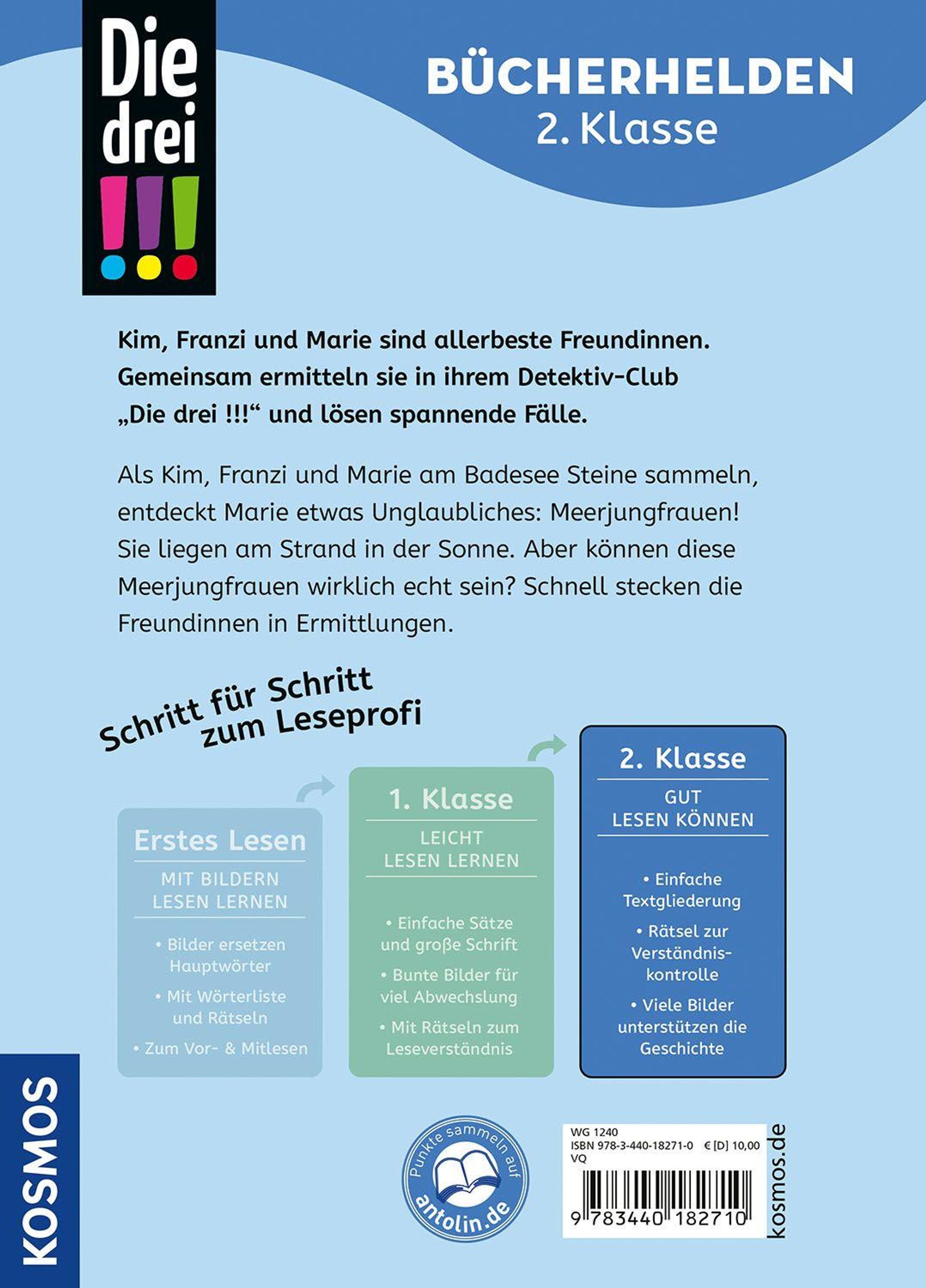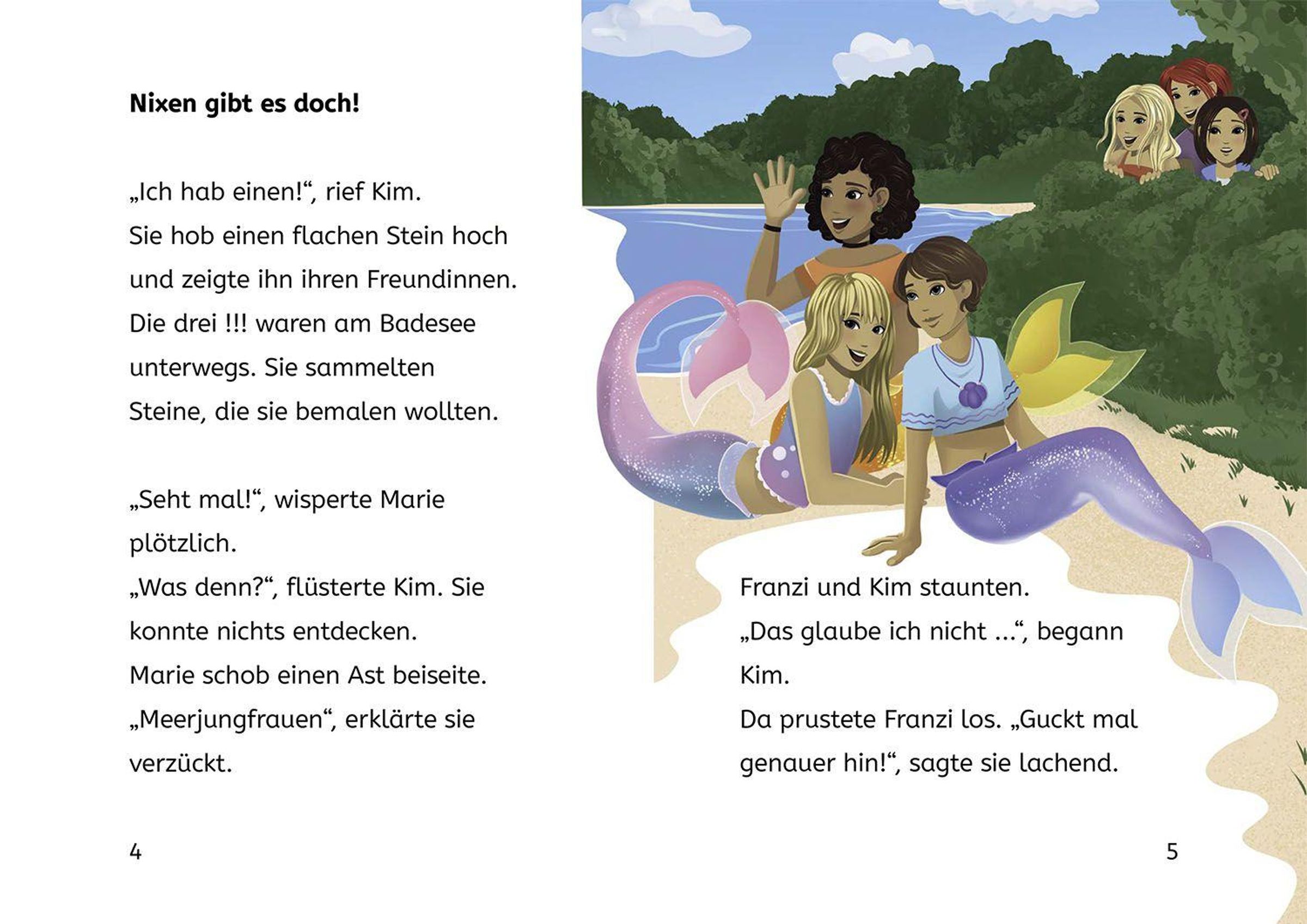 Kim, Franzi und Marie verbringen einen entspannten Tag am Badesee und sammeln Steine. Doch plötzlich entdecken sie Meerjungfrauen am Strand - sind sie echt oder nur ein Trick? Neugierig wie immer, beginnen die drei !!! zu ermitteln und stoßen auf ein spannendes Geheimnis. In diesem aufregenden Fall der "Bücherhelden"-Reihe begleiten die Leser die drei Detektivinnen in acht spannenden Kapiteln. Mit einfacher Schrift, vielen vierfarbigen Bildern und Rätseln zum Leseverständnis ist dieses Abenteuer ideal für Kinder ab der zweiten Klasse.
