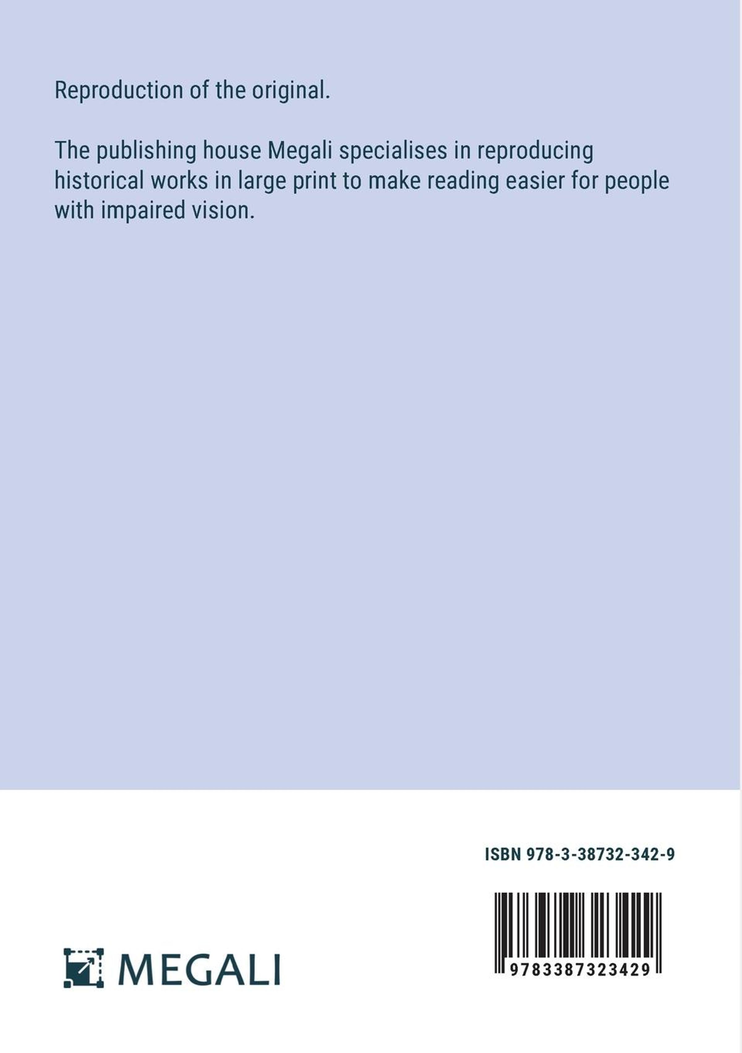 Reproduction of the original. The publishing house Megali specialises in reproducing historical works in large print to make reading easier for people with impaired vision.