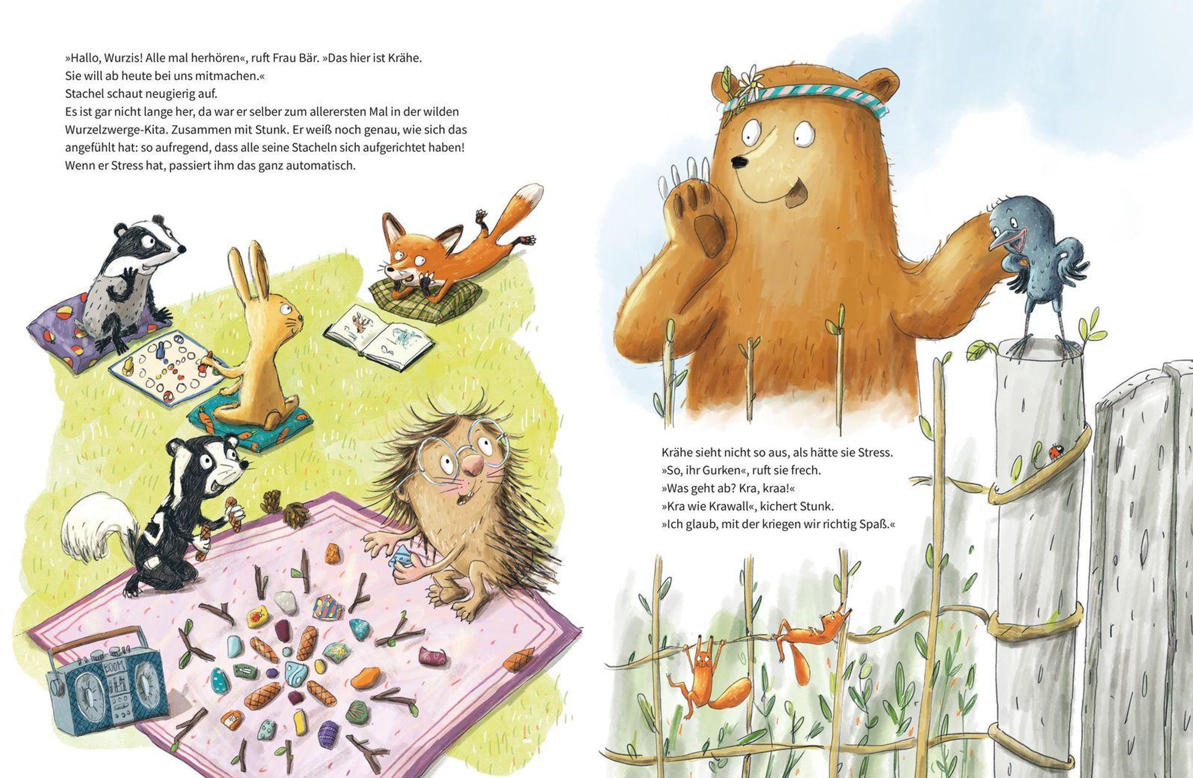 Als Krähe neu in die Wurzelzwerge-Kita kommt, bringt sie die Gruppe ziemlich durcheinander: Krähe ist kackfrech, kann den Schnabel einfach nicht halten und sie schummelt bei 'Auf die Plätze, fertig, los!'. Klar, mit so einem komischen Vogel tun sich die anderen erst mal ganz schön schwer. Nicht mal Stunk, der erst mal seine Pupskanone anwirft. Auch Frau Bär ist ratlos. Als Stachels liebster Glitzerstein verschwindet und der Verdacht auf Krähe fällt, gehen Stachel und Stunk der Sache auf den Grund. Schließlich hatten sie es auch nicht leicht in ihren ersten Kita-Tagen. Und tatsächlich finden sie heraus, was sich hinter Krähes wildem Verhalten verbirgt - und dass sie eigentlich eine echt coole Freundin ist!