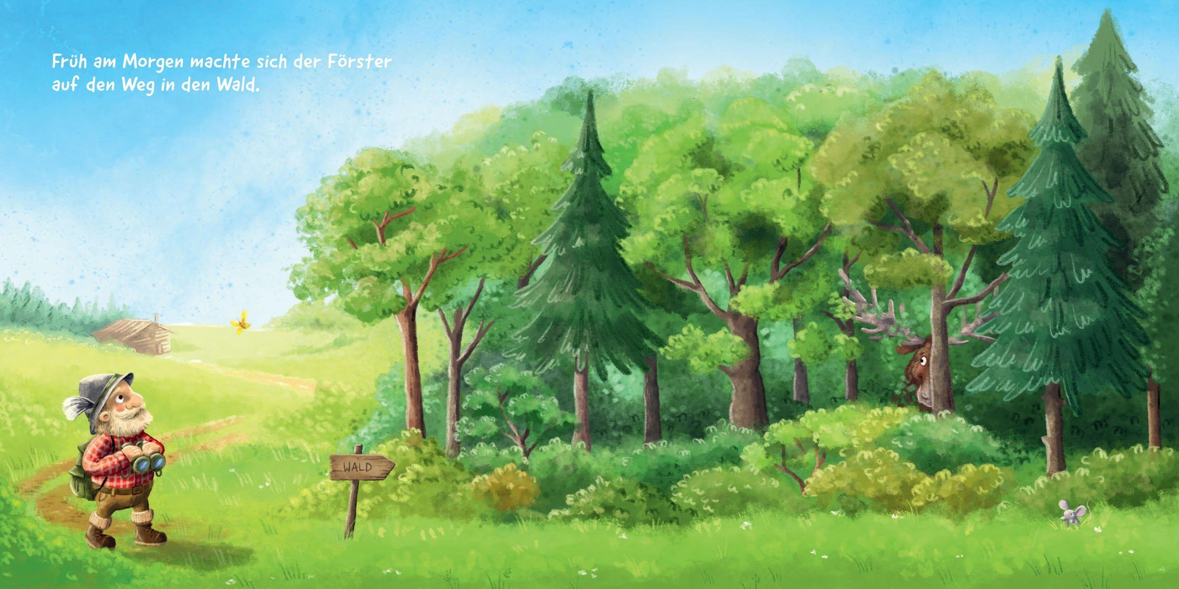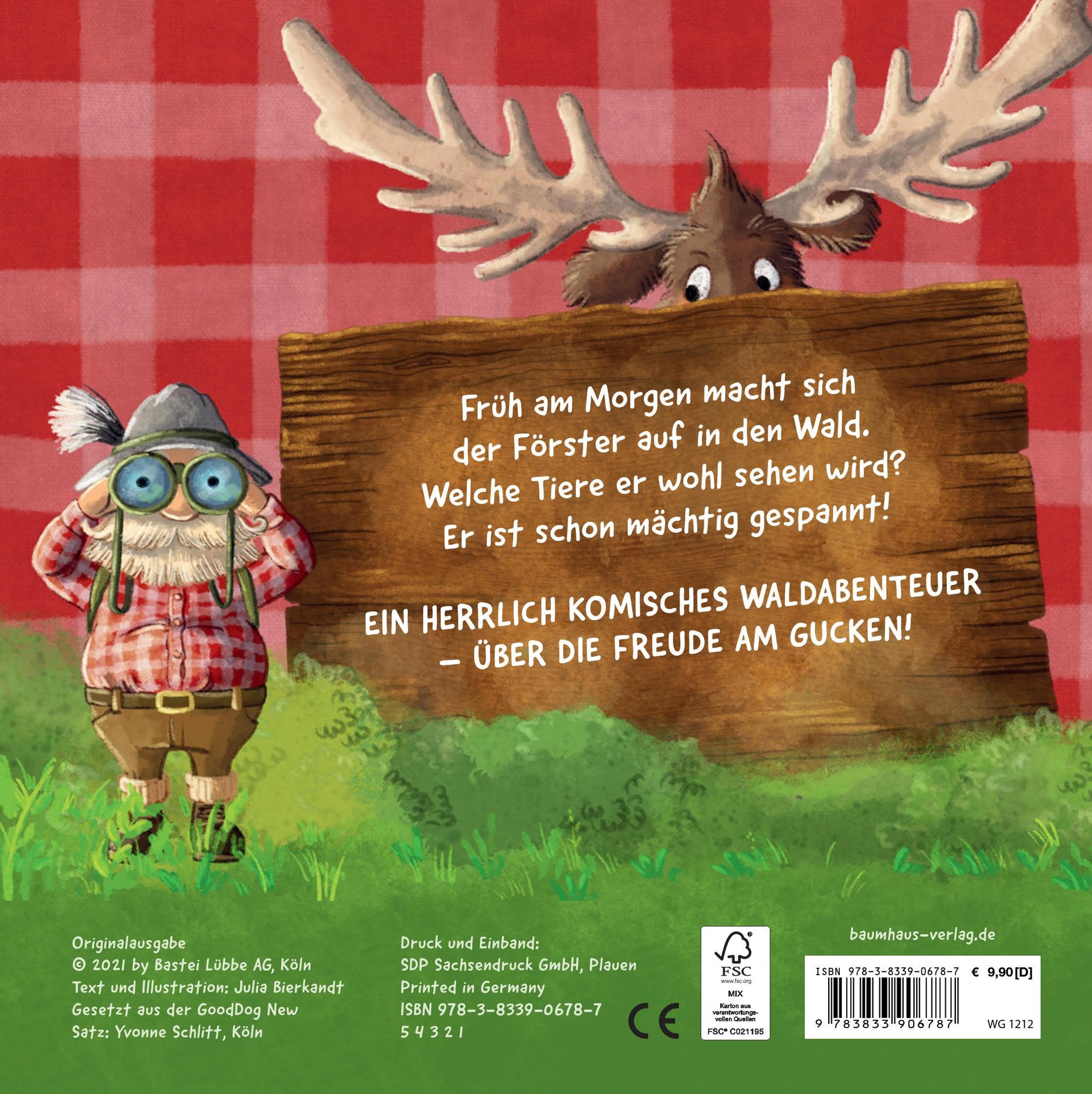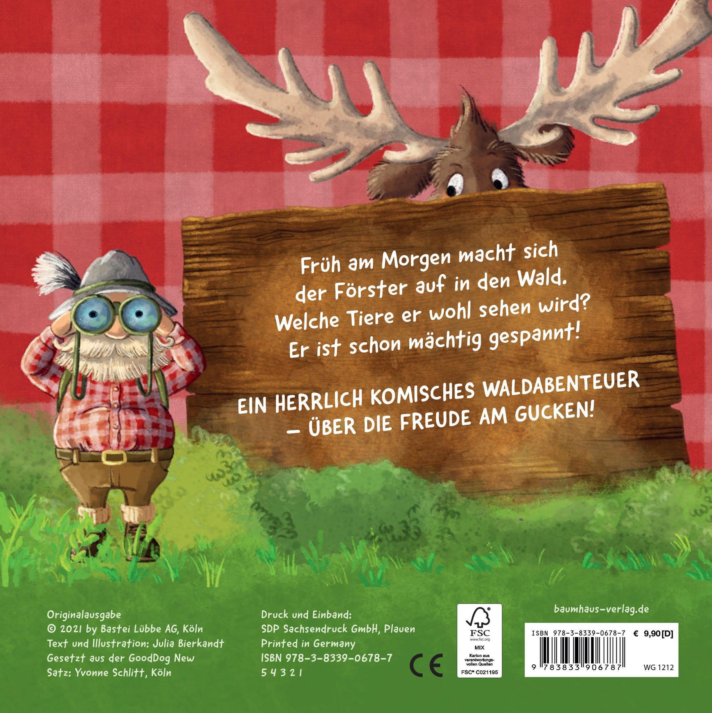 Früh am Morgen zieht der Förster los, um die Tiere im Wald zu beobachten. Doch irgendwie kann er heute so gar nichts auf der Lichtung entdecken. Kein Wunder, denn während er guckt und guckt, reihen sich hinter seinem Rücken immer mehr Tiere auf: das Eichhörnchen, die Maus, der Elch, der Hase, das Wildschwein und der kleine Waschbär. Alle möchten sie wissen, was der Förster da wohl Spannendes beobachtet ...