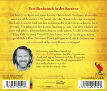 Ein Brief? Für Tafiti und seine Familie? Tatsächlich. Entfernte Verwandte möchten sie besuchen. Begeistert bereiten Tafiti und seine Familie alles vor und graben sogar ein gemütliches Gästezimmer. Die Freude über das Wiedersehen ist riesengroß: Zula und Jabari haben ihre drei Töchter und Opapipa und Omamima mitgebracht. Sie wissen: Anders als auf der kleinen, ruhigen Insel, von der sie kommen, lauern in der Savanne viele Gefahren. Vor allem vor den Löwen fürchten sie sich. Von denen haben sie schon viel gehört, aber gesehen haben sie noch keinen. Daher halten sie zunächst jedes Tier, das ihnen begegnet, für einen Löwen - selbst Pinsel! Die Erdmännchen haben vor allem und jedem Angst. Da sie auf ihrer Insel ganz alleine leben, kennen sie keine anderen Tiere. Tafiti kann seine Verwandten aber beruhigen: Die Tiere sind alle seine Freunde. Als die Erdmännchen mutiger werden und auch King Kofi auch für einen Freund Tafitis halten, wird es für sie jedoch ganz schön gefährlich. Sie entdecken King Kofis Speisekammer und wollen sich daraus bedienen. Seine Majestät ist völlig außer sich. Er sperrt sie kurzerhand in der Speisekammer ein und plant seine nächste Mahlzeit: Erdmännchenbraten. Nun müssen Tafiti und Pinsel einschreiten. Eine Rettungsaktion wird gestartet...
