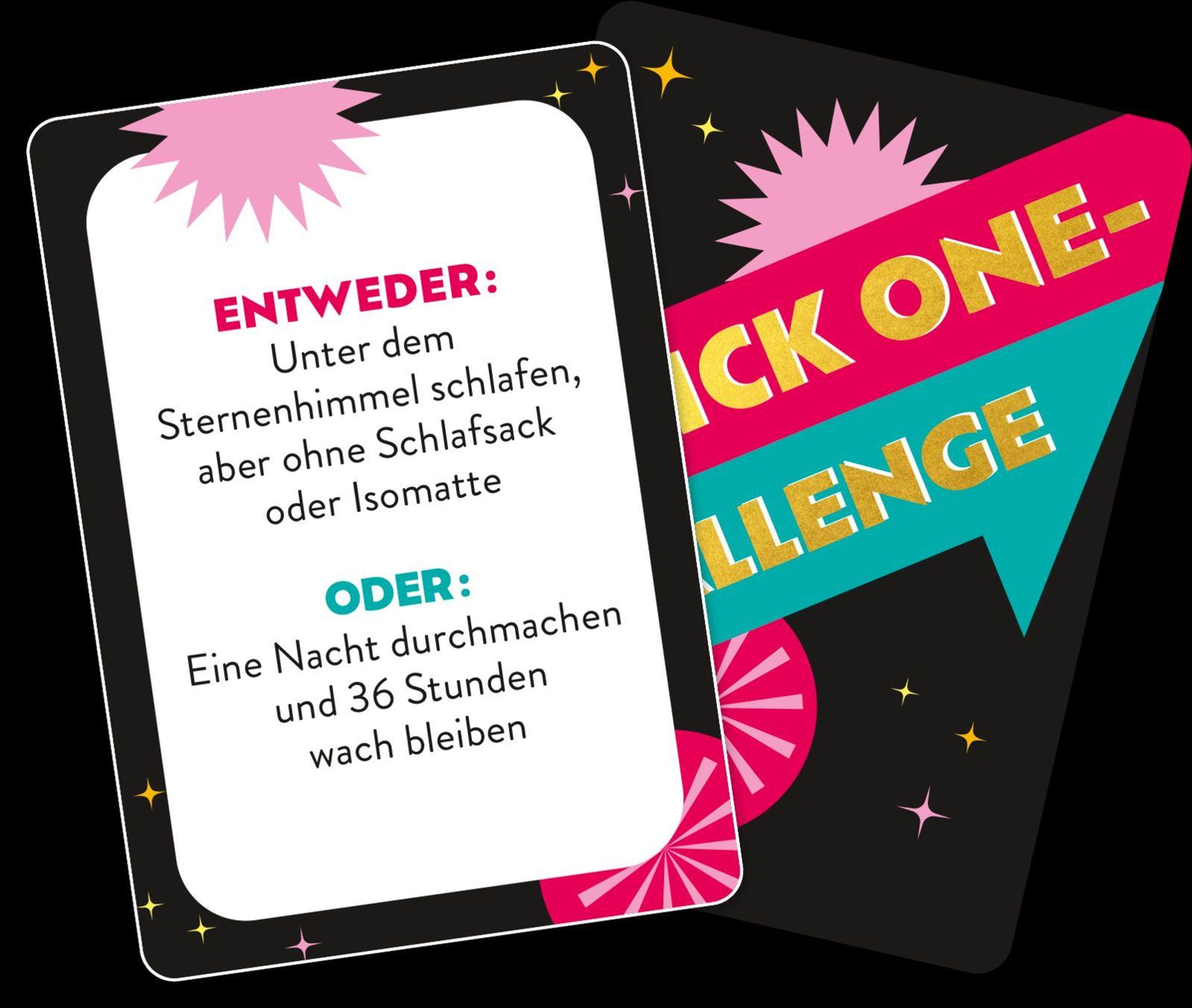 Würdest du lieber mit Tieren sprechen oder in der Zeit reisen können? Würdest du lieber die Zukunft voraussagen oder die Vergangenheit ändern können? Und würdest du lieber ein Jahr ohne Internet verbringen oder ein Jahr ohne Smartphone? Bei diesem unterhaltsamen Partyspiel stellt ihr euch 50 spannenden Challenges , bei denen ihr euch für eine entscheiden müsst. Perfekt für lustige Momente und spannende Diskussionen bei der nächsten Party oder beim Spieleabend mit Freunden.