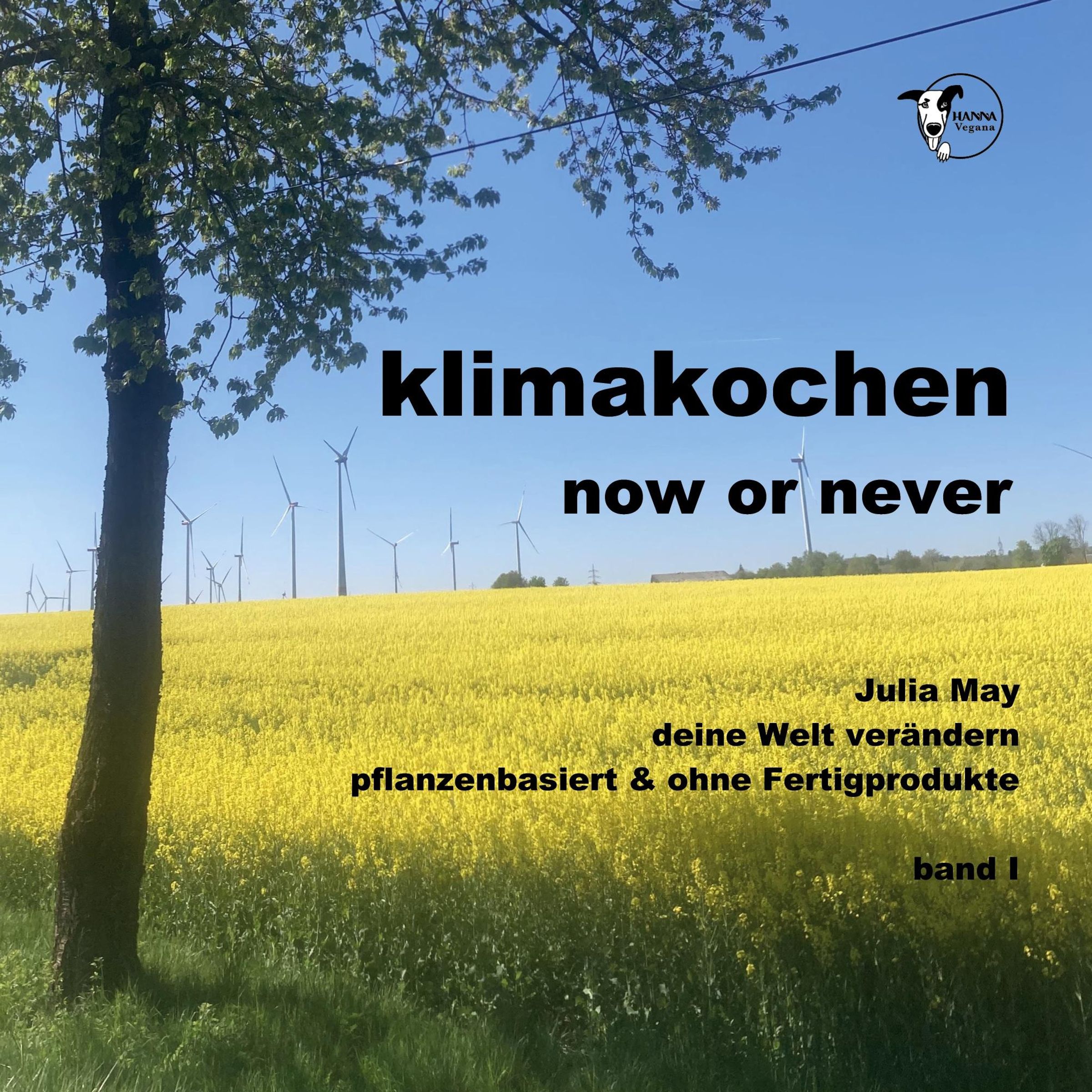 Klimakochen: now or never. Julia May. Unter einem Baum mit Windrädern und gelbem Feld ist das Logo “Hanna Vegana”., Buch