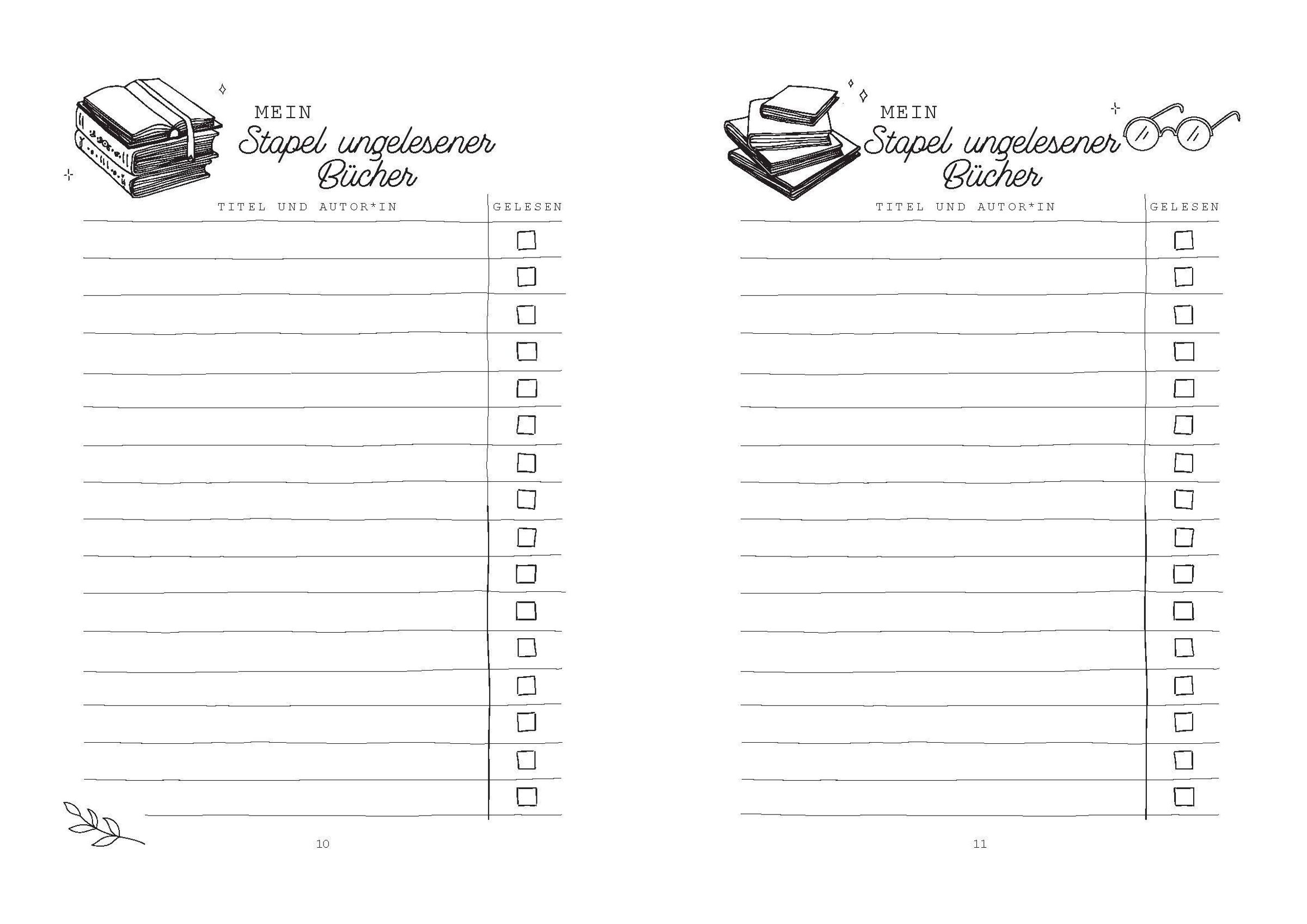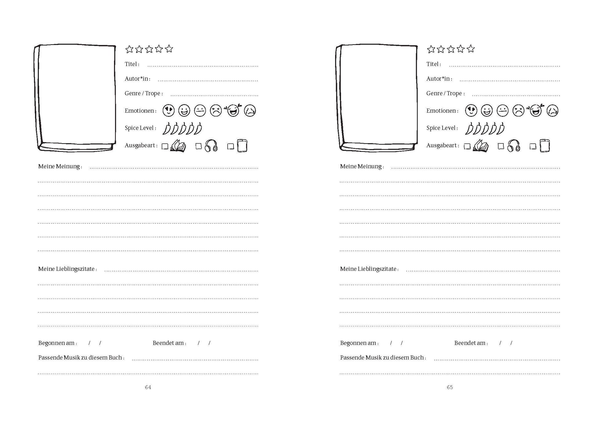 In diesem Lesetagebuch können nicht nur die eigenen Gedanken, Buchkritiken und Annotationen zu 100 Bücher genau notiert werden, es bietet darüber hinaus genügend Platz für Wunschlisten, SuB-Übersicht, Neuerscheinungskalender, eigene Bestseller-Listen und Buchpreise, die man selber vergeben würde, anregende Challenges und vieles mehr. Ein inspirierendes und luftig-leicht gestaltetes Book Journal, in dem die persönlichen Lieblingslektüren den gebührenden Platz finden. Und wer das Eintragebuch personalisieren möchte, kann die Cover der Buch-Favoriten einkleben oder zeichnen und findet in der kleinen Pikto-Thek viele Motive zum Nachzeichnen und individuellen Dekorieren.