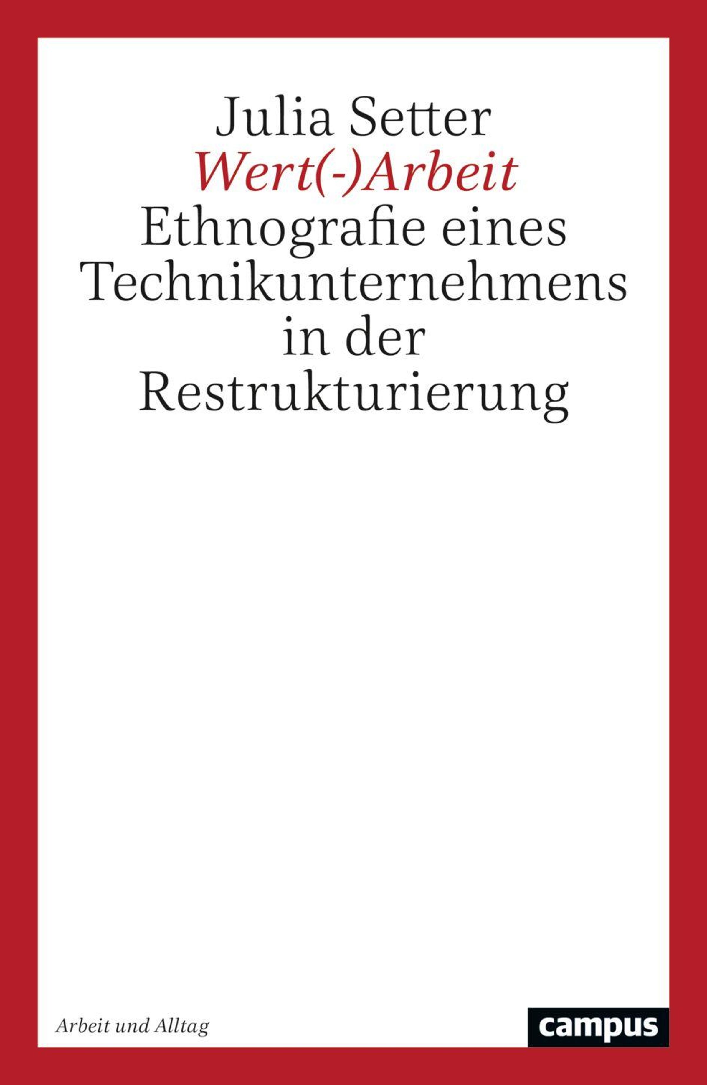 „Julia Setter, Wert(-)Arbeit: Ethnografie eines Technikunternehmens in der Restrukturierung“. Roter Rahmen, Campus-Logo., Buch