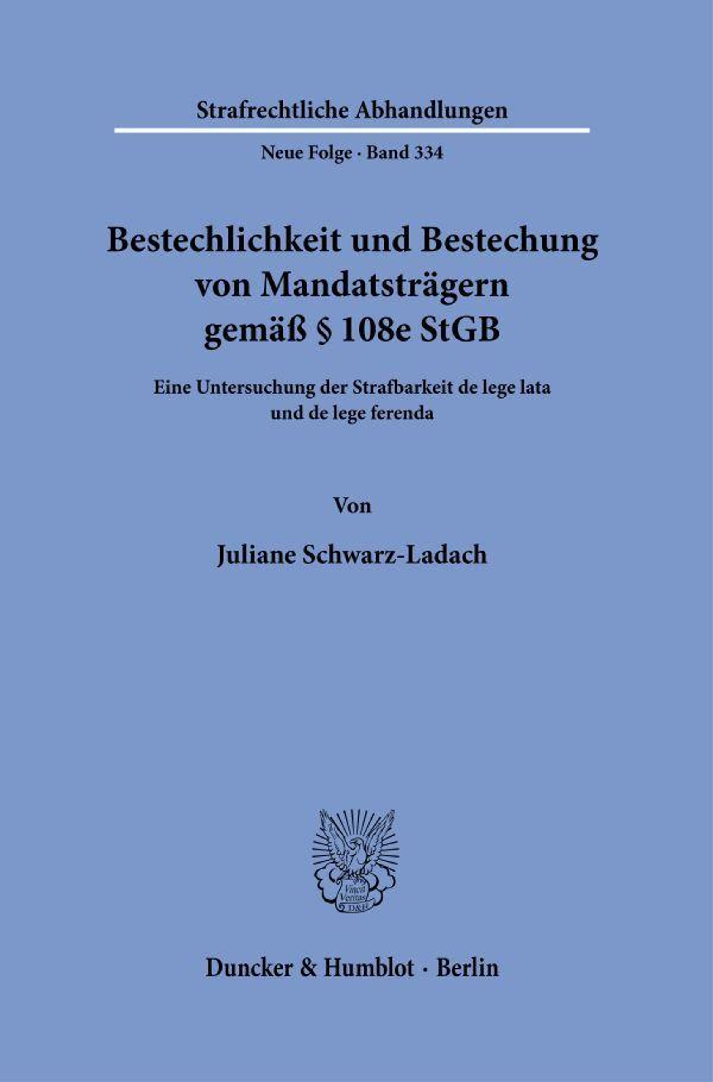 'Passive and Active Corruption of Elected Officials pursuant to Section 108e of the German Criminal Code (StGB). An Analysis of Criminal Liability de lege lata and de lege ferenda, with Special Consideration of Section 108f of the German Criminal Code (StGB)': This thesis examines the active and passive corruption of elected officials under § 108e of the German Criminal Code (StGB). After reviewing its historical development, it provides a detailed analysis of the current statute, incorporating relevant primary law. Finally, the thesis proposes reforms and offers a critical assessment of the new § 108f StGB, introduced in 2024.