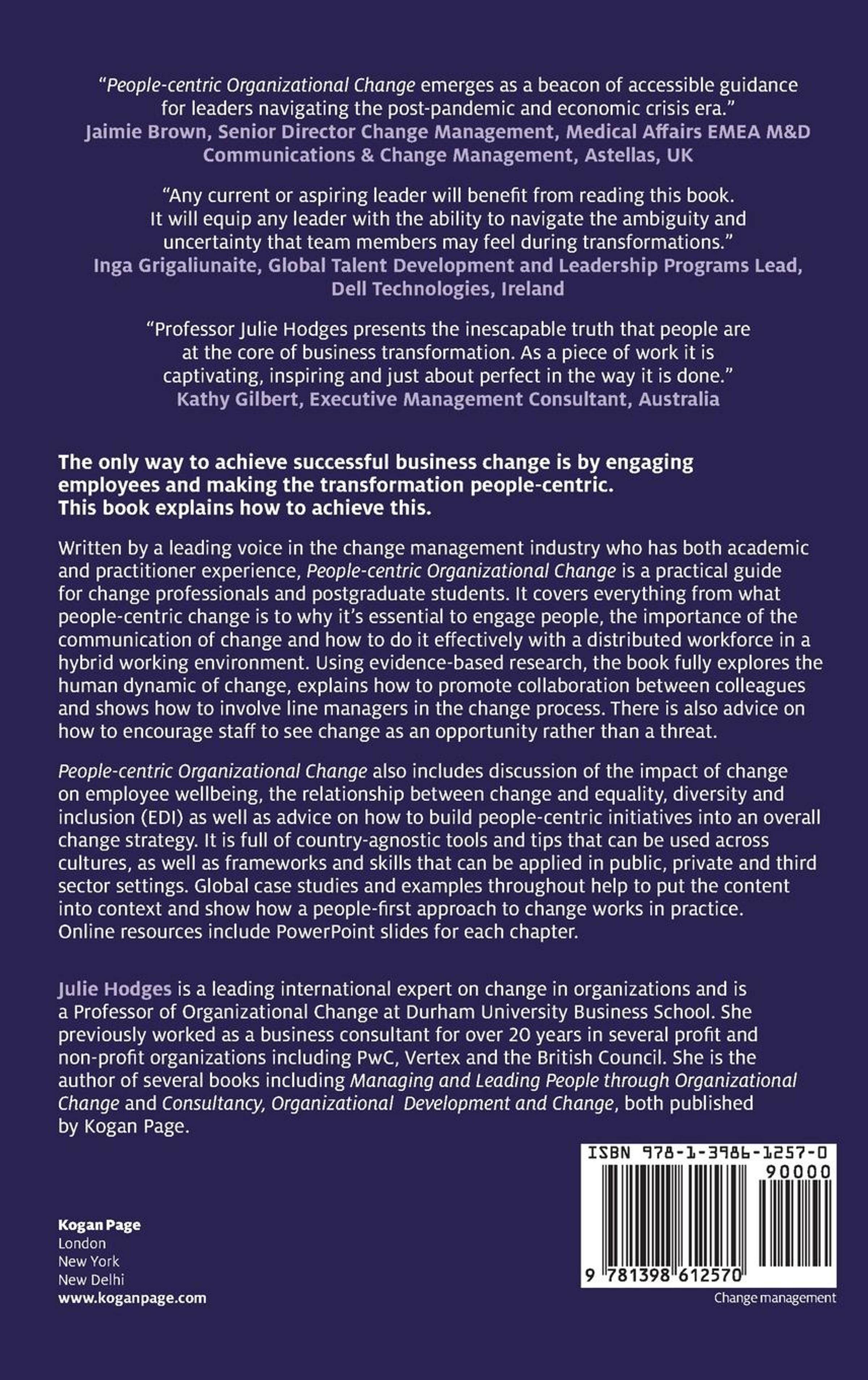 The only way to achieve successful business change is by engaging employees and making the transformation people-centric. This book explains how to achieve this. Written by a leading voice in the change management industry who has both academic and practitioner experience, People-Centric Organizational Change is a practical guide for change professionals and postgraduate students. It covers everything from what people-centric change is and why it's essential to engage people with the change through to the importance of the communication of change and how to do this effectively with a distributed workforce in a hybrid working environment. Using evidence-based research, this book fully explores the human dynamic of change, explains how to promote collaboration between colleagues and shows how to involve line managers in the change process. There is also advice on how to encourage staff to see change as an opportunity rather than a threat. People-Centric Organizational Change also includes discussion of the impact of change on employee wellbeing as well as the relationship between Equality, Diversity and Inclusion (EDI) and change. There is also advice on how to build people-centric initiatives into an overall change strategy. It is full of country agnostic tools and tips that can be used across cultures as well as frameworks and skills that can be applied in public, private and third sector settings. Global case studies and examples throughout help to put the content into context and show how a people-first approach to change works in practice. Online resources include PowerPoint slides for each chapter.