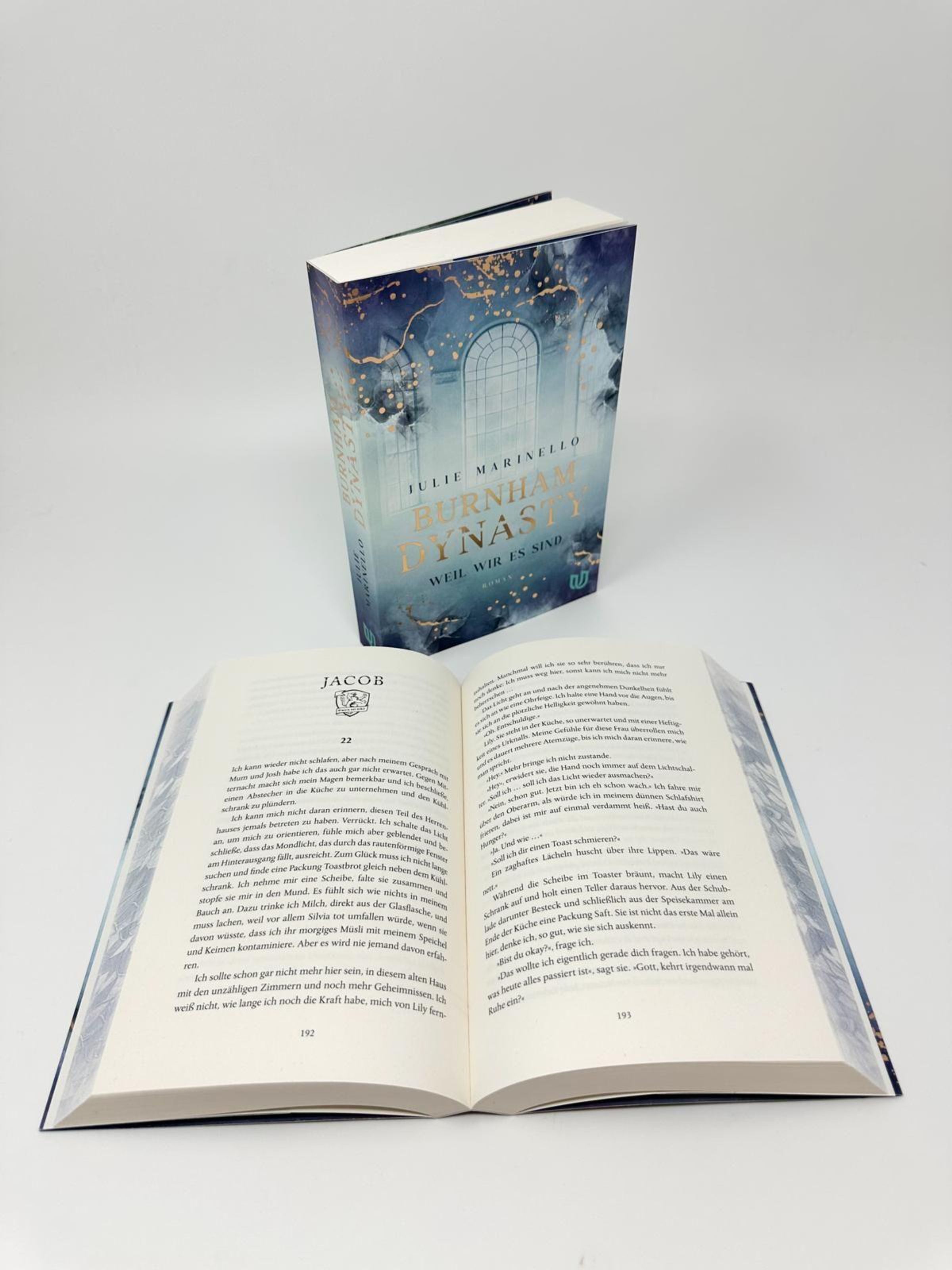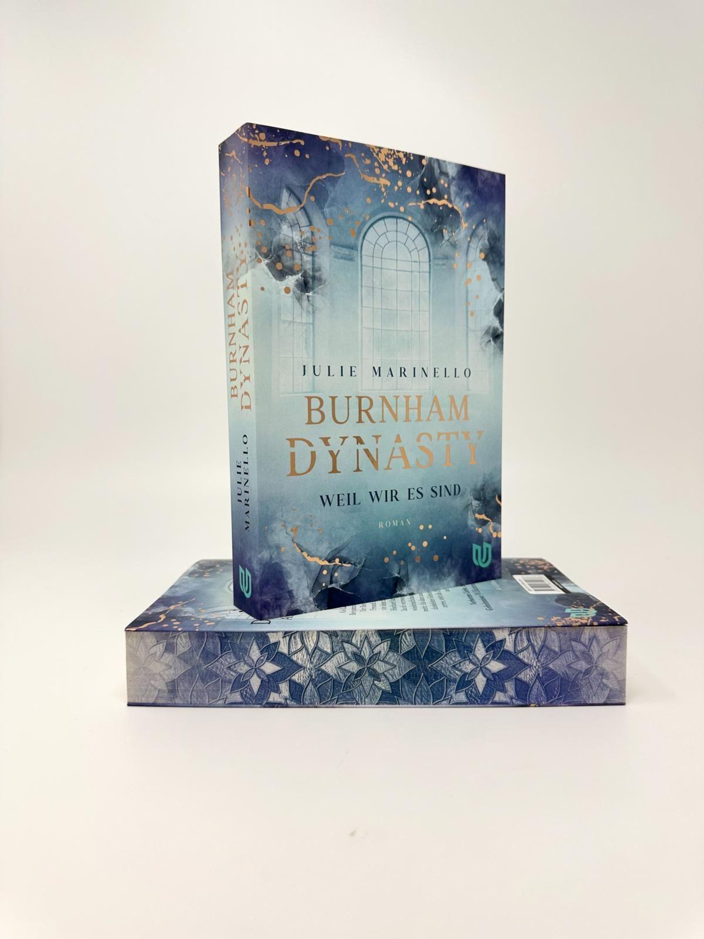 "JULIE MARINELLO BURNHAM DYNASTY WEIL WIR ES SIND ROMAN." Im Hintergrund große Fenster, zarte Farben und ein Wappen., Buch